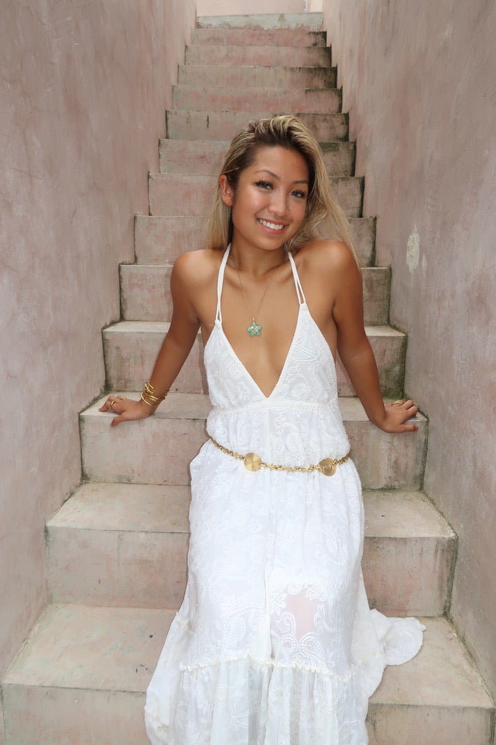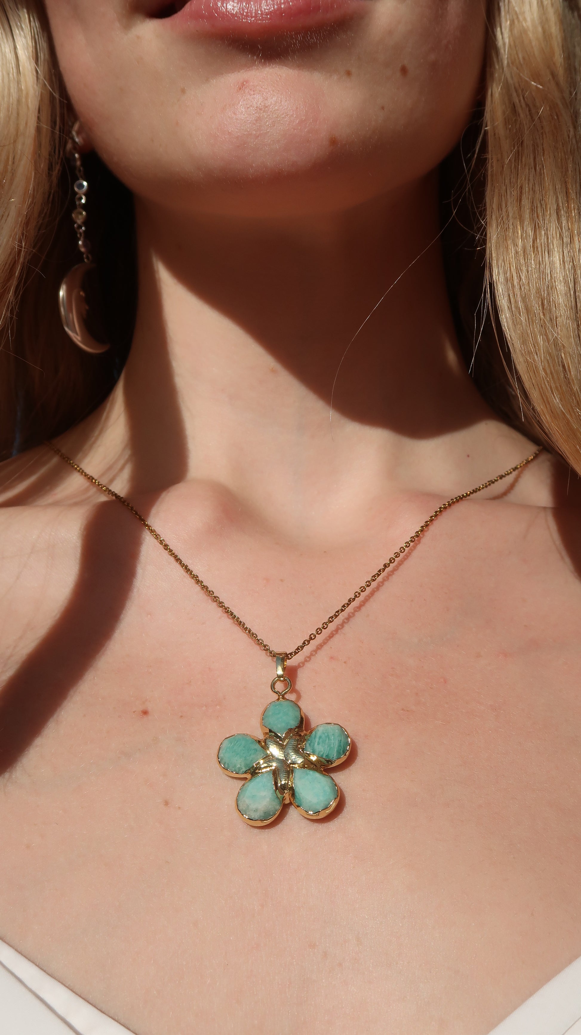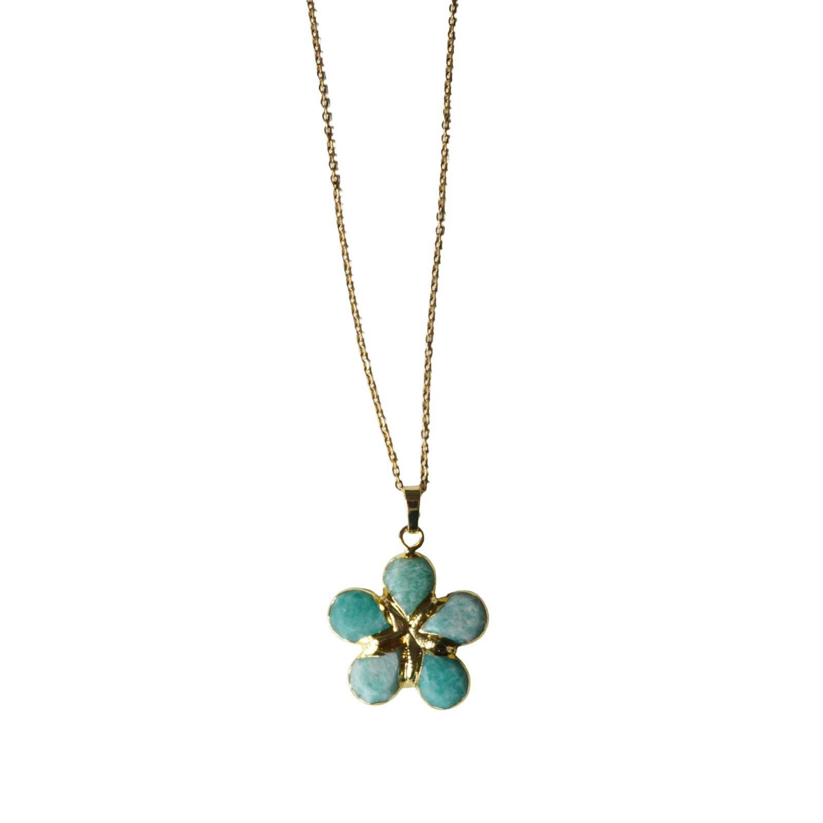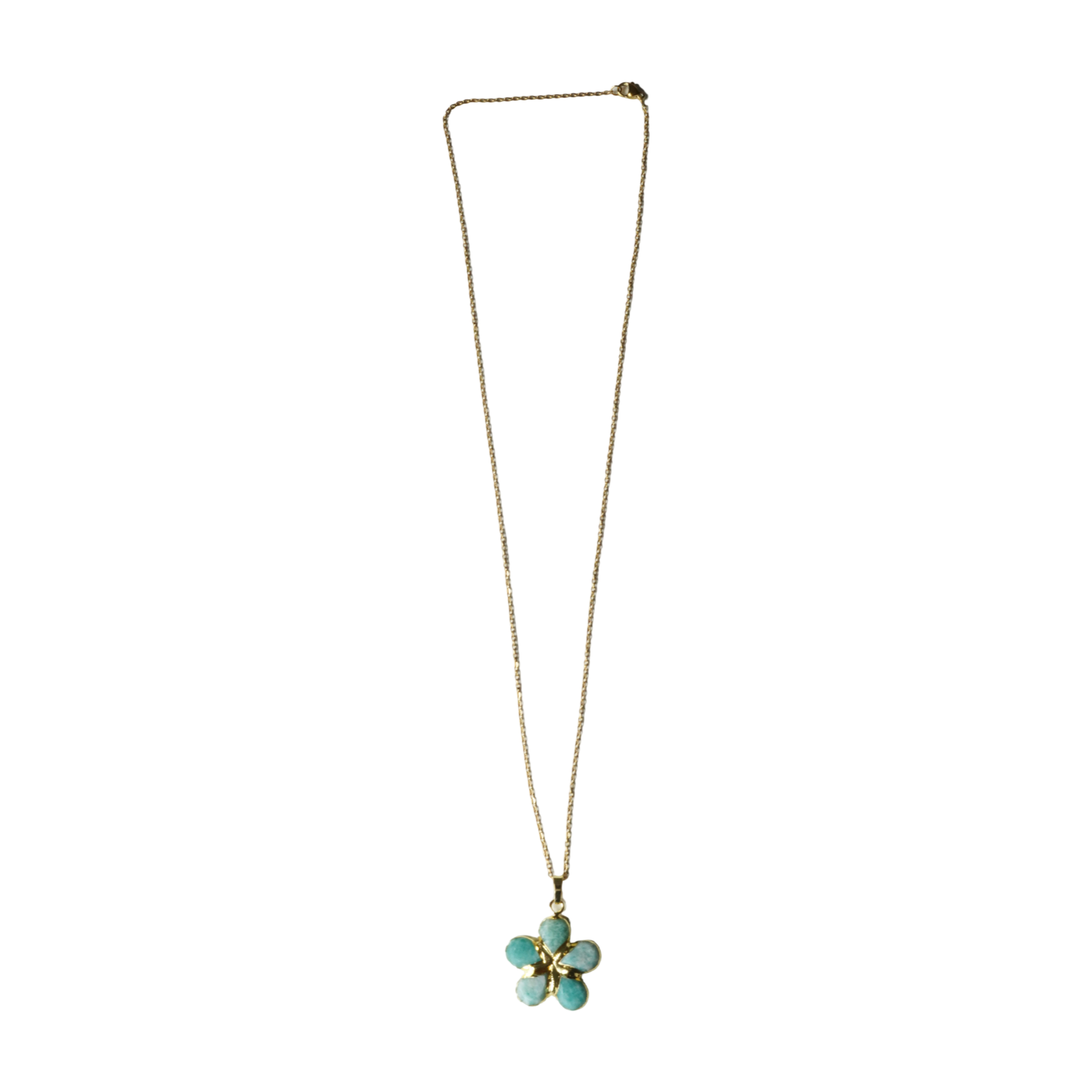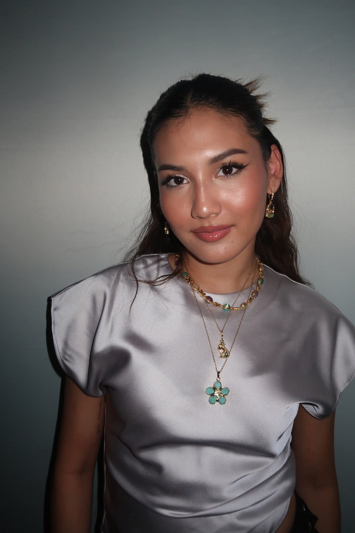 Aashni’s flower pendant necklace is a flower shaped pendant made up of bright blue-green stones. This is the perfect necklace to layer or wear on its own as a statement piece.