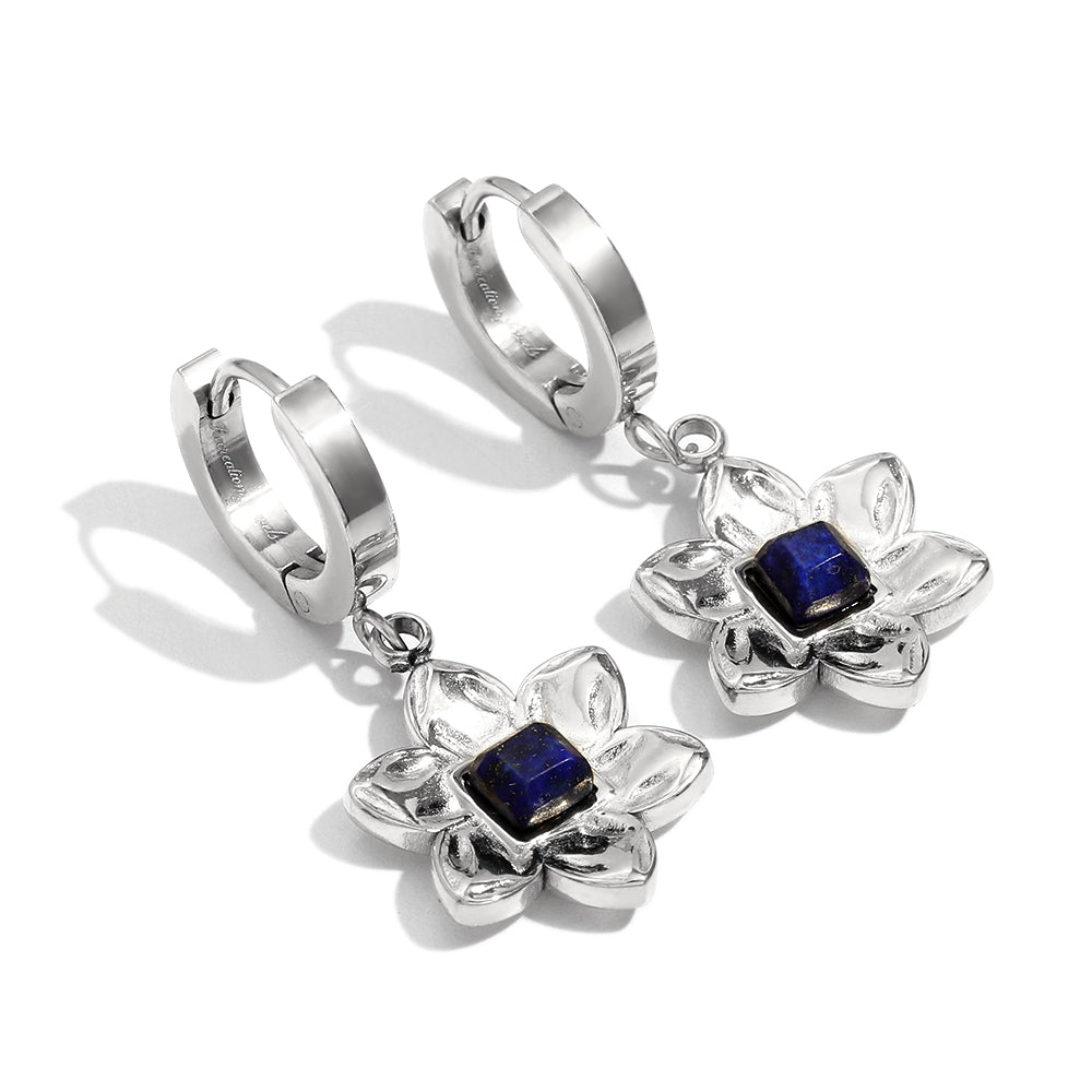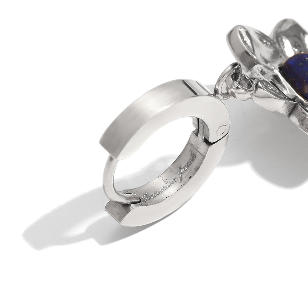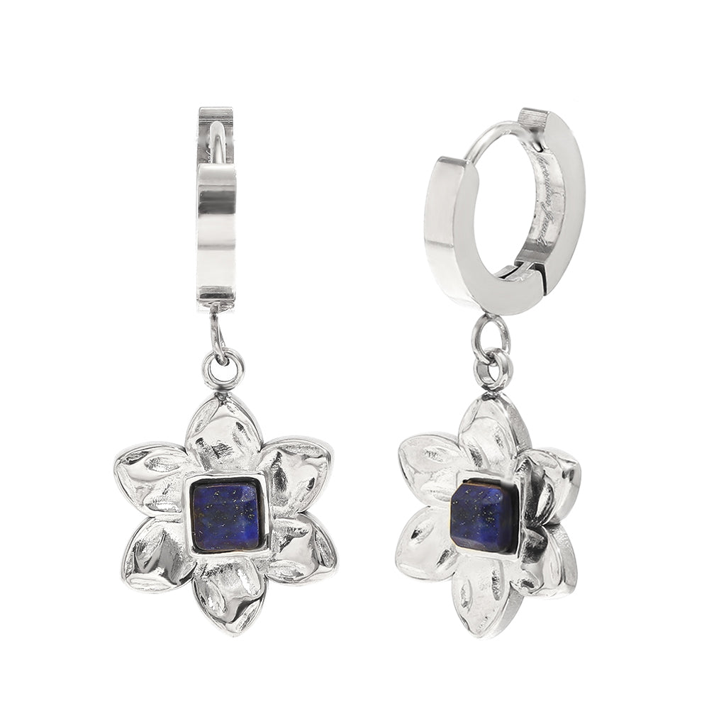 Alexandra's flower earrings in silver are small hoop earrings with dangly flower shaped charms with navy blue stones at the center. These simple and elegant earrings can complement any look.