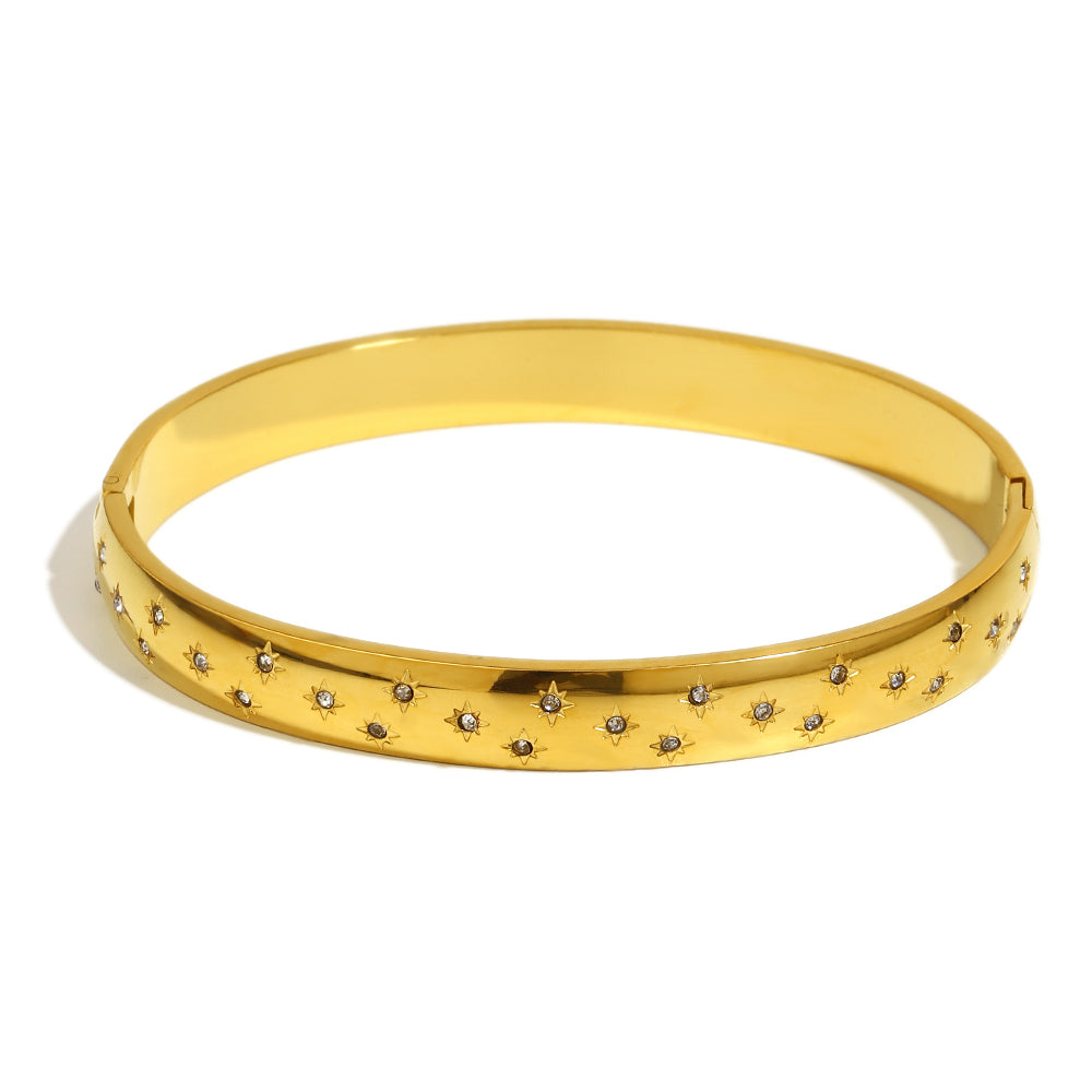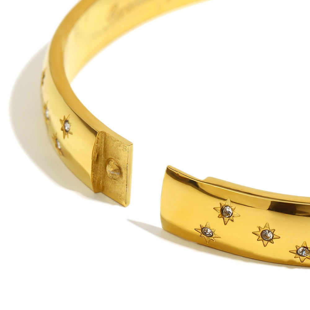 Alexandria's starry bangle is a thick gold bangle with white stars. This bangle clasps shut for an elegant finish.