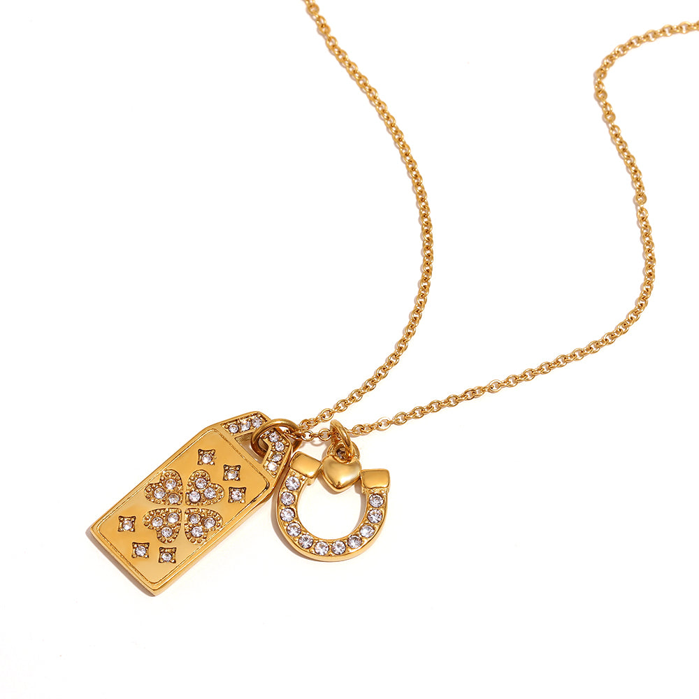 Allegra’s Lucky Charm Necklace features two gold charms on a fine chain — a crystal horseshoe and a tag with a four-leaf clover design. A subtle piece designed to bring luck and positive energy to the wearer.