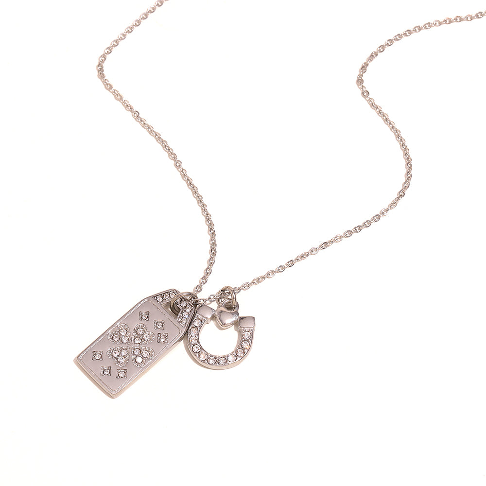 Allegra’s Lucky Charm Necklace features two silver charms on a fine chain — a crystal horseshoe and a tag with a four-leaf clover design. A subtle piece designed to bring luck and positive energy to the wearer. Crafted from 316l stainless steel, this necklace is waterproof and hypoallergenic, perfect for everyday wear.