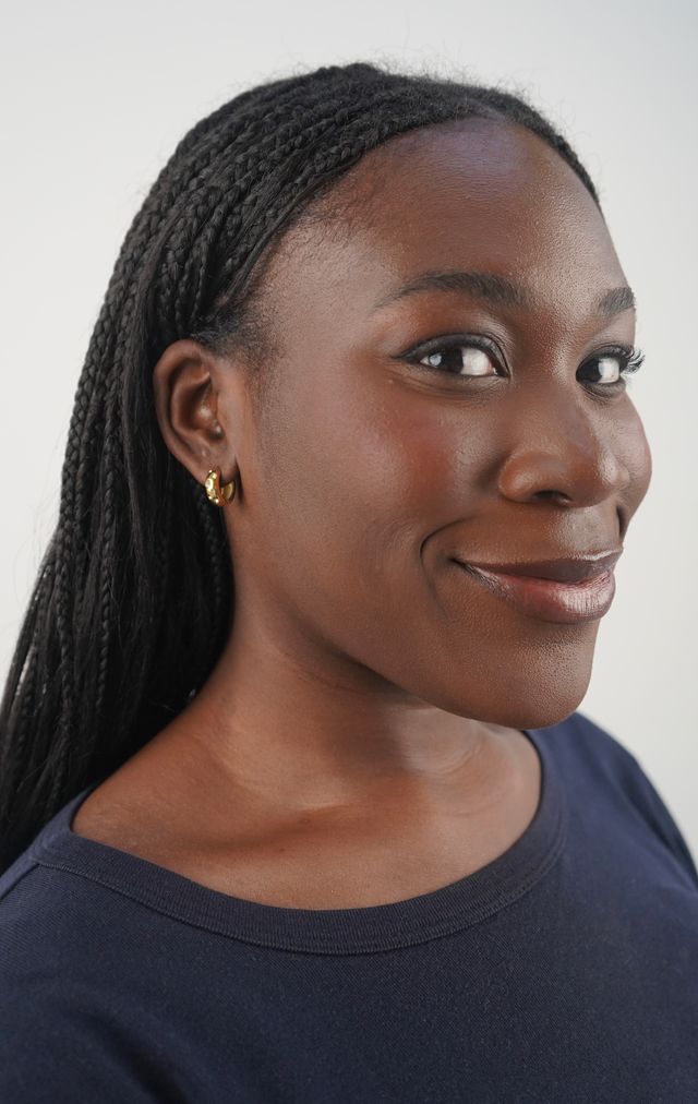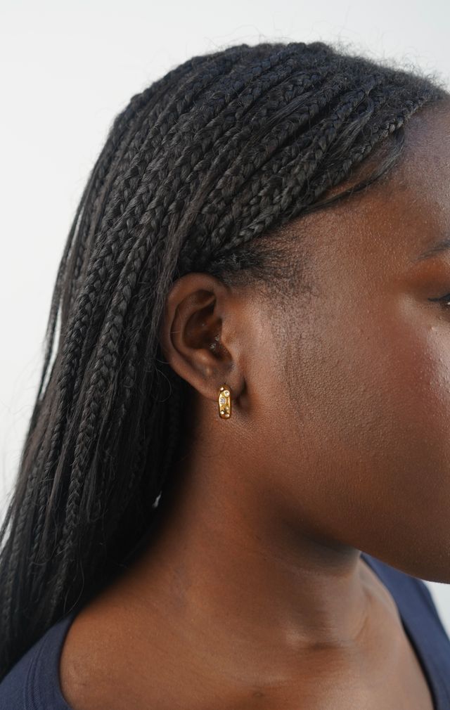 Alyna's white hoops are gold huggie hoops with embedded white gemstones. They are a versatile piece that pairs perfectly with a colorful style or a monochromatic look