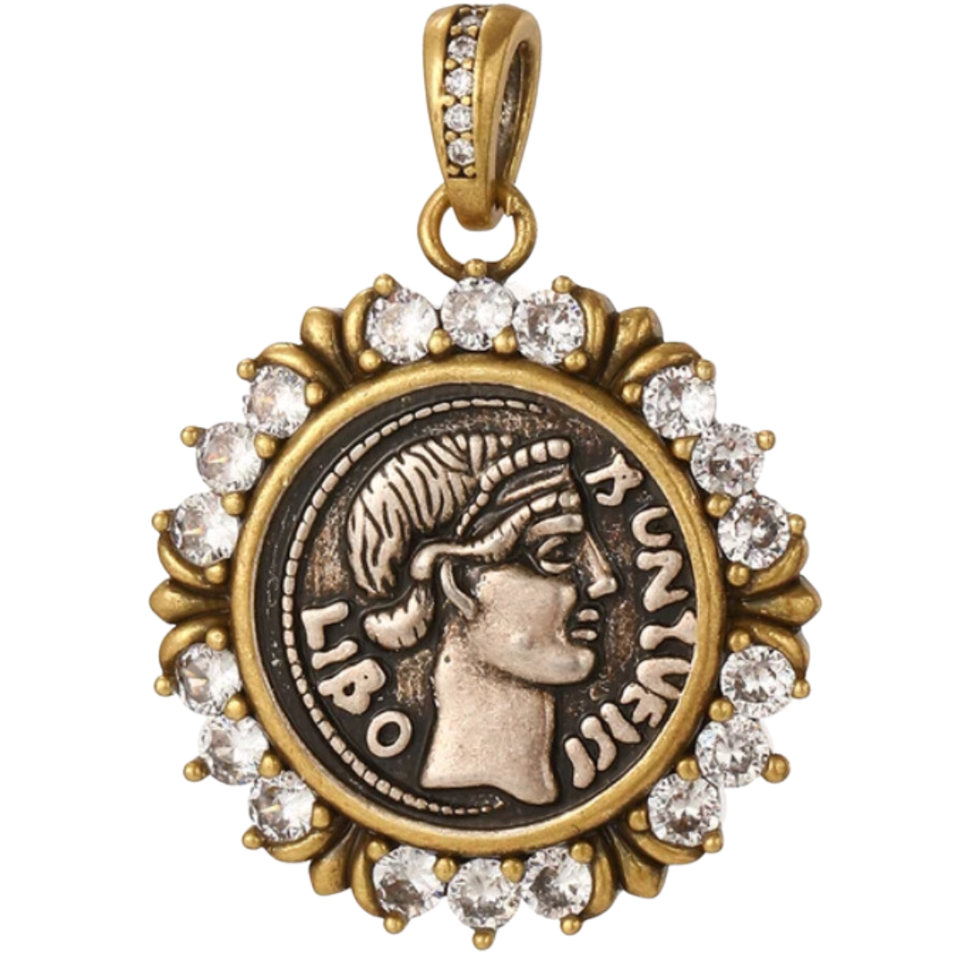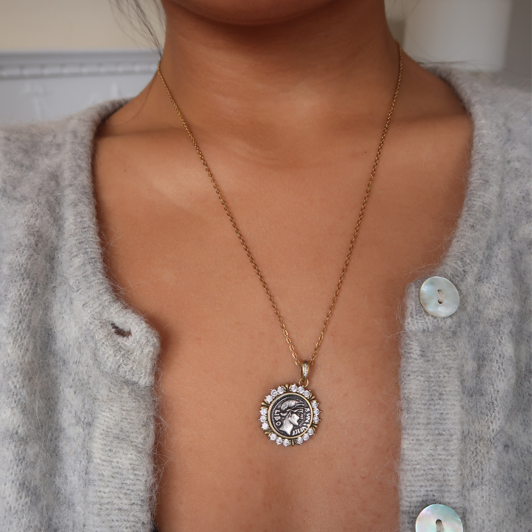 Amelia's Coin Necklace is a pendant necklace inspired by a vintage coin accented by a border of radiant white gemstones. This piece is perfect for layering or worn on its own as a simple yet elegant statement piece.