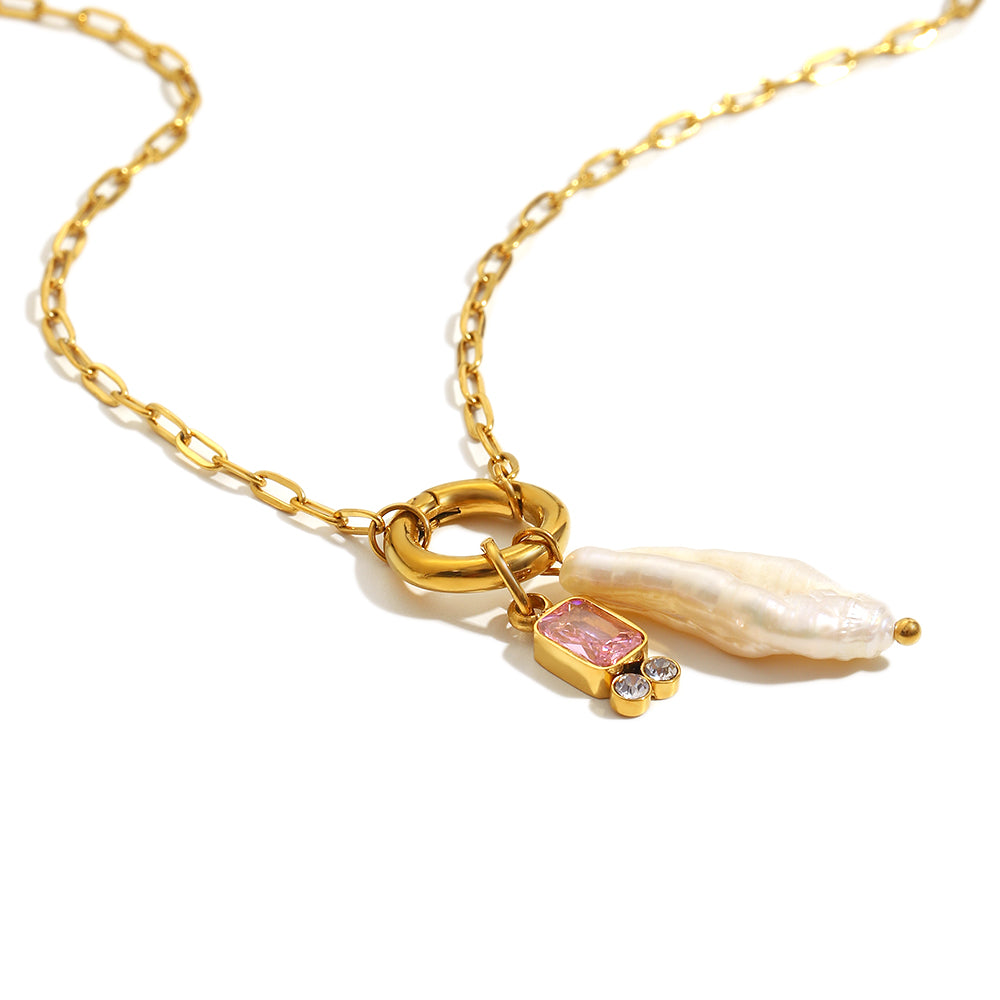Amelie's Pearl Charm Necklace in Pink is a gold pendant necklace with a long mother of pearl charm paired with a bright pink gemstone charm. This is the perfect dainty necklace to add to any outfit.