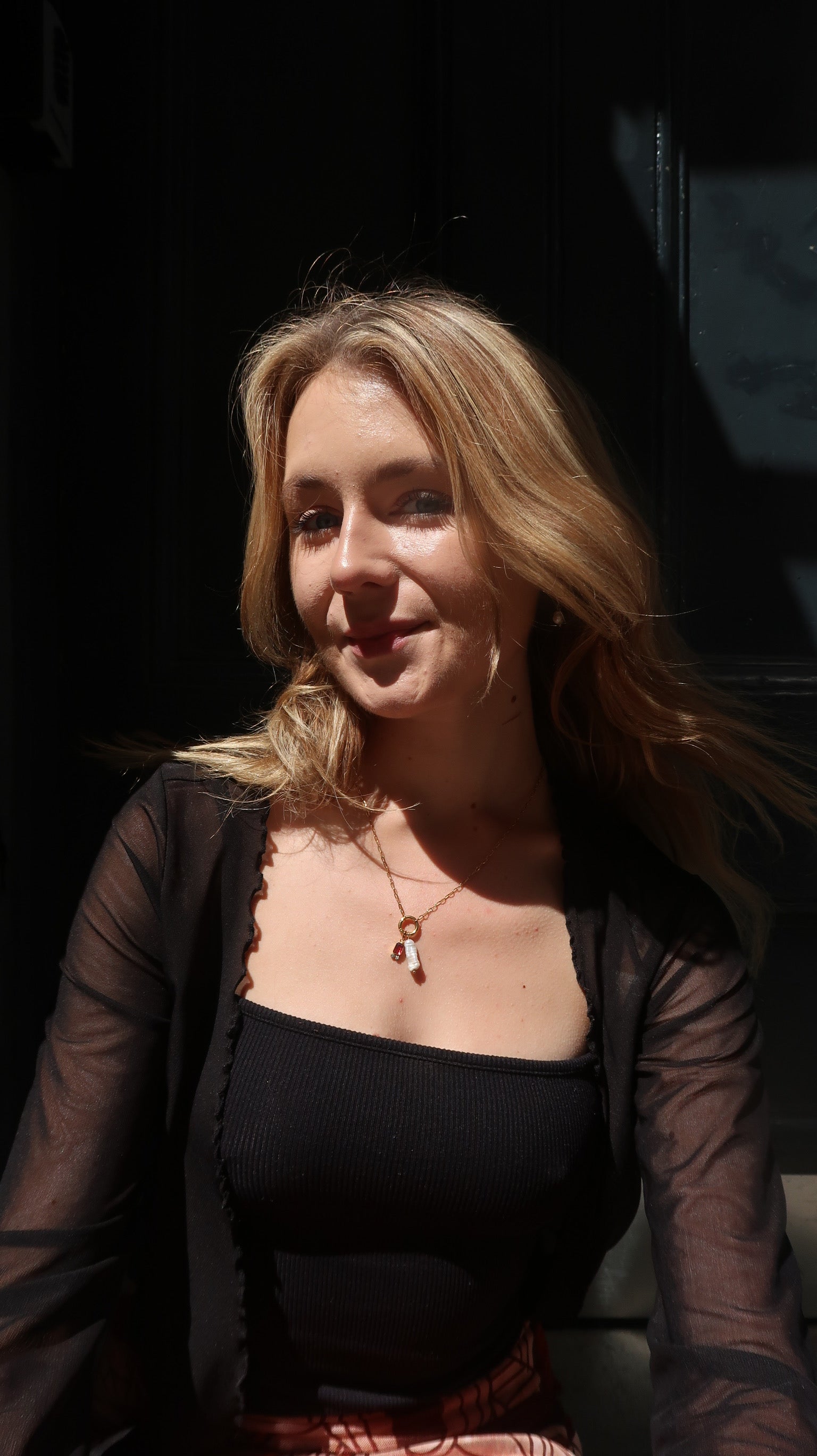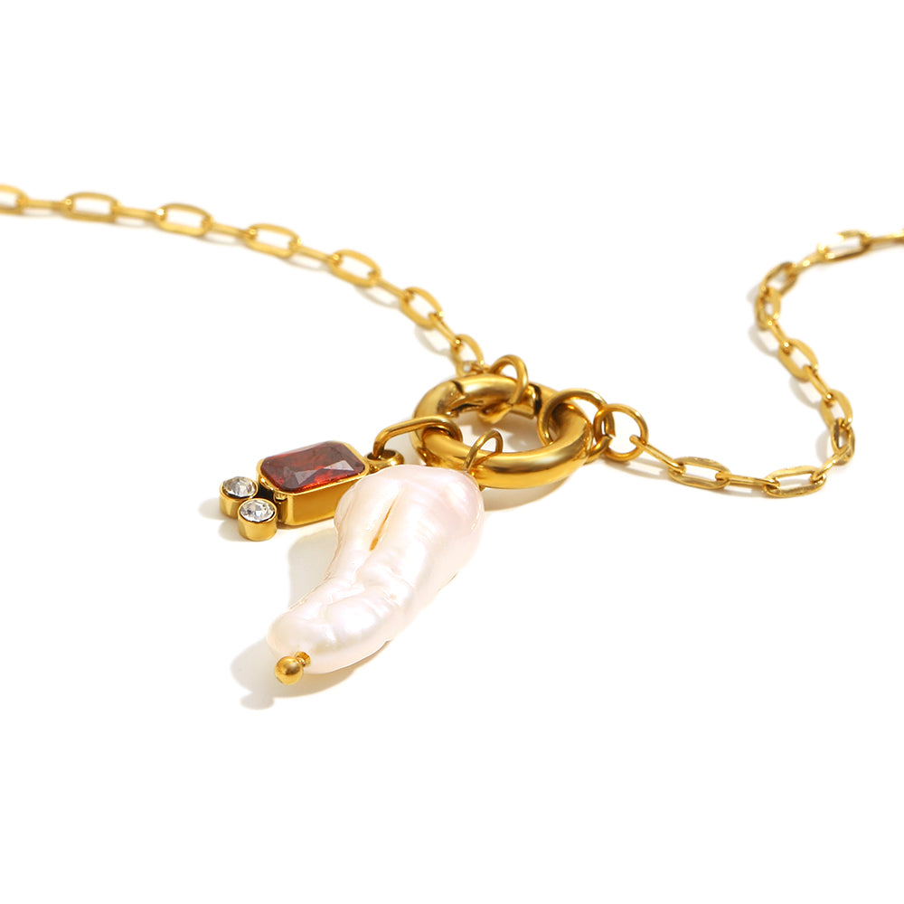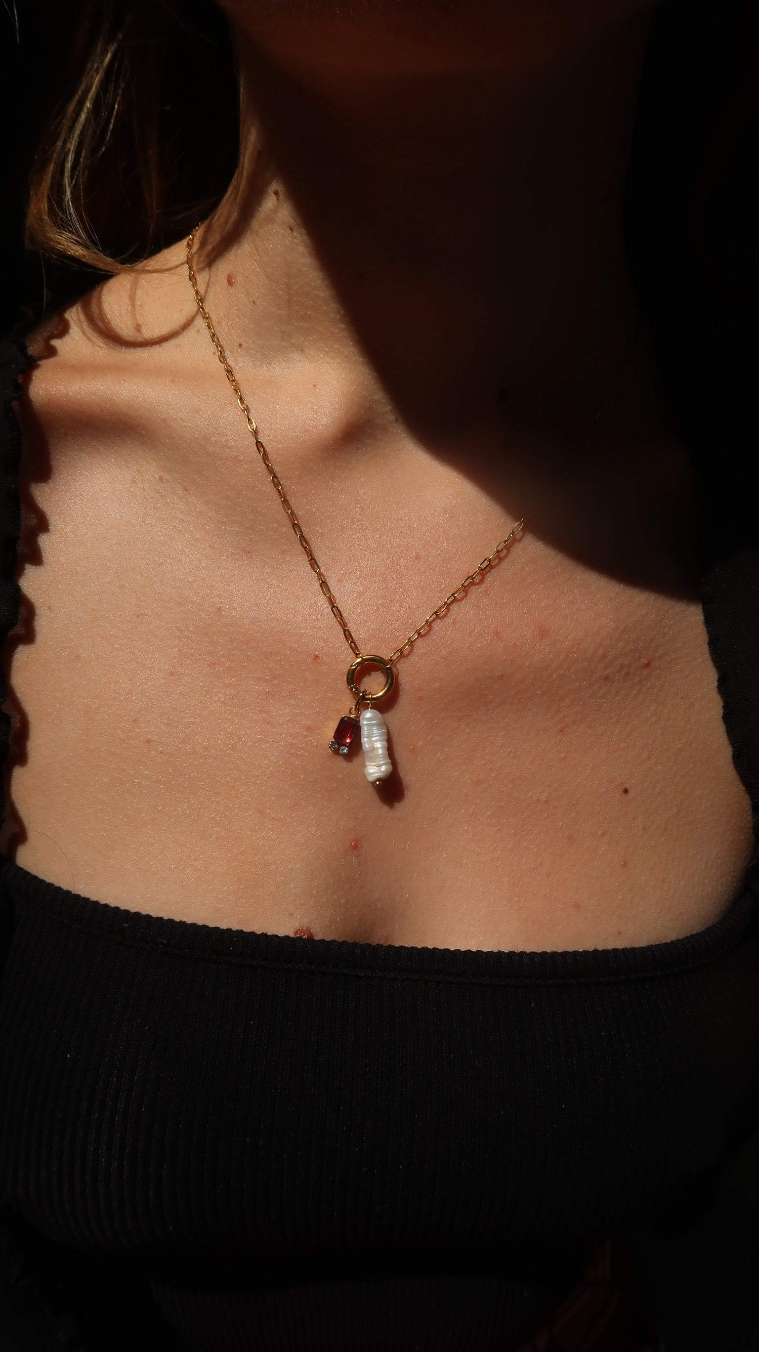 Amelie's Pearl Charm Necklace in Red is a gold pendant necklace with a long mother of pearl charm paired with a bright red gemstone charm. This is the perfect dainty necklace to add to any outfit.