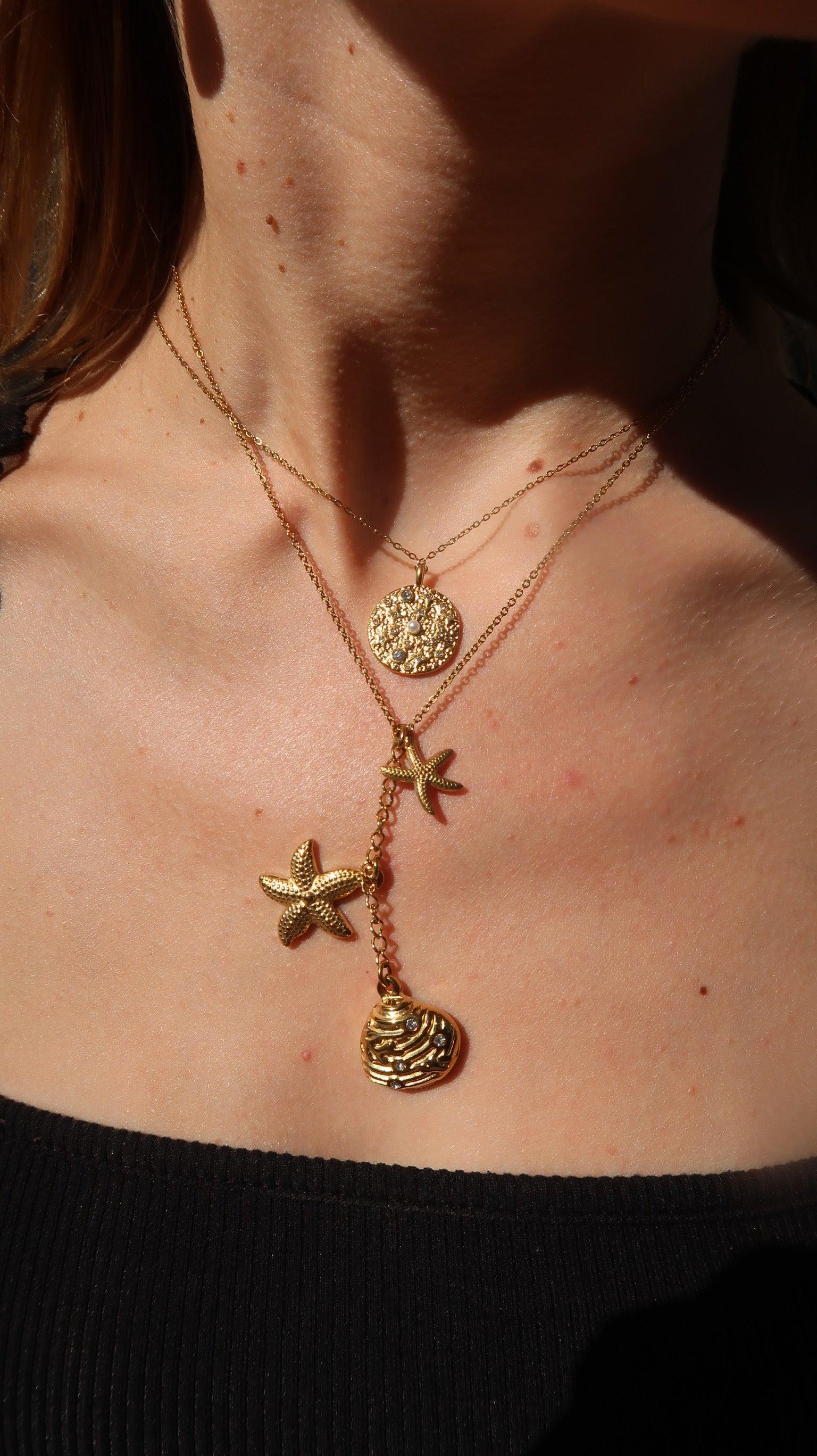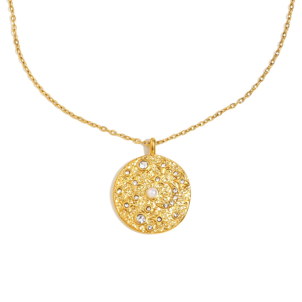 Andromeda's starry necklace is a small gold pendant necklace with gem and pearl detailing in moon and star shapes.