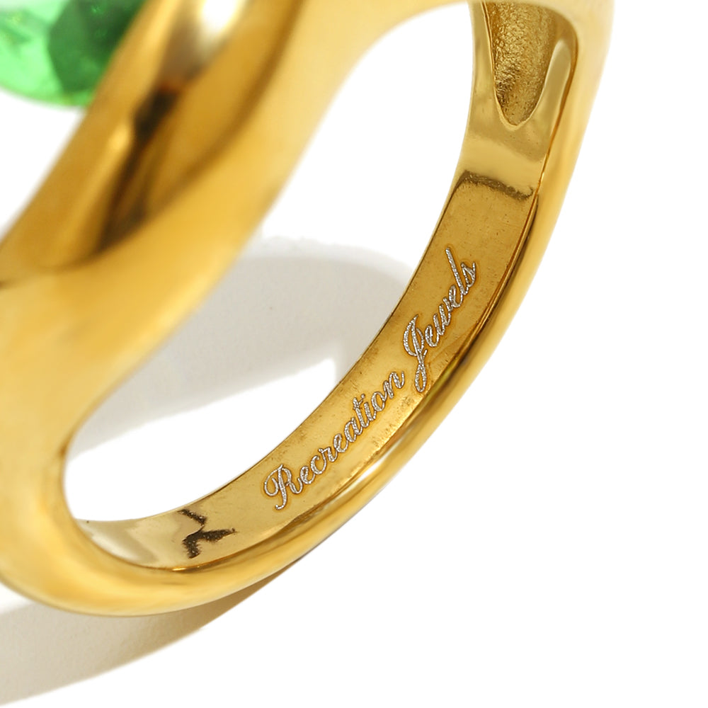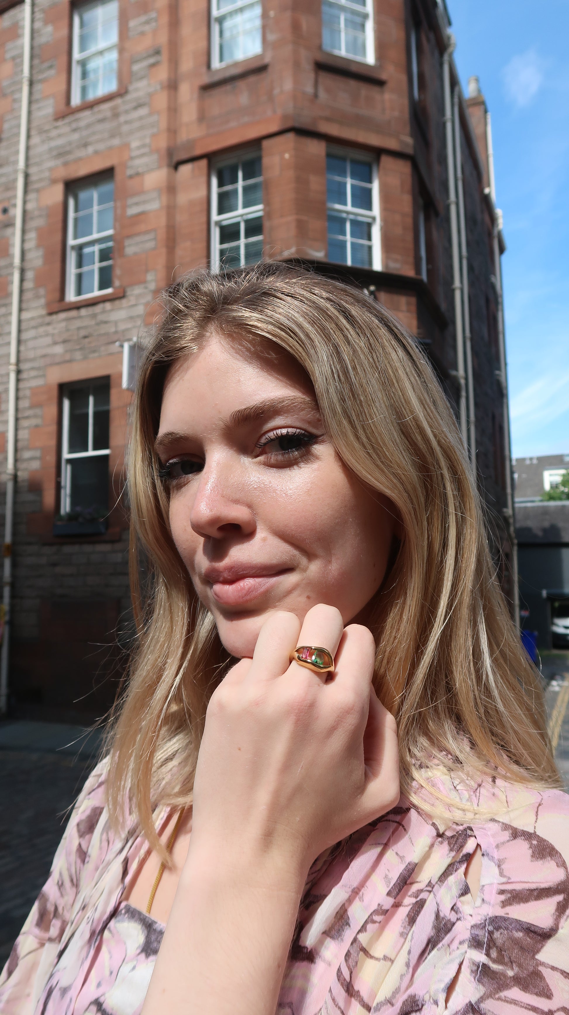 Angelina's gemstone ring is a chunky gold ring featuring a bright red oval gemstone and rectangular pink gemstone in a sculptural gold setting. This maximalist ring makes the perfect statement piece.