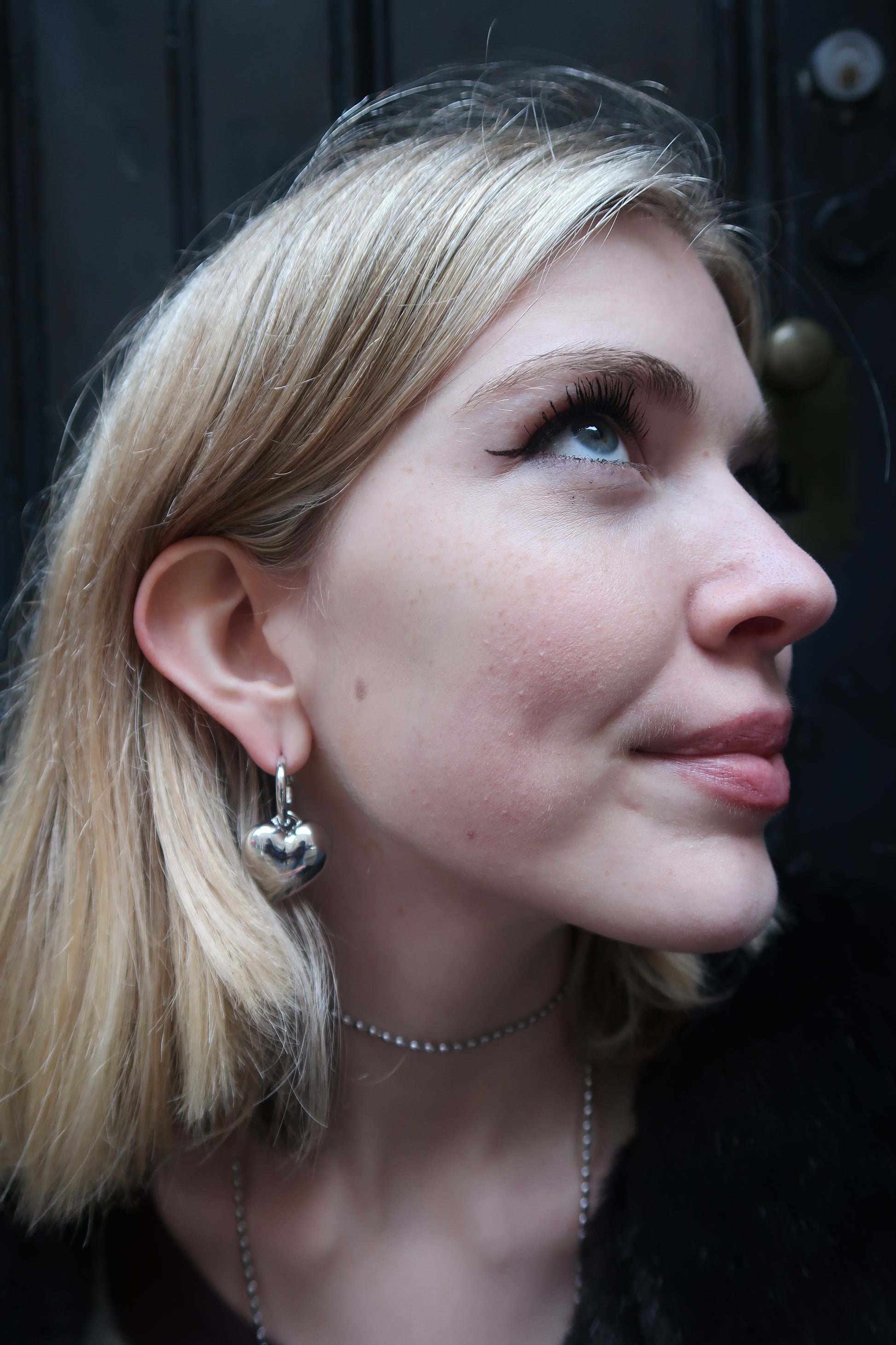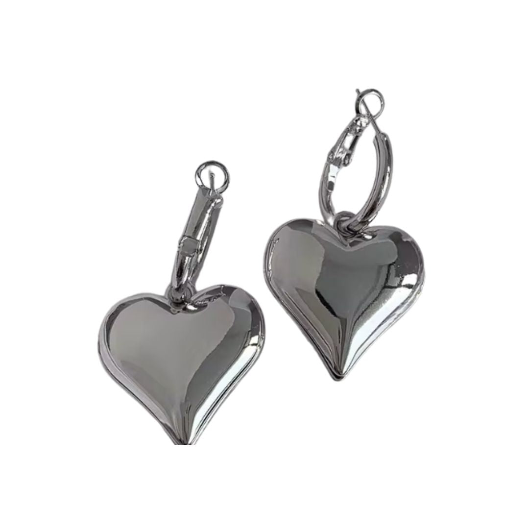 Angel's heart earrings in silver are small hoop earrings with delicate heart-shaped charms that dangle in a polished silver finish.