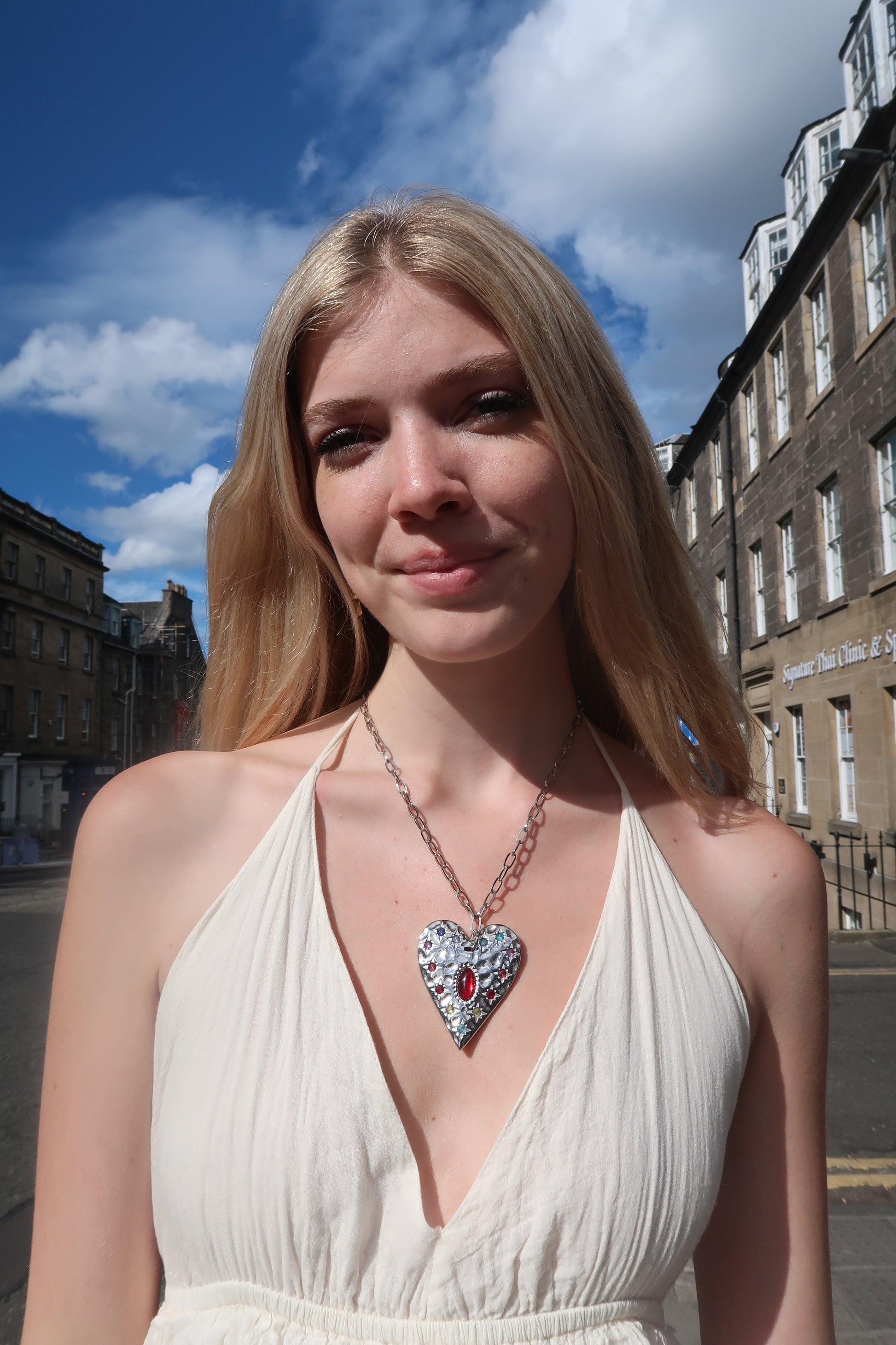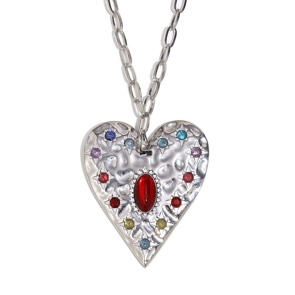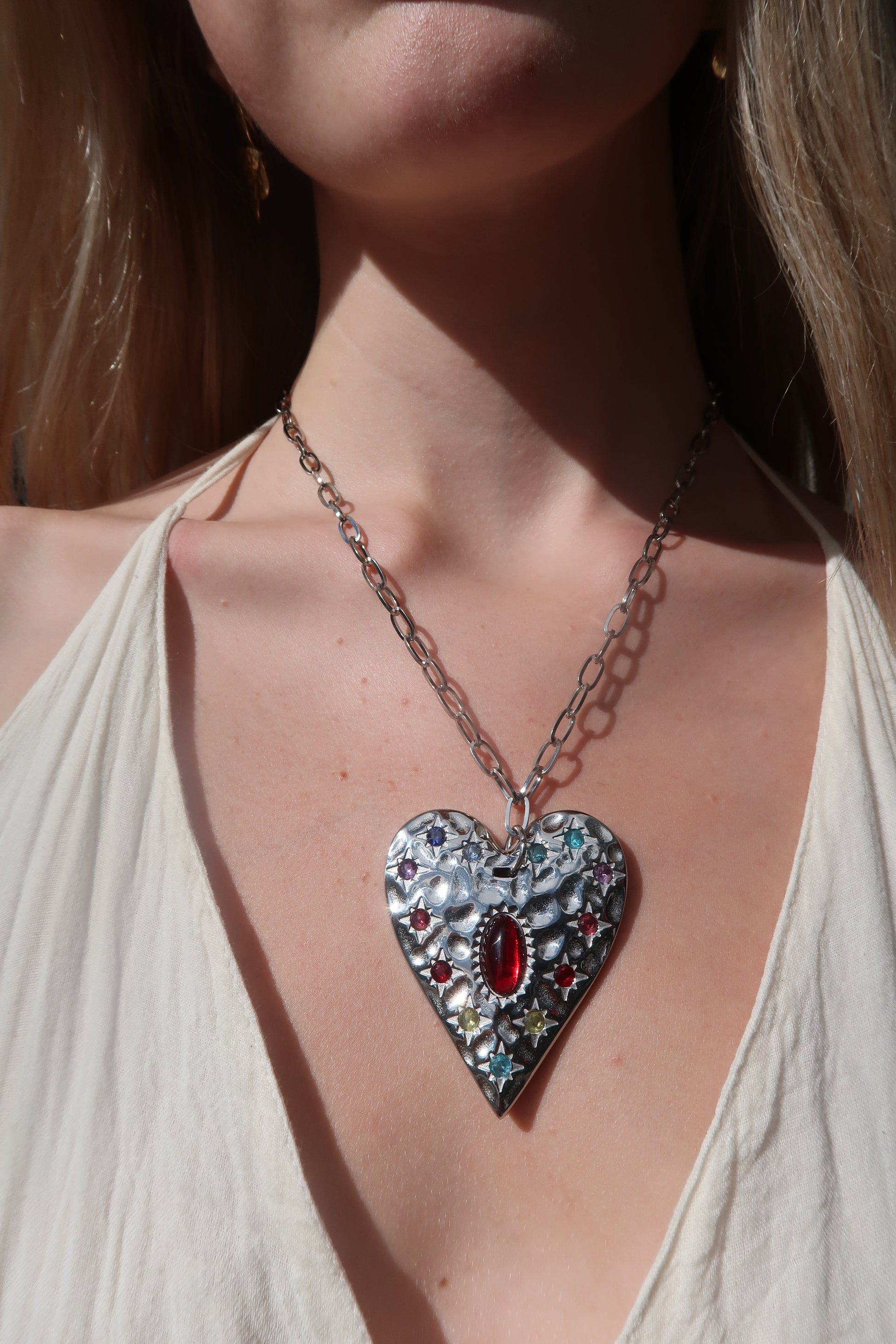 Annetta's heart pendant is a large heart shaped pendant with a bright red stone at the center and multicoloured accents at the edge of the heart. This vintage inspired piece is the perfect maximalist statement piece to complete any look.
