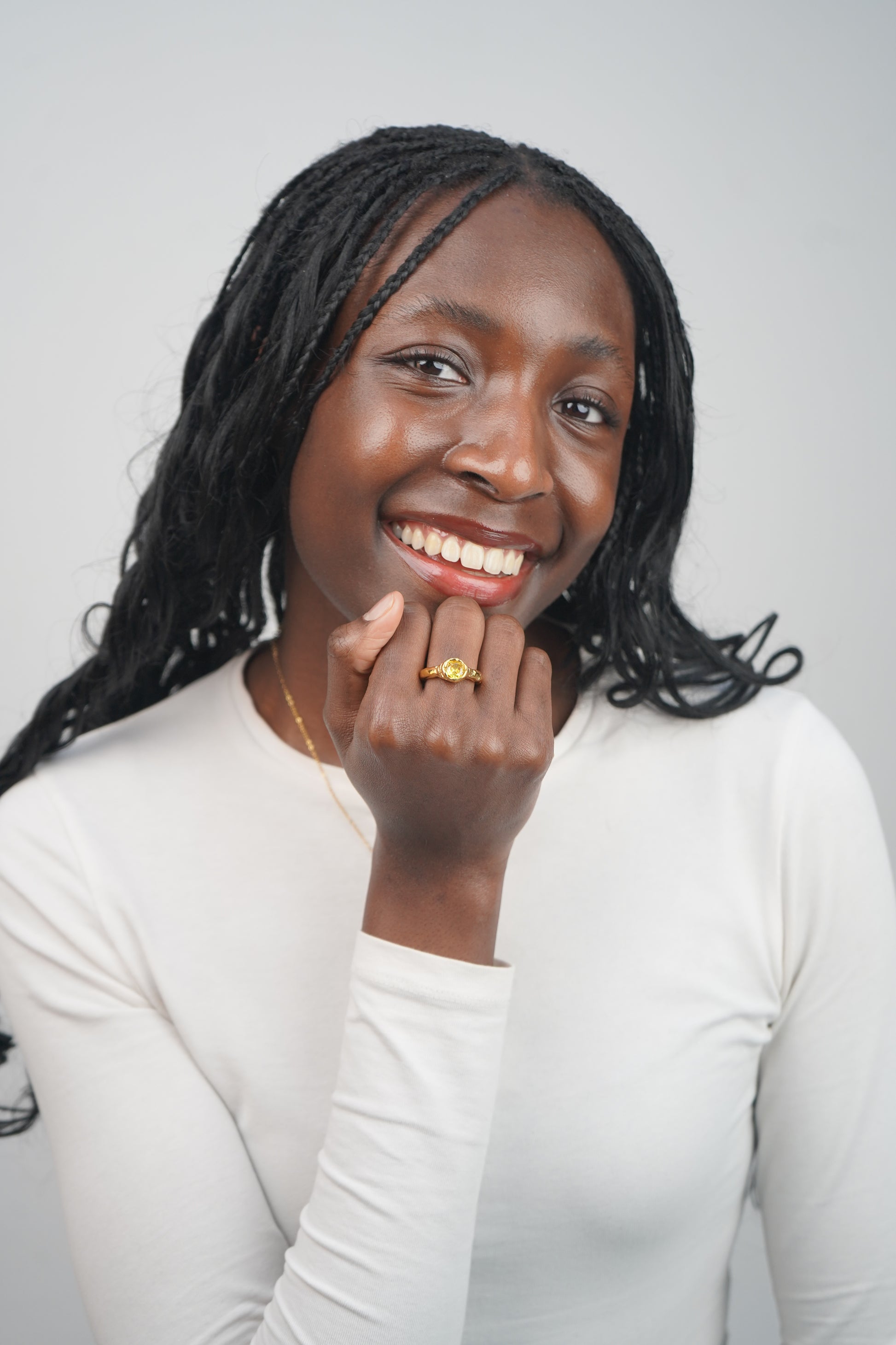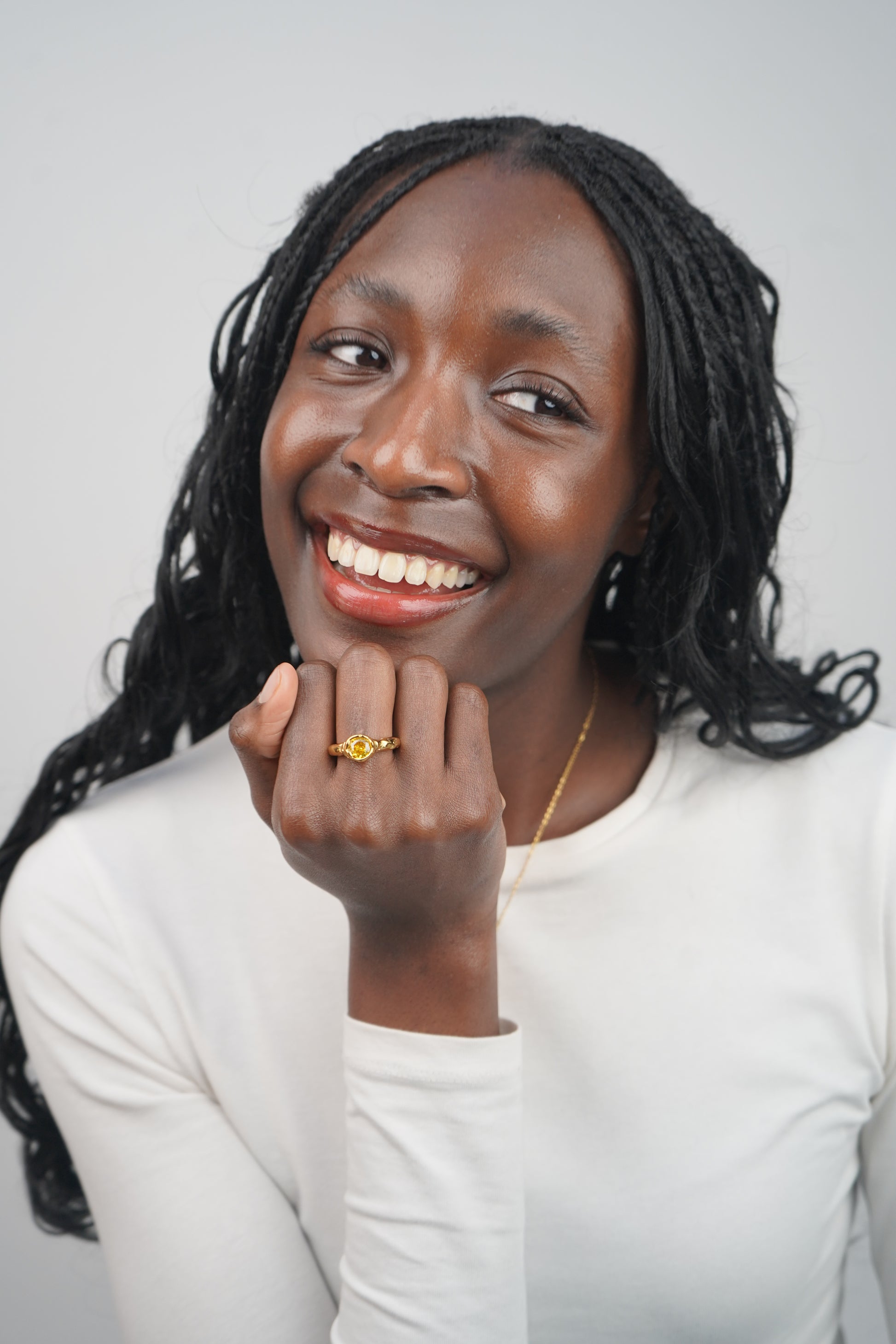 Antonia's amber ring is a vintage inspired ring with a single amber gemstone at the center. This simple yet striking ring is the perfect addition to any look.