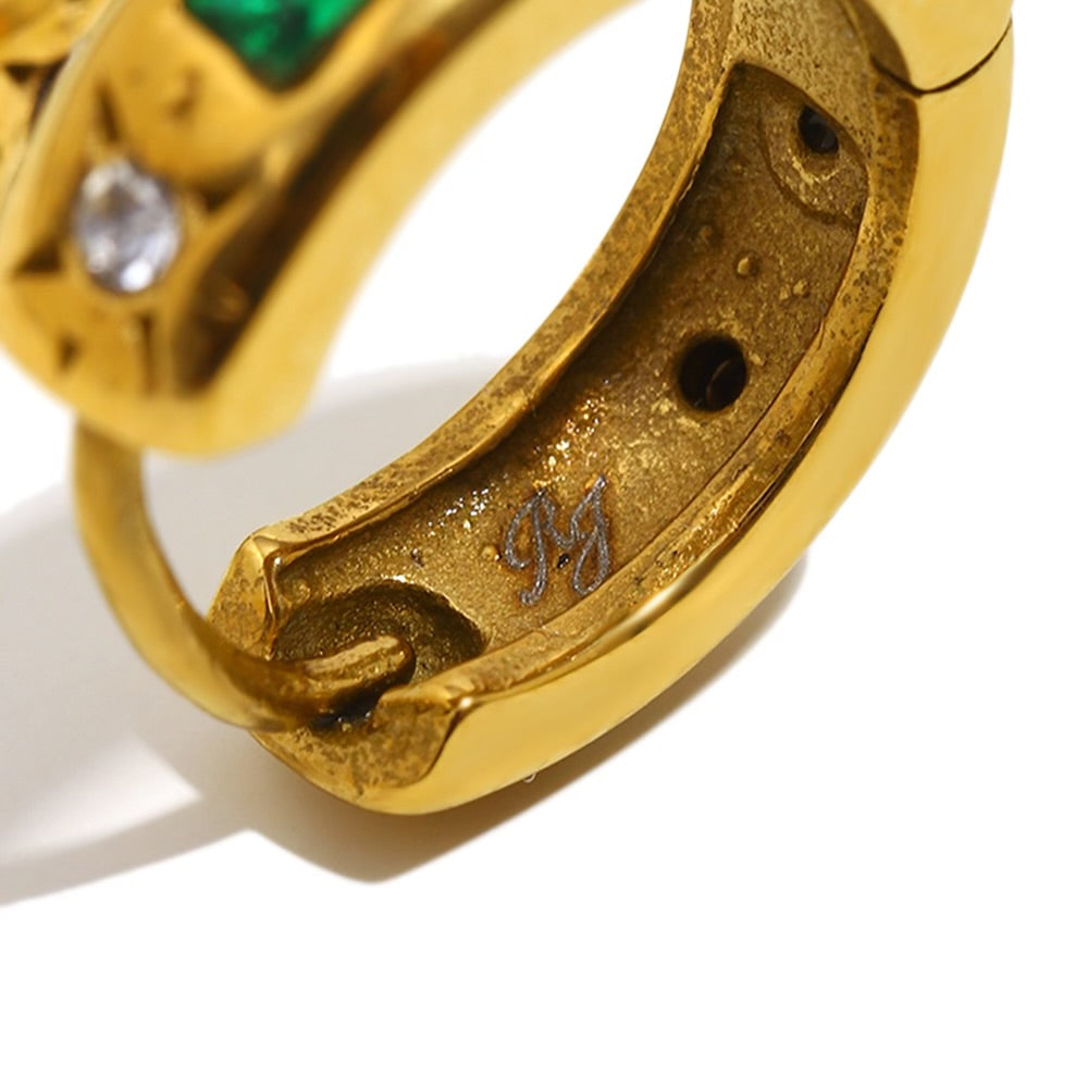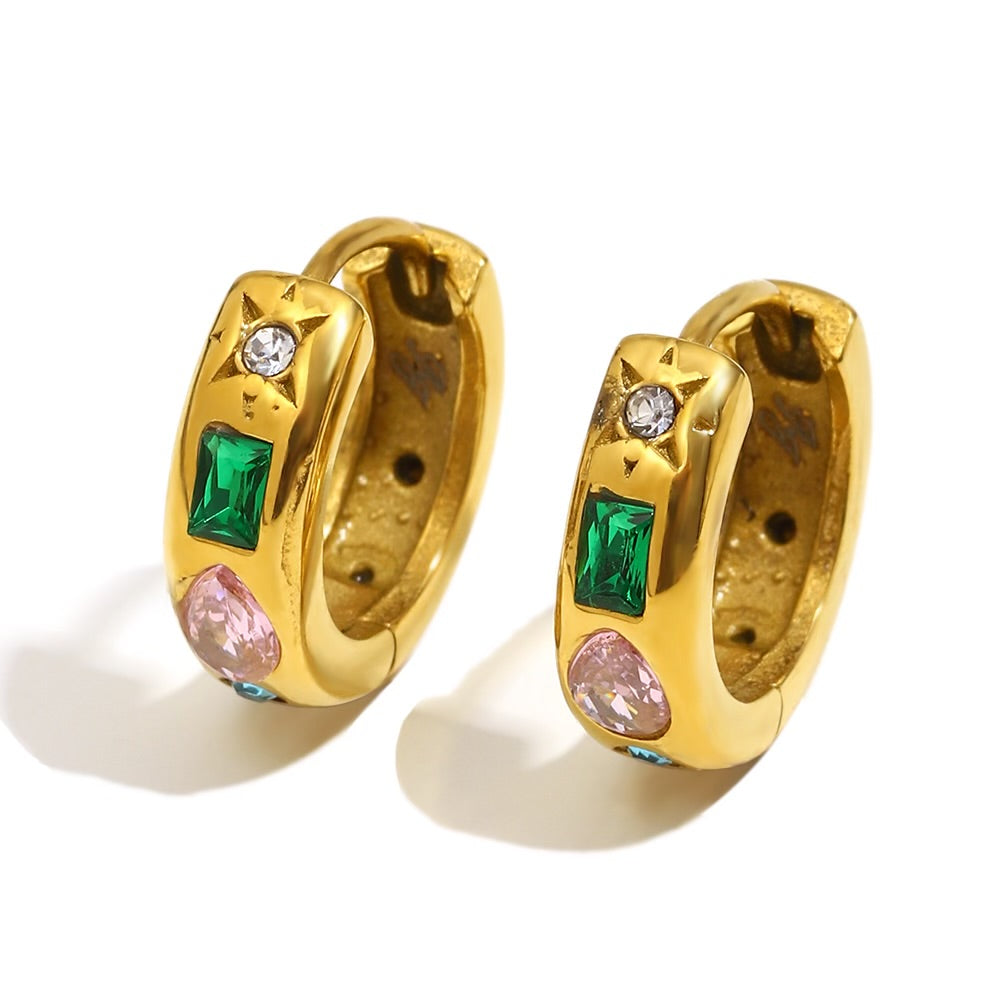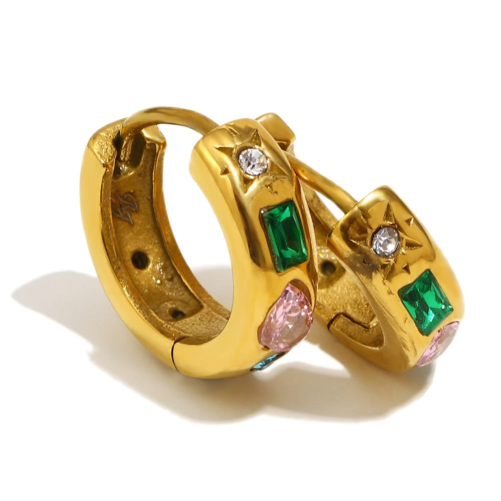 Athena’s multicoloured hoops are small huggie earrings with pink, green, blue, and clear gemstones of different shapes and sizes. These simple yet colourful earrings make the perfect daily staple earrings.