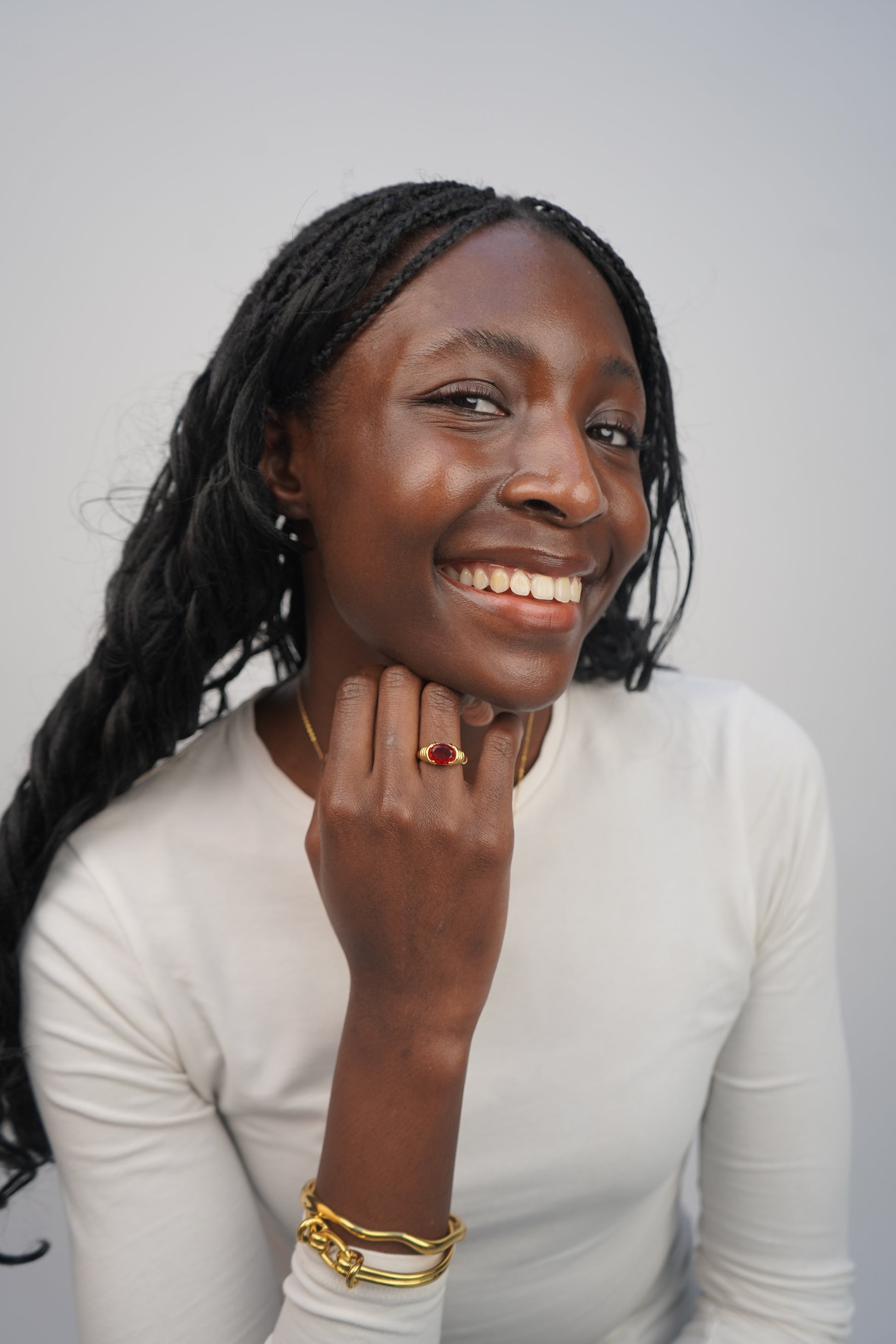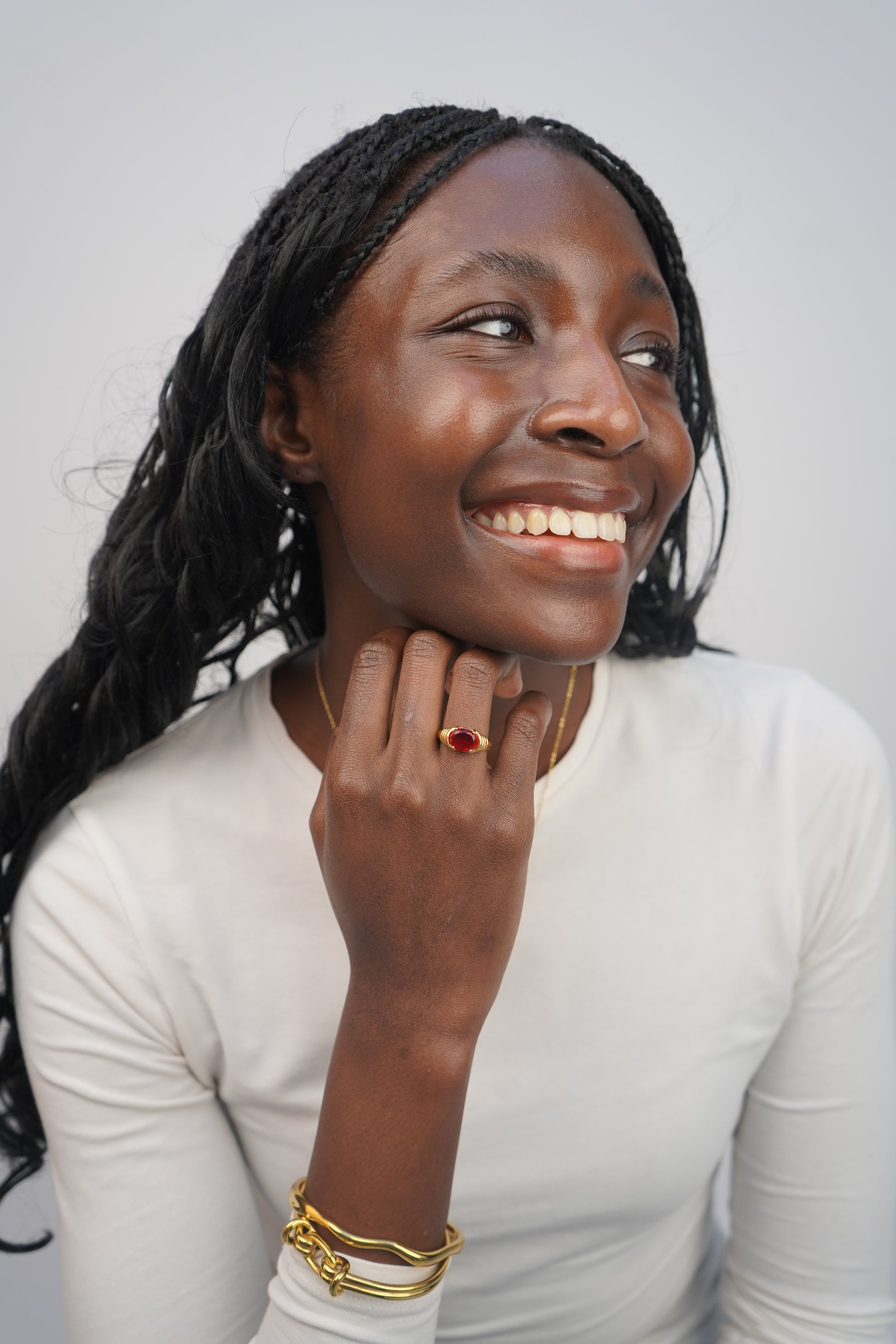 Audrey's red ring is a vintage inspired gold ring featuring a large red zirconia gemstone at the center. This ring is the perfect statement piece to add a pop of colour to any look.