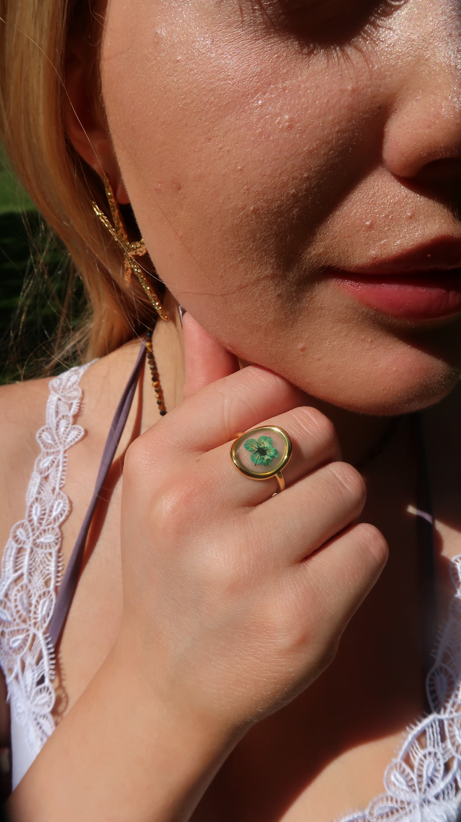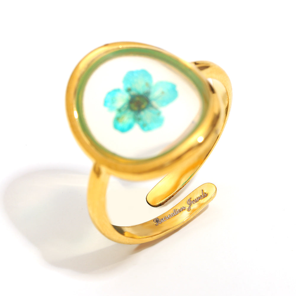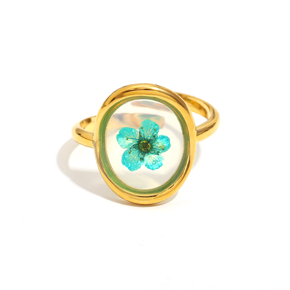 The Aveline Ring features a real pressed turquoise flower, preserved in resin and framed by a polished gold band. Lightweight and easy to style, it adds a soft pop of colour to any summer look.