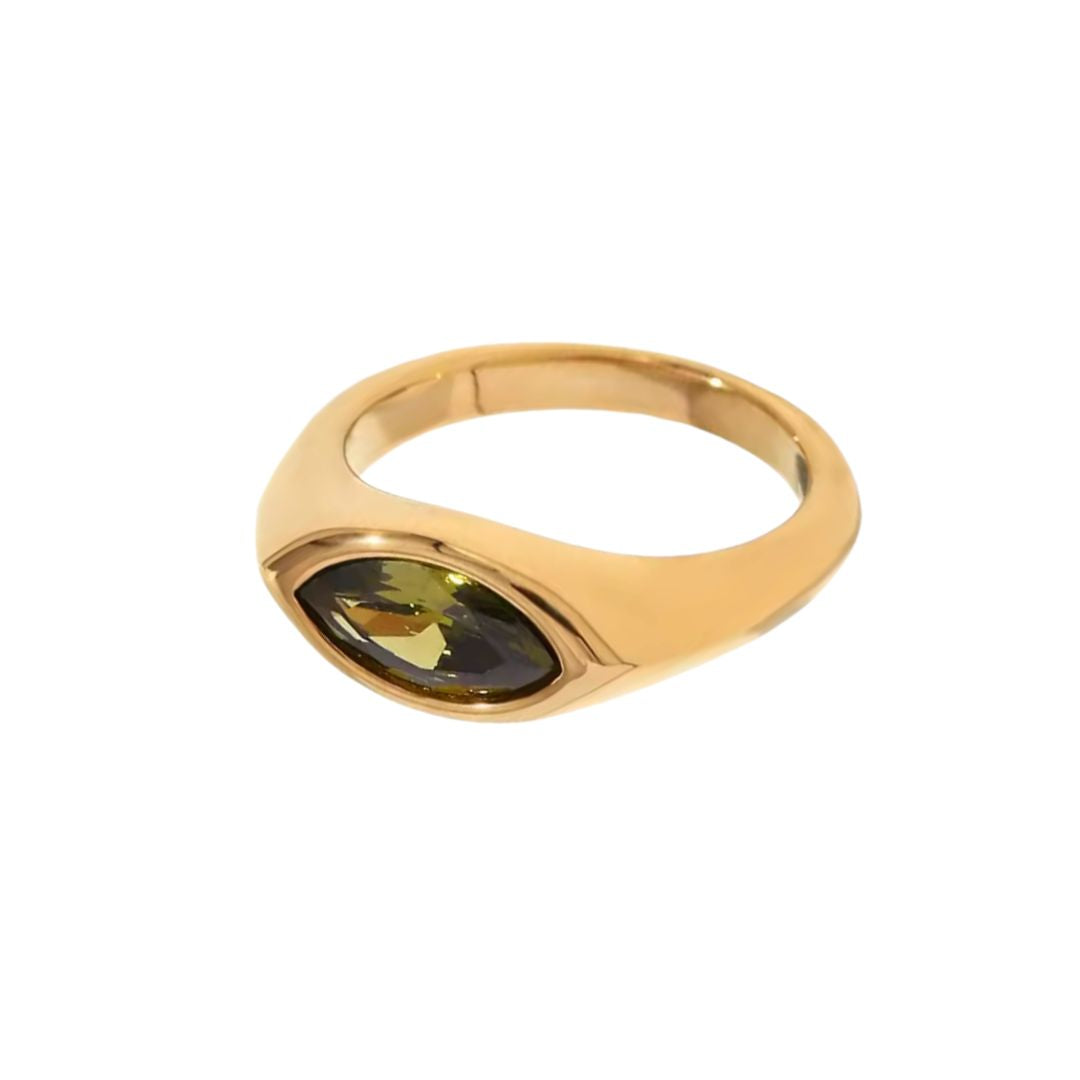 Bailey's green gemstone ring is a gold ring with a unique green marquise gemstone. This simple and elegant ring complements any outfit.