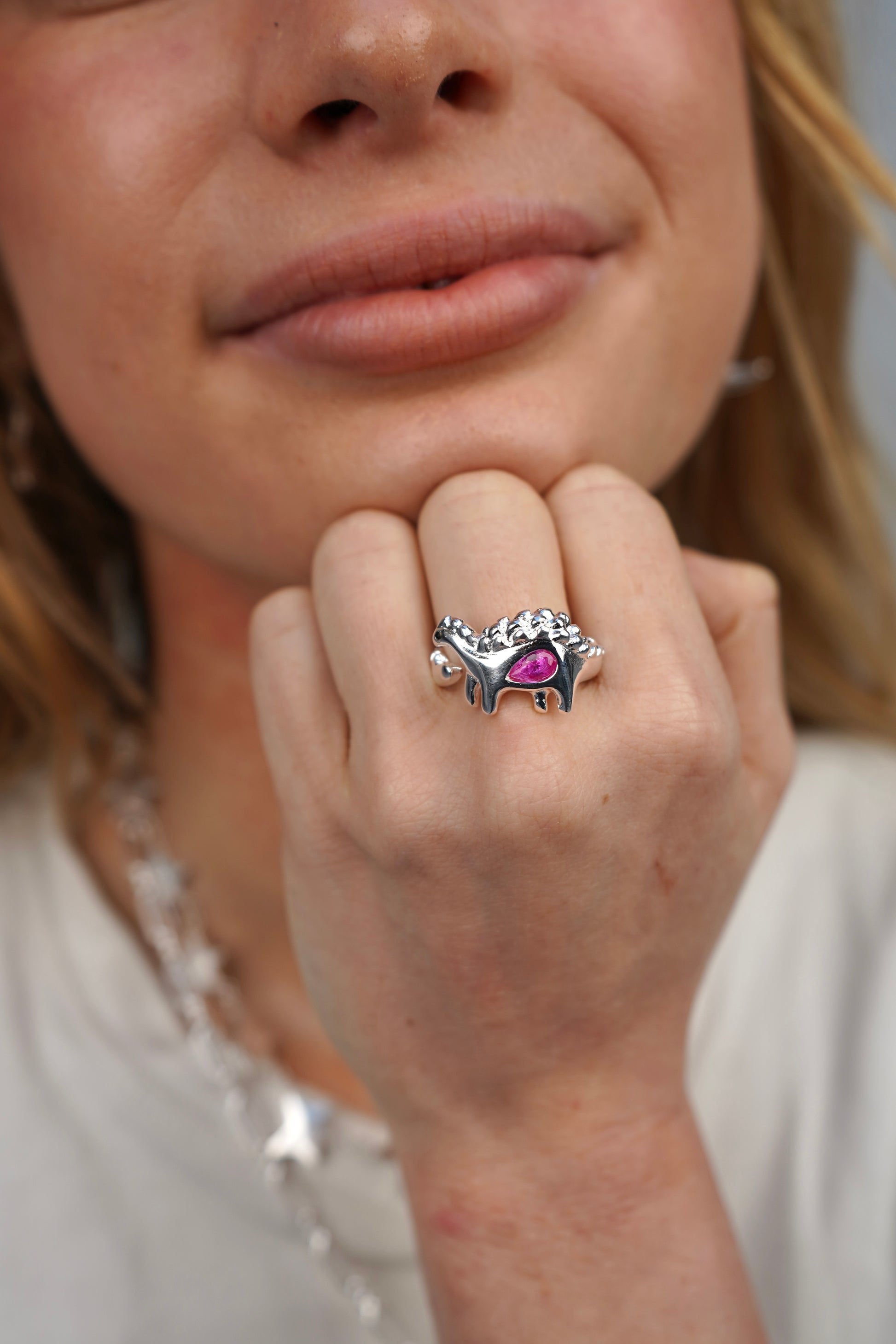 Bee's pink dinosaur ring in silver is a chunky dinosaur-shaped ring with a large pink gemstone accent. This unique and playful ring is perfect as a statement piece or in a maximalist stack.