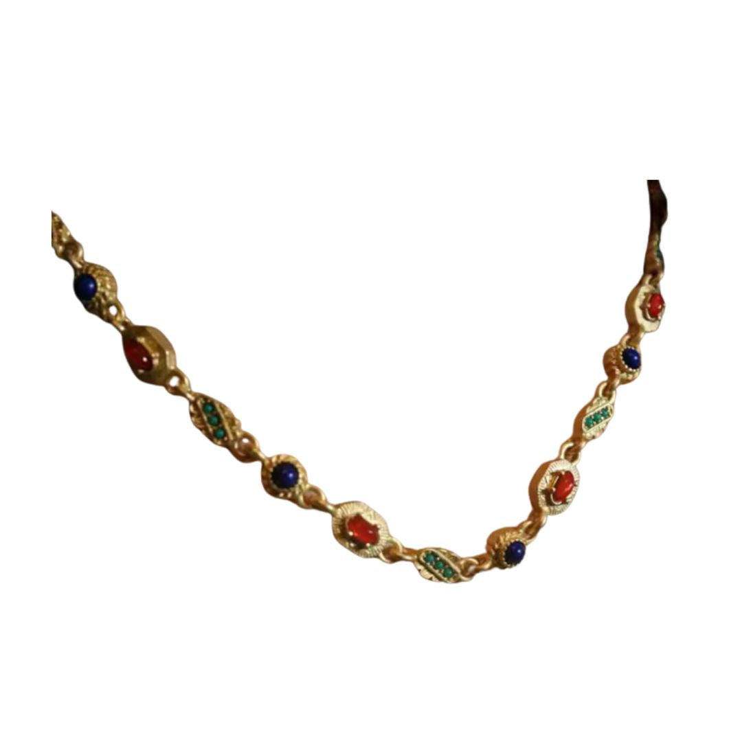 Blair's gemstone chain is a vibrant vintage-inspired piece with red, green, and blue gemstones set in decorative oval links. This is perfect for adding a pop of colour to any outfit.