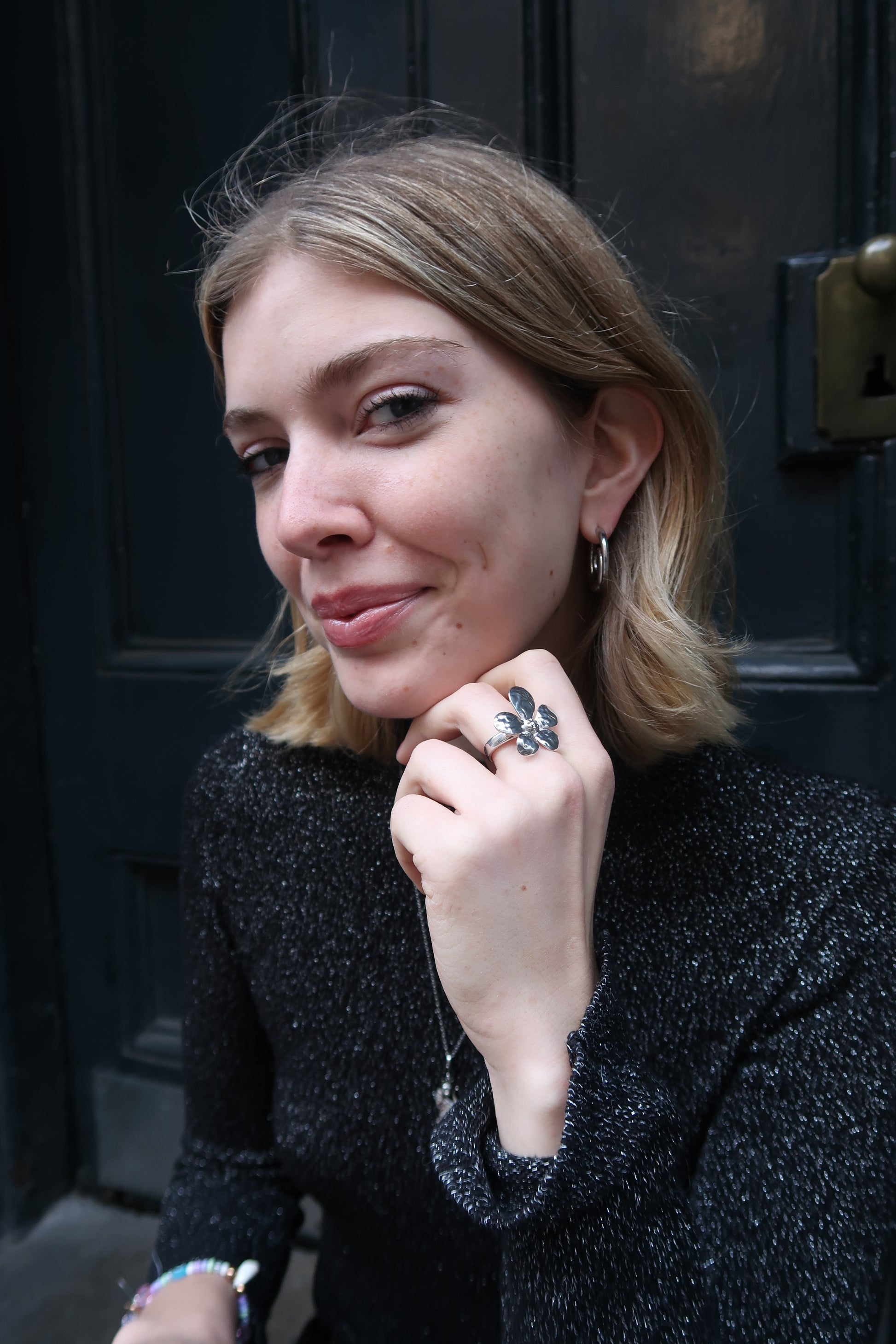 Camille’s flower ring in silver is an adjustable silver ring with a large flower design. This is the perfect maximalist statement piece to add to any outfit.