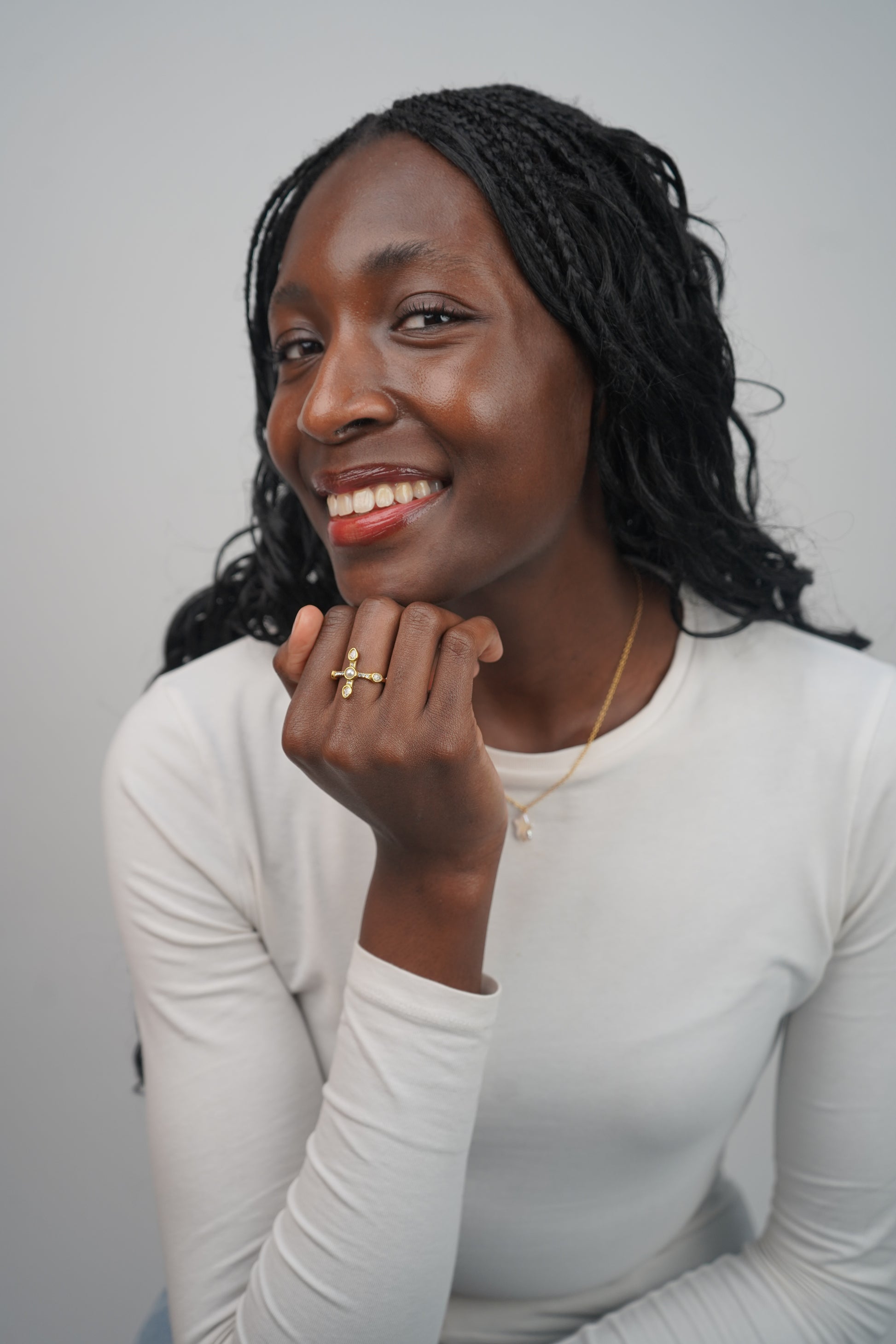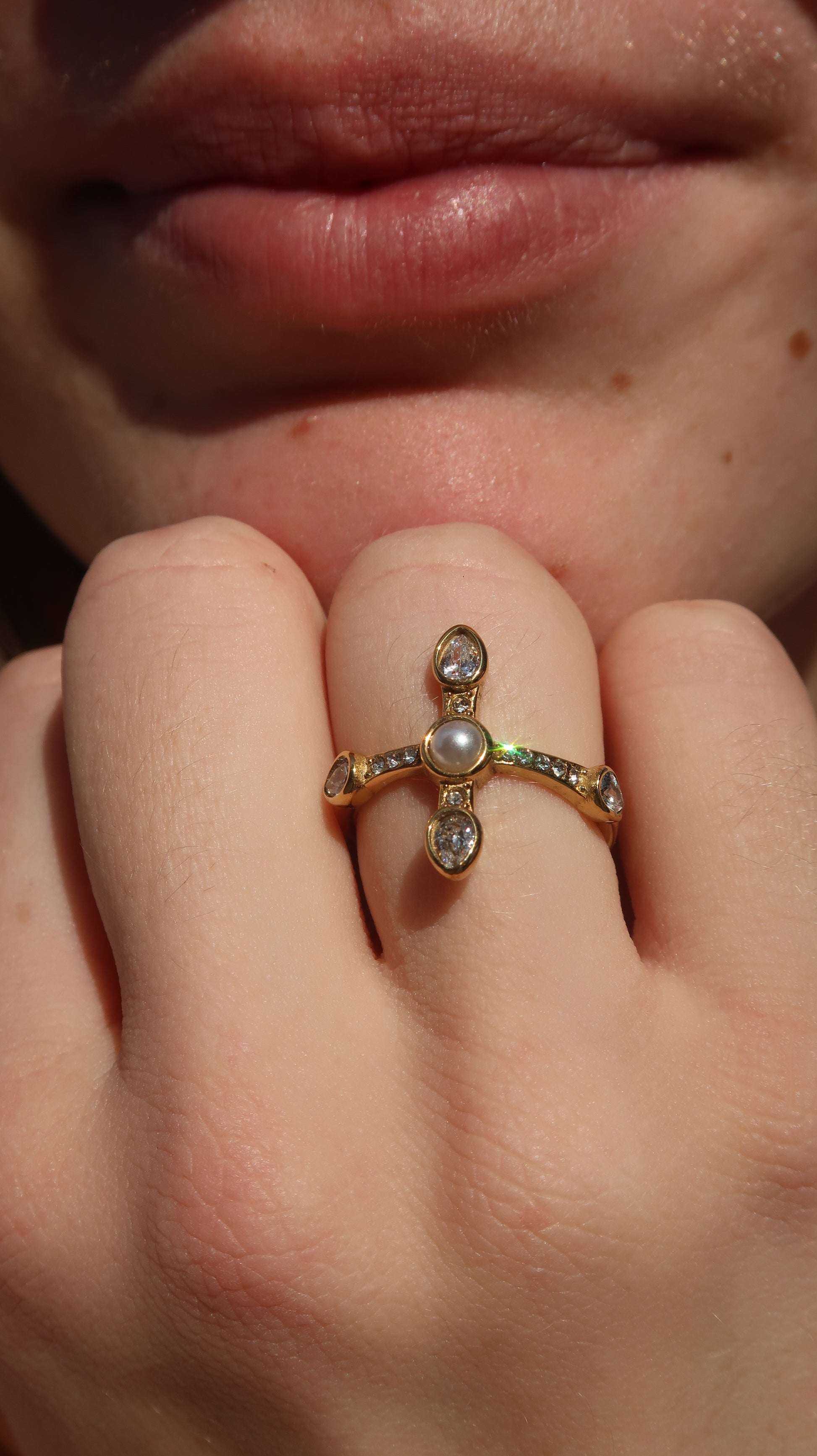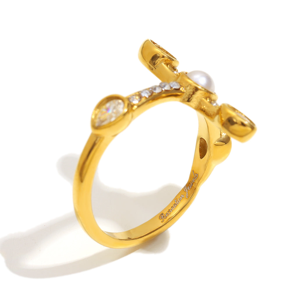Catherine's cross ring is a dainty gold ring with a cross design embellished with clear gemstones and a pearl bead at the center.