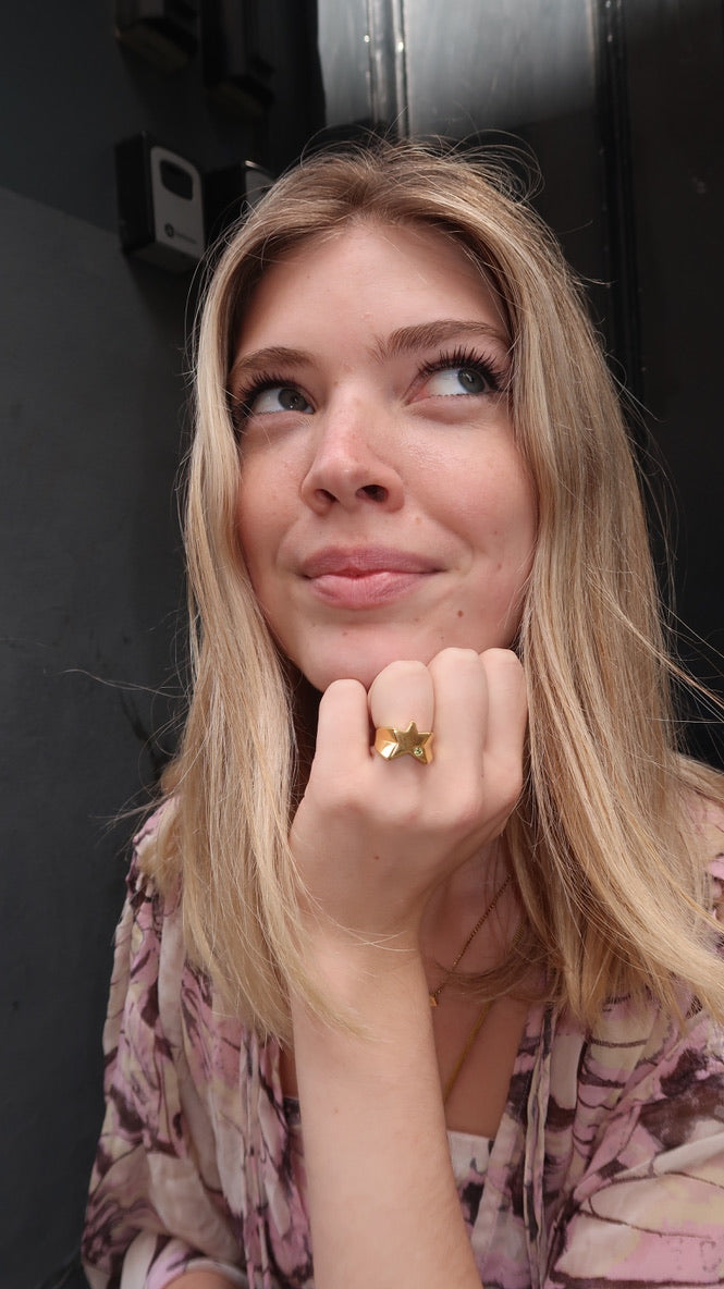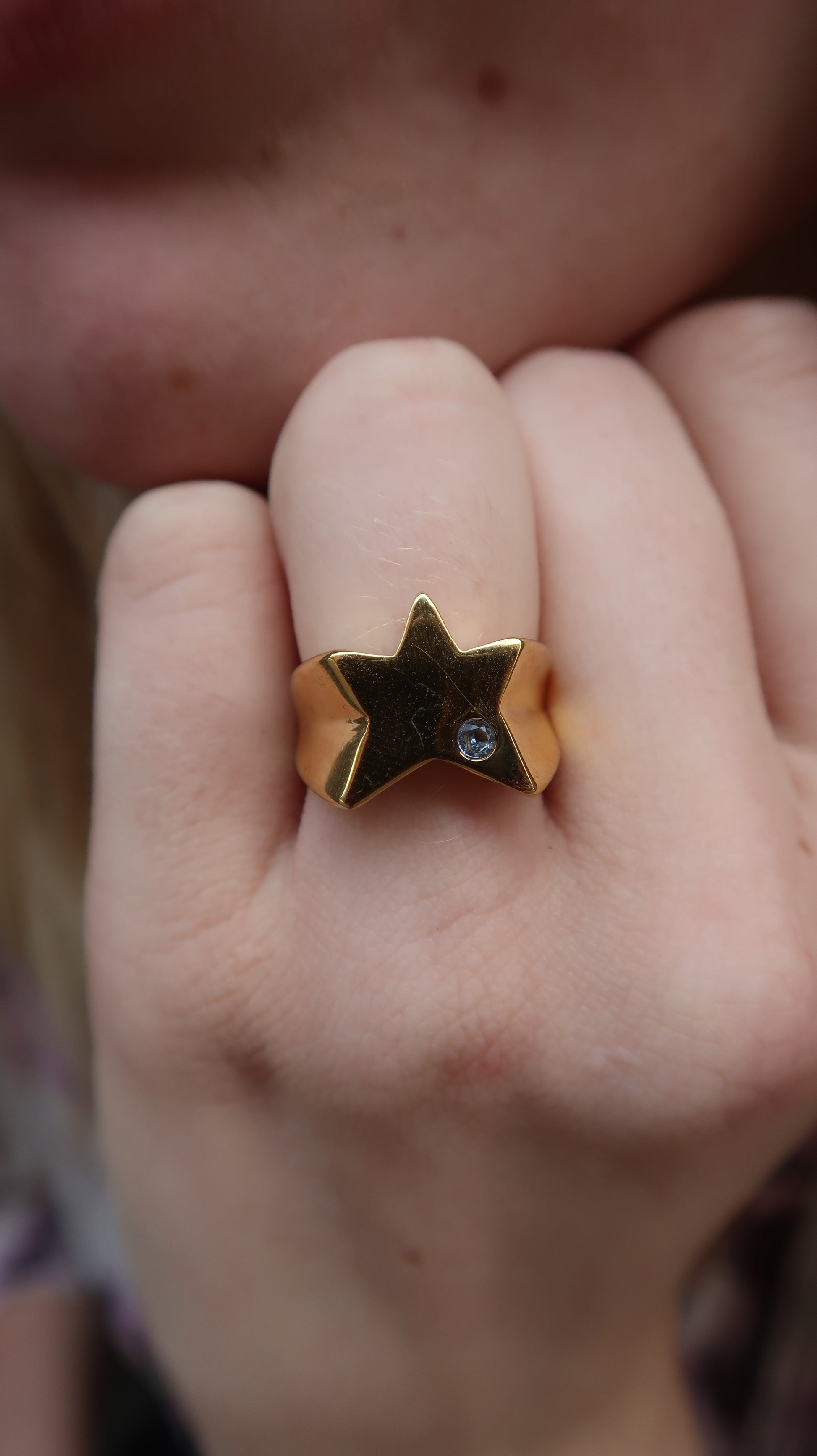 Cecily's blue star ring is a chunky star-shaped gold ring with a single blue gemstone accent. This ring is the perfect bold piece to add to your maximalist stack.