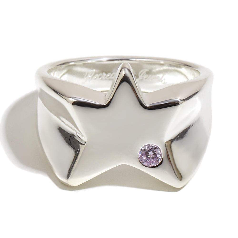 Cecily's star ring is a chunky star-shaped silver ring with a single clear gemstone accent. This ring is the perfect bold piece to add to your maximalist stack.