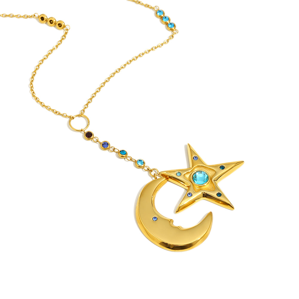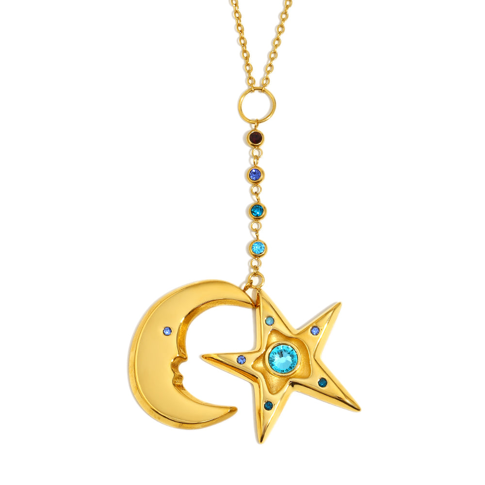 Cecily's sea star and moon necklace is a gold necklace with two large star and moon pendants accented with deep to light blue gemstones. This necklace is the perfect maximalist statement piece to complement any outfit.