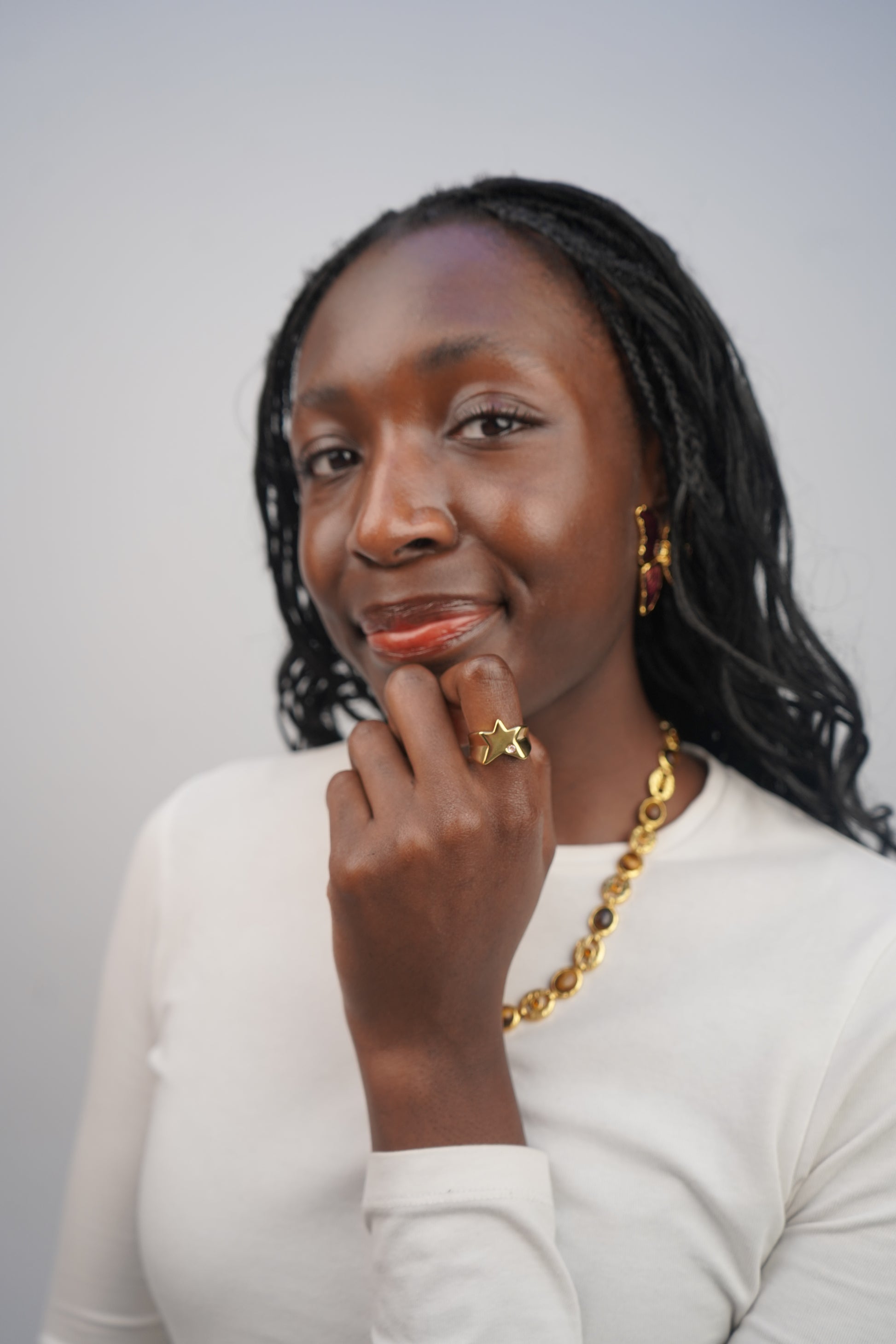 Cecily's star ring in pink is a chunky star-shaped gold ring with a single pink gemstone accent. This ring is the perfect bold piece to add to your maximalist stack.