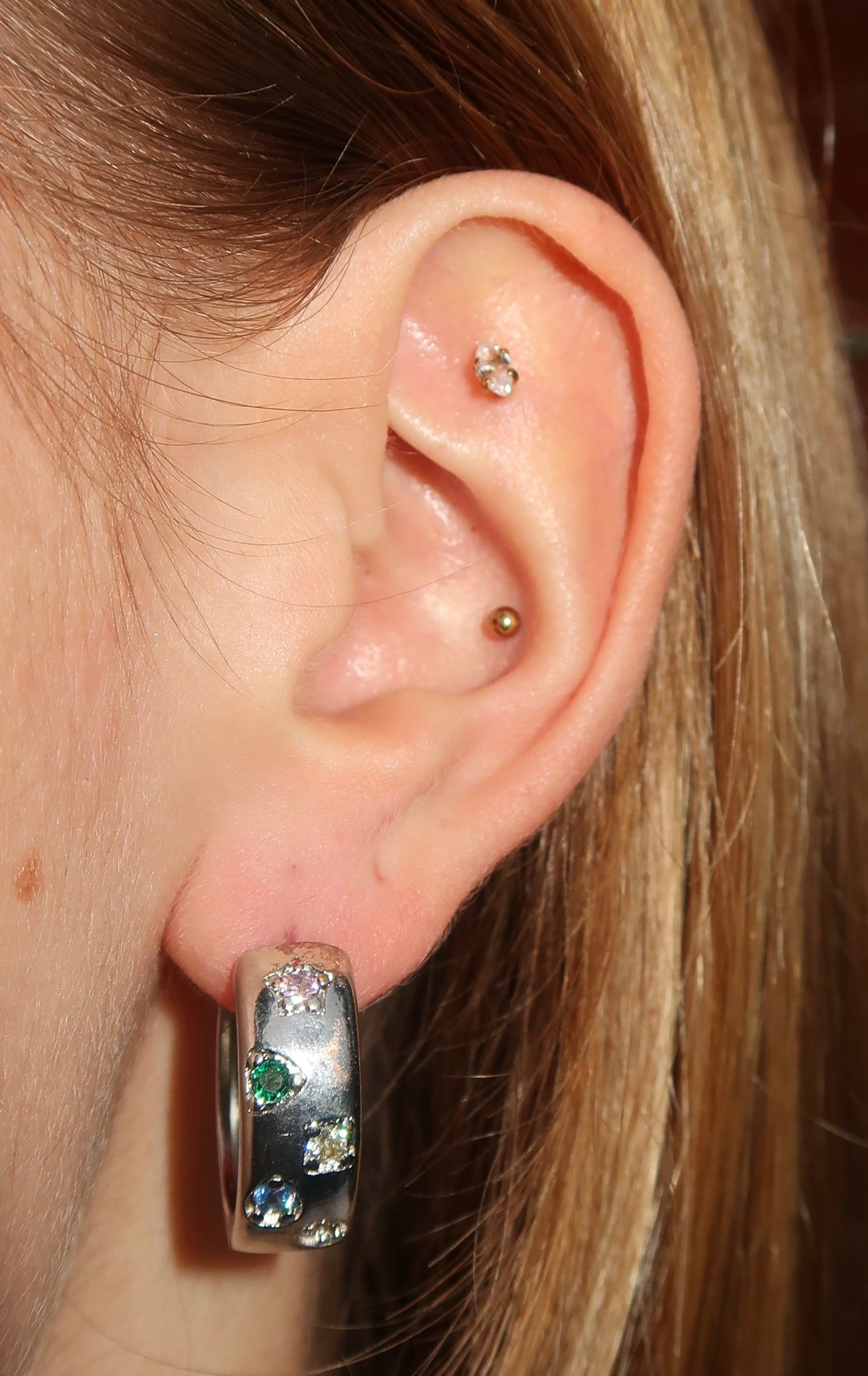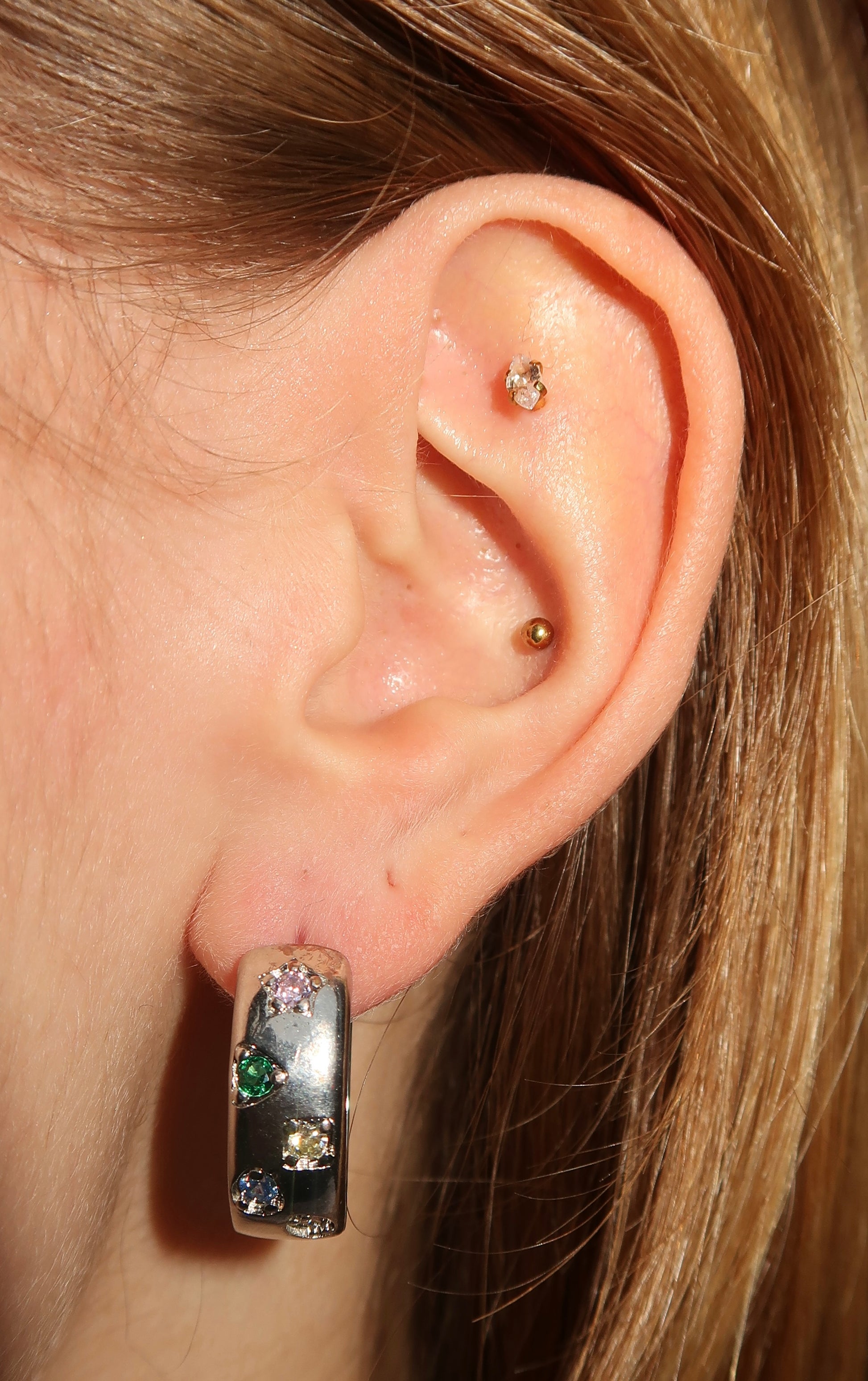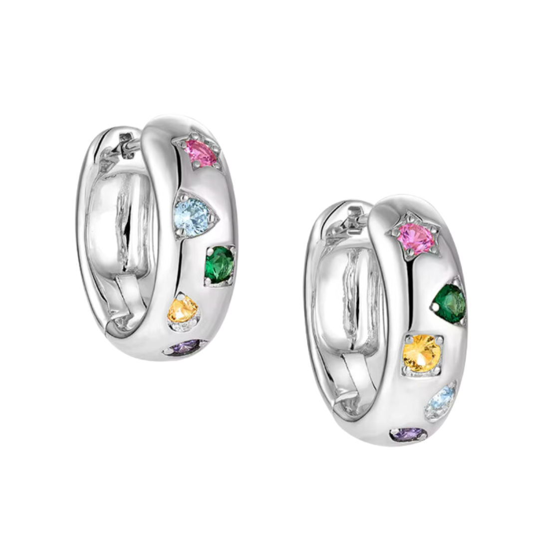Charlotte's Silver Hoops are small silver hoops featuring gemstones of different shapes and colours. These earrings are waterproof and hypoallergenic making them perfect for everyday wear.