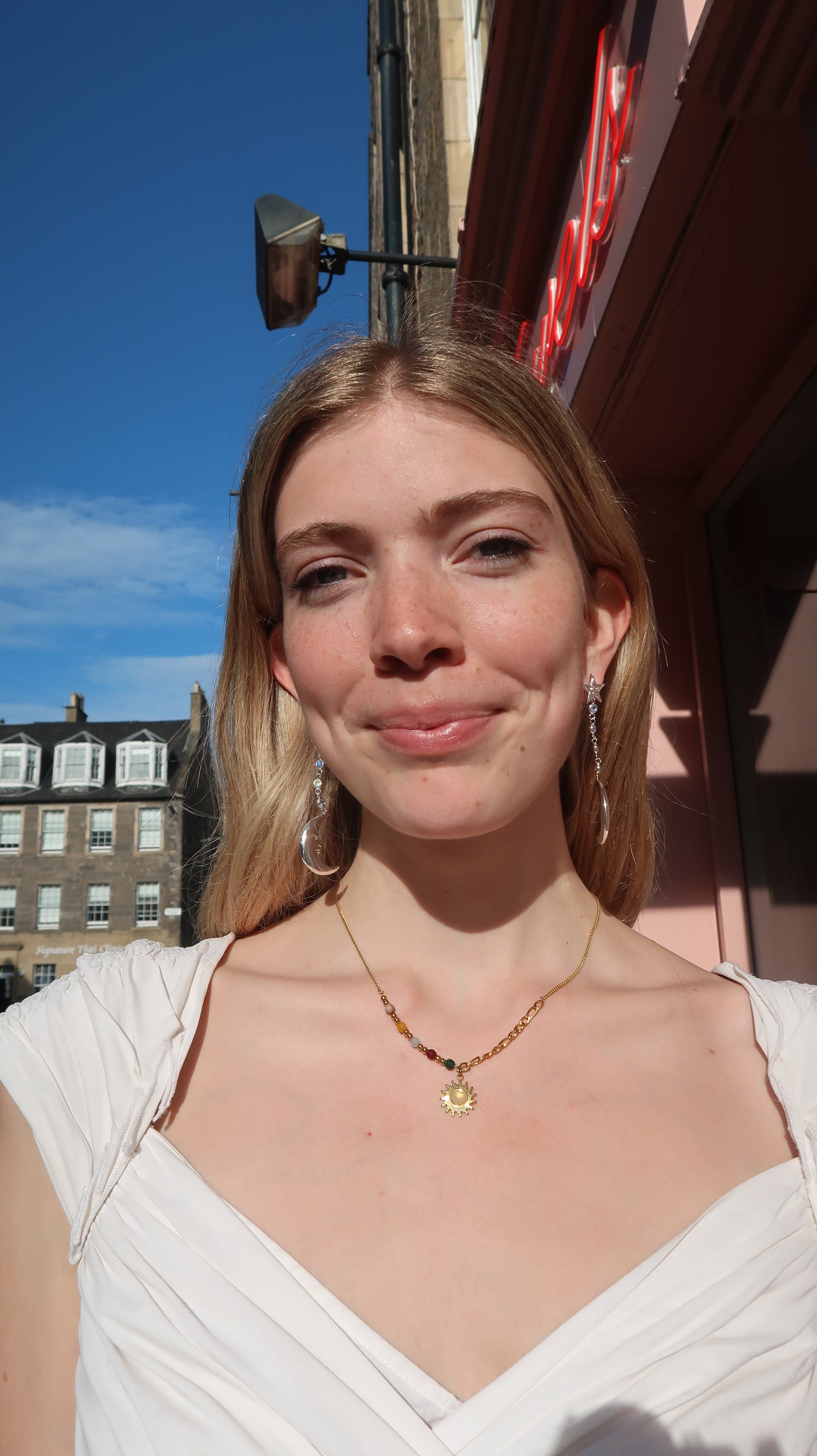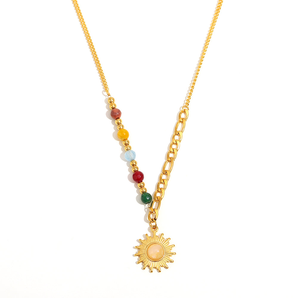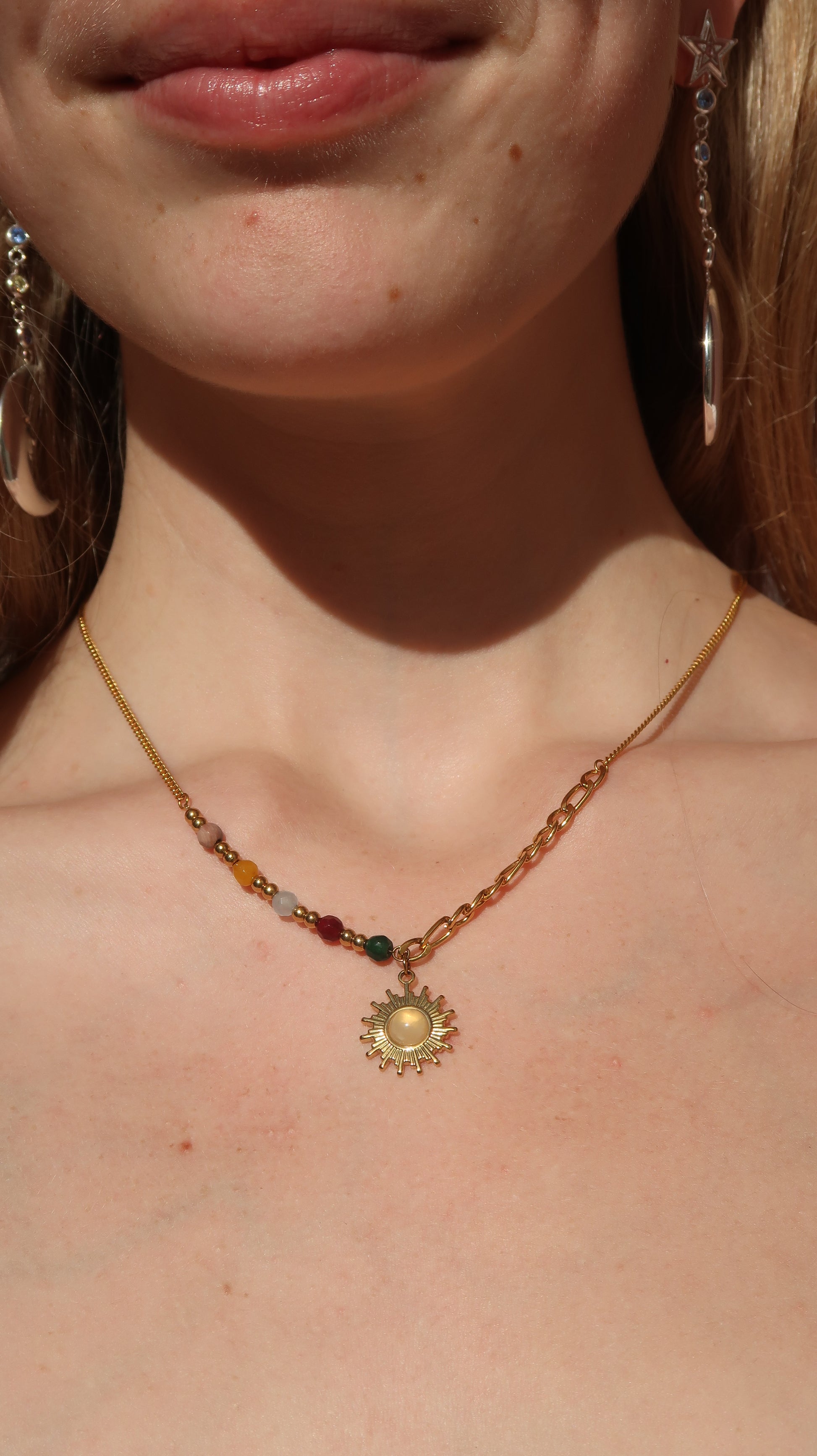 Charlotte's Sun Necklace is a colourful necklace with a sun-shaped pendant on an asymmetrical chain with green, red, blue, yellow, and purple beads on one side. This is the perfect necklace to add a summery touch to any look.