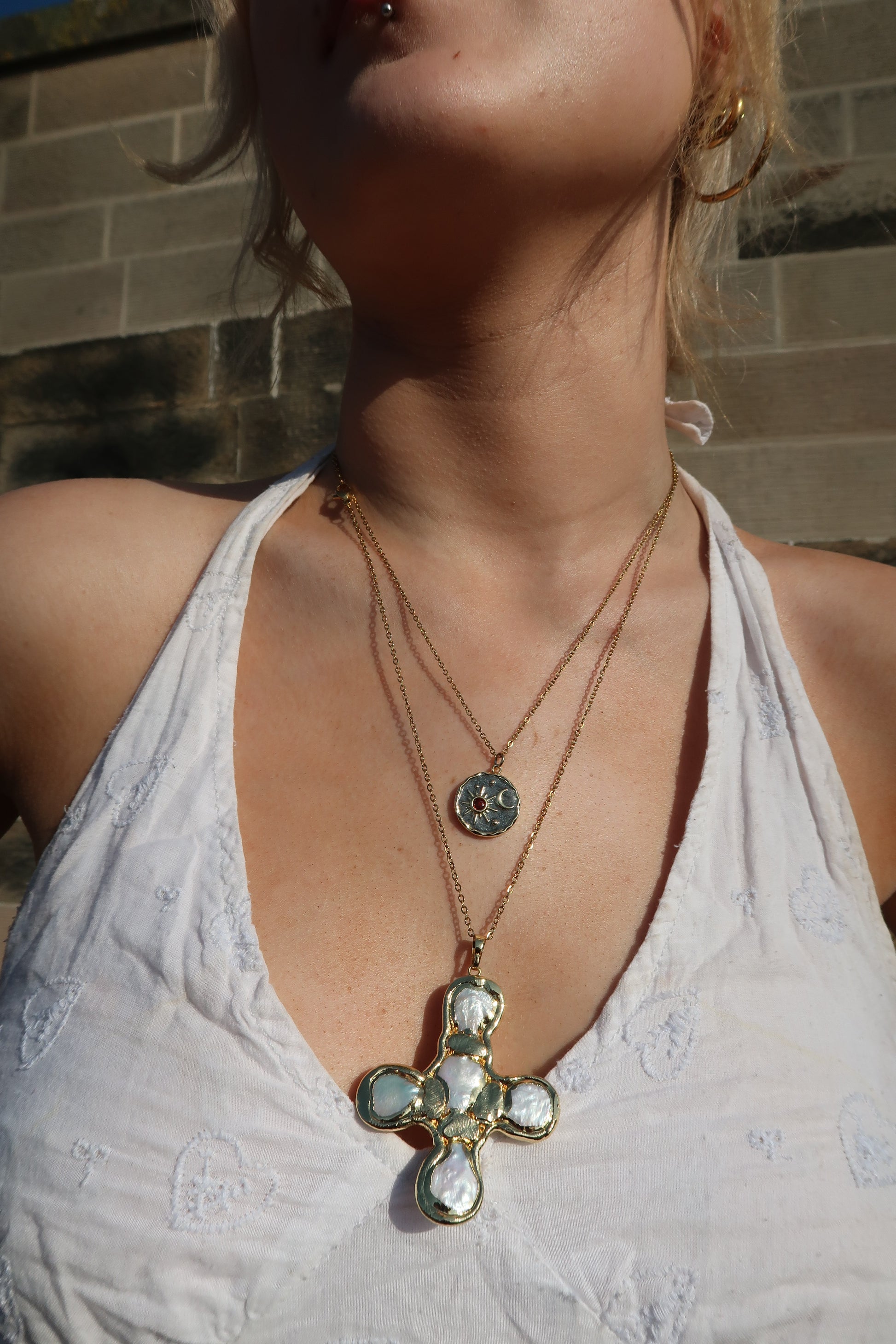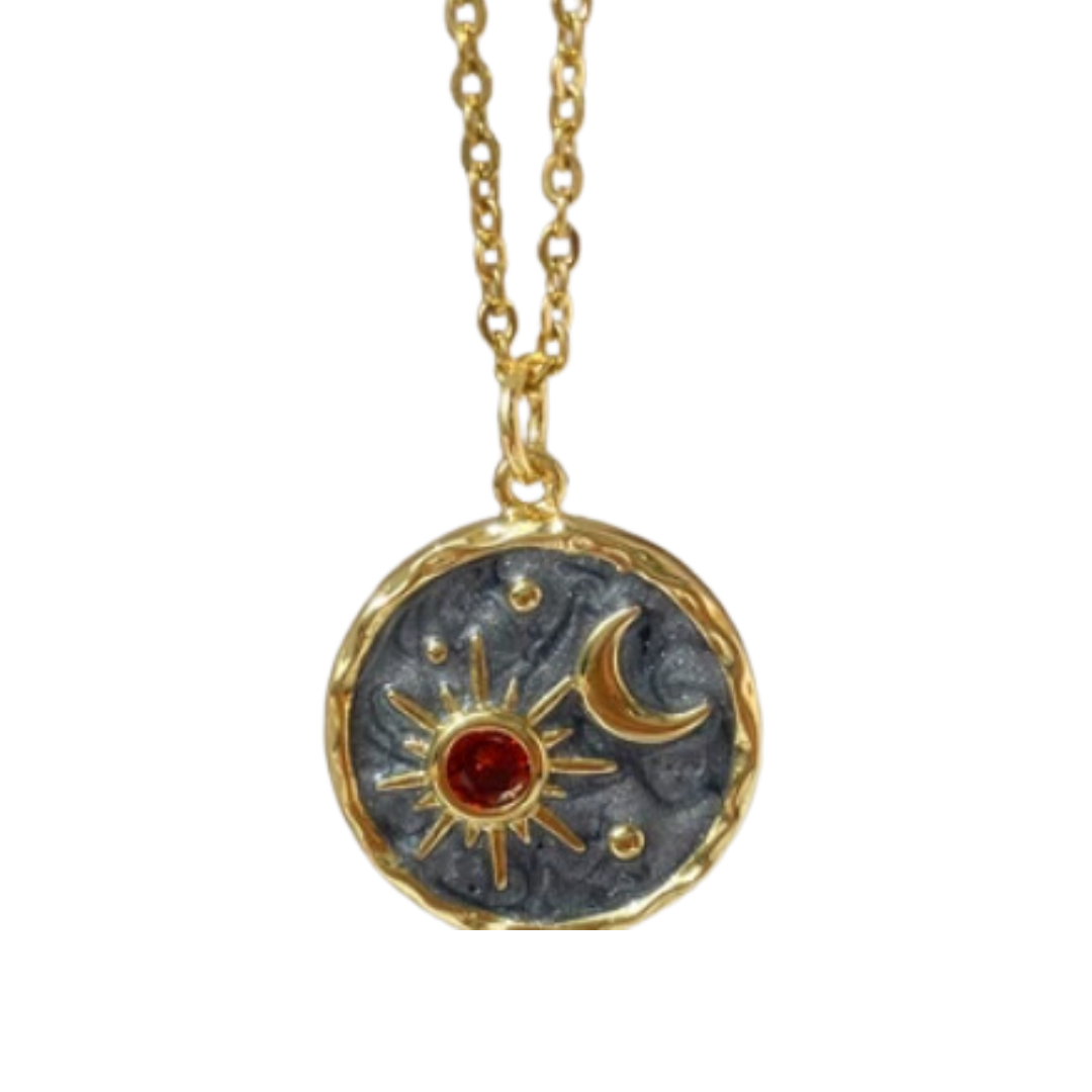 Chloe's Sun and Moon Pendant Necklace is a dainty pendant necklace that features a small, striking blue pendant depicting both the sun and moon, accented with a red gemstone. This is the perfect necklace for layering or to wear on its own for a dainty minimalist look.