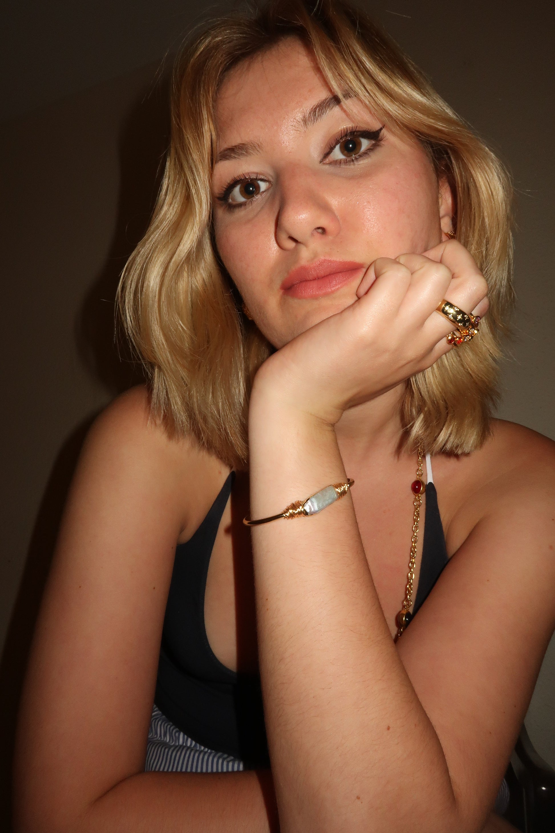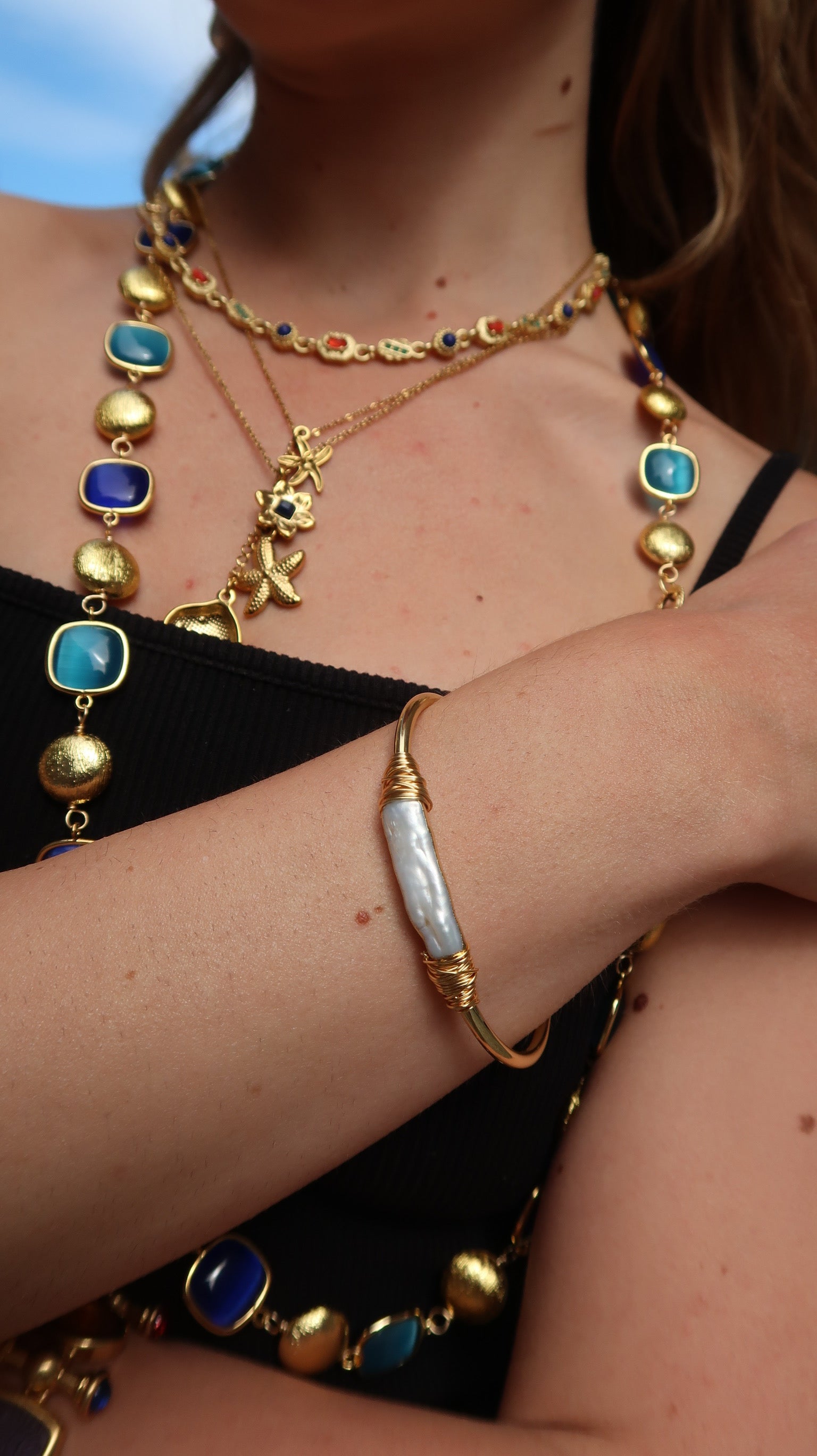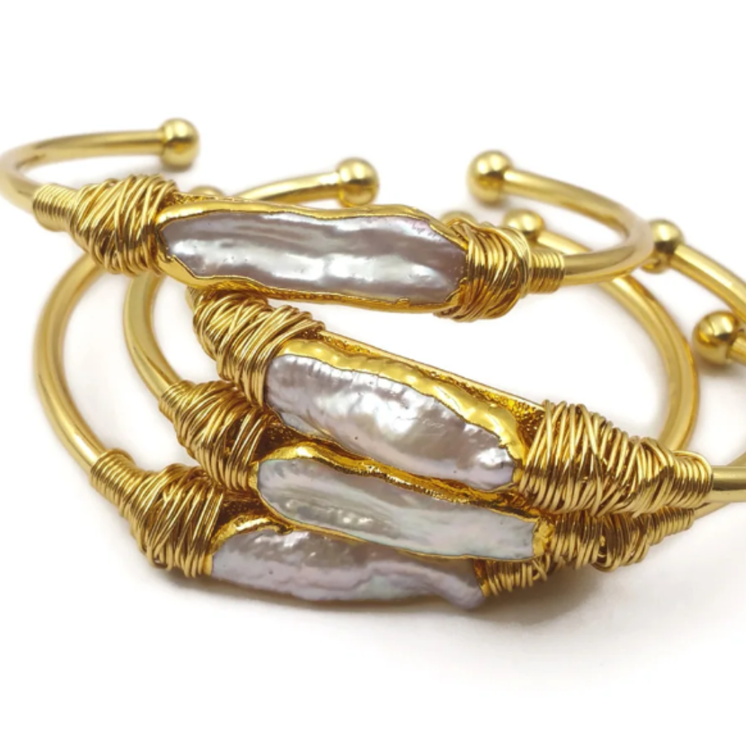 Christina's pearl bangle is a slim gold bangle featuring a beautiful mother-of-pearl stone. The size and shape of the mother-of-pearl may vary slightly on each bracelet making them truly unique. Perfect for stacking and everyday wear.