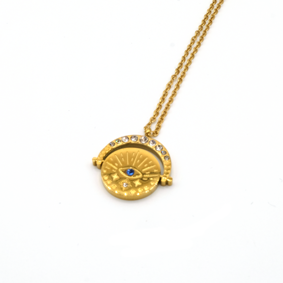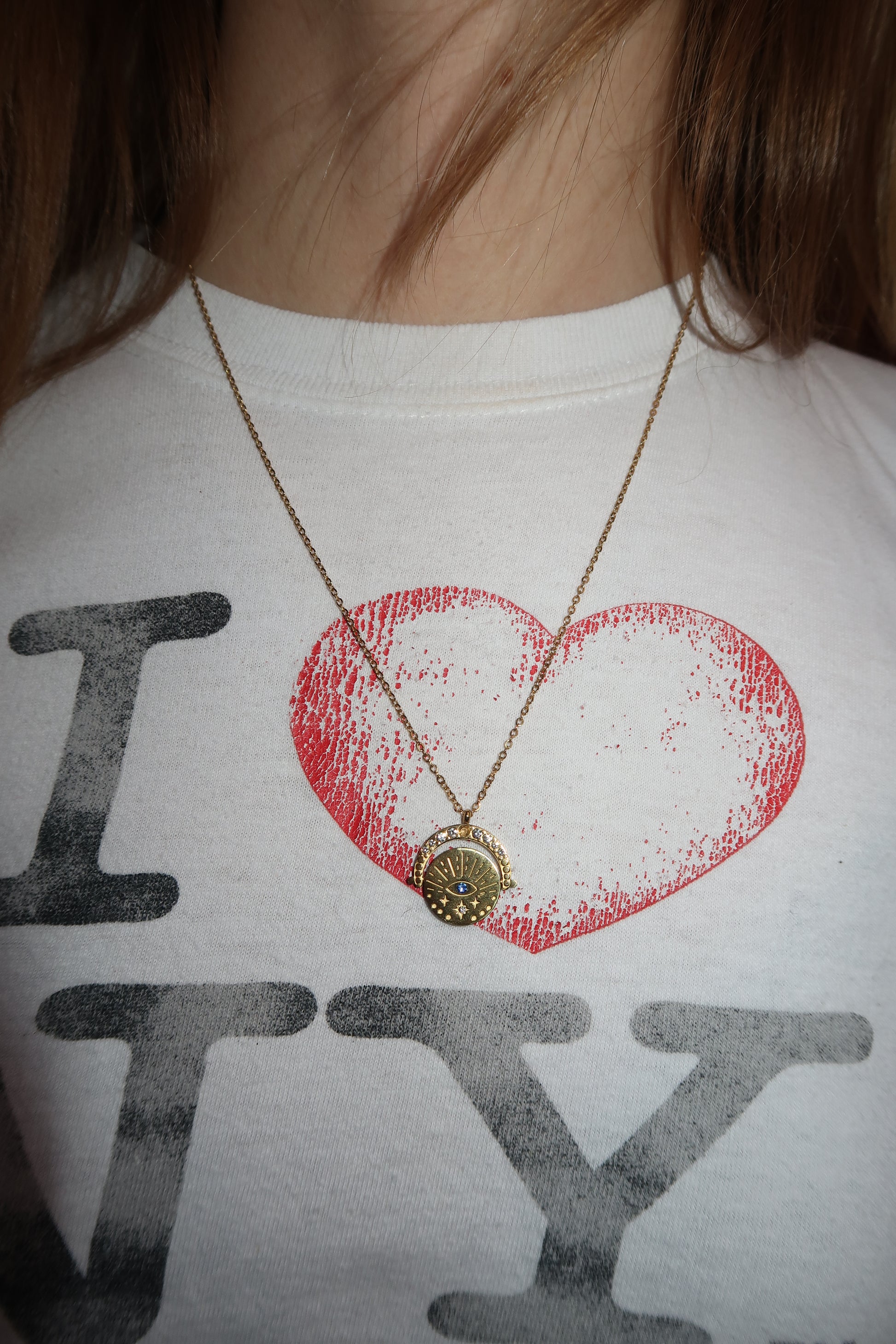 Clara’s enchanting necklace is a dainty gold pendant necklace featuring an eye design accented with a blue gemstone and surrounded by celestial engravings. This is the perfect necklace for layering or to wear by itself for a dainty minimalist look.