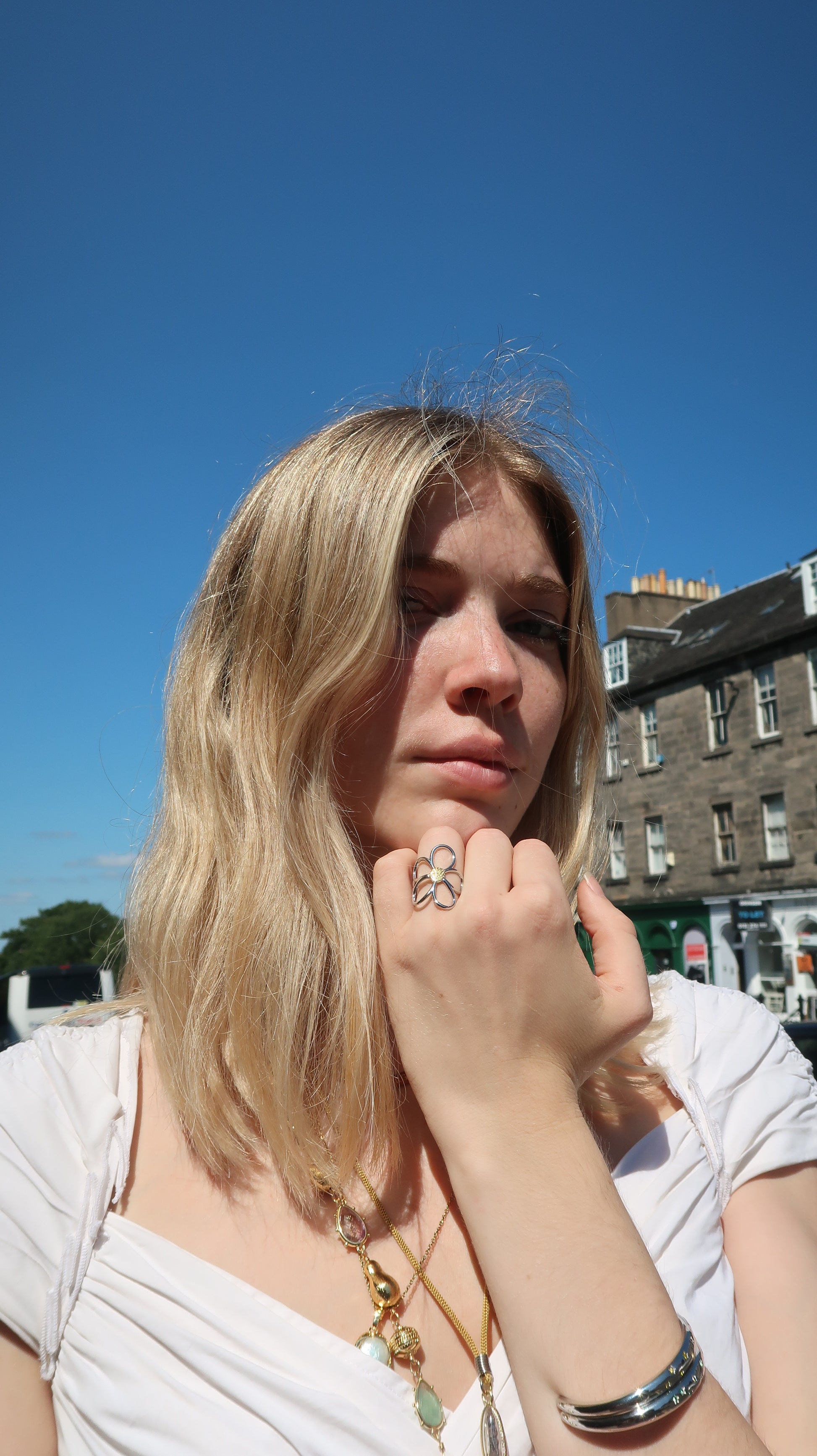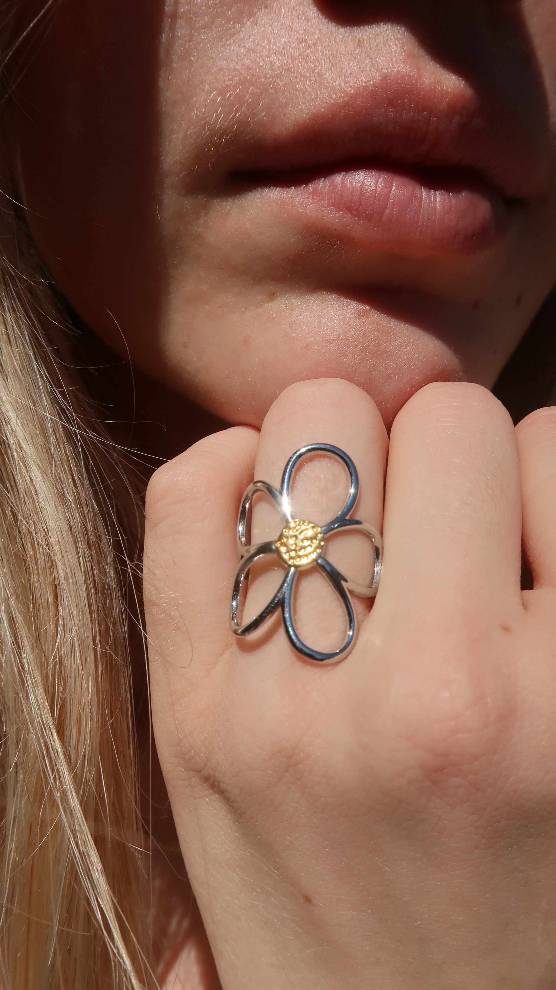 Colette's Fower Ring in Silver is a silver flower shaped ring with a gold accent at the center. This ring is the perfect elegant piece for those who like to mix gold and silver.