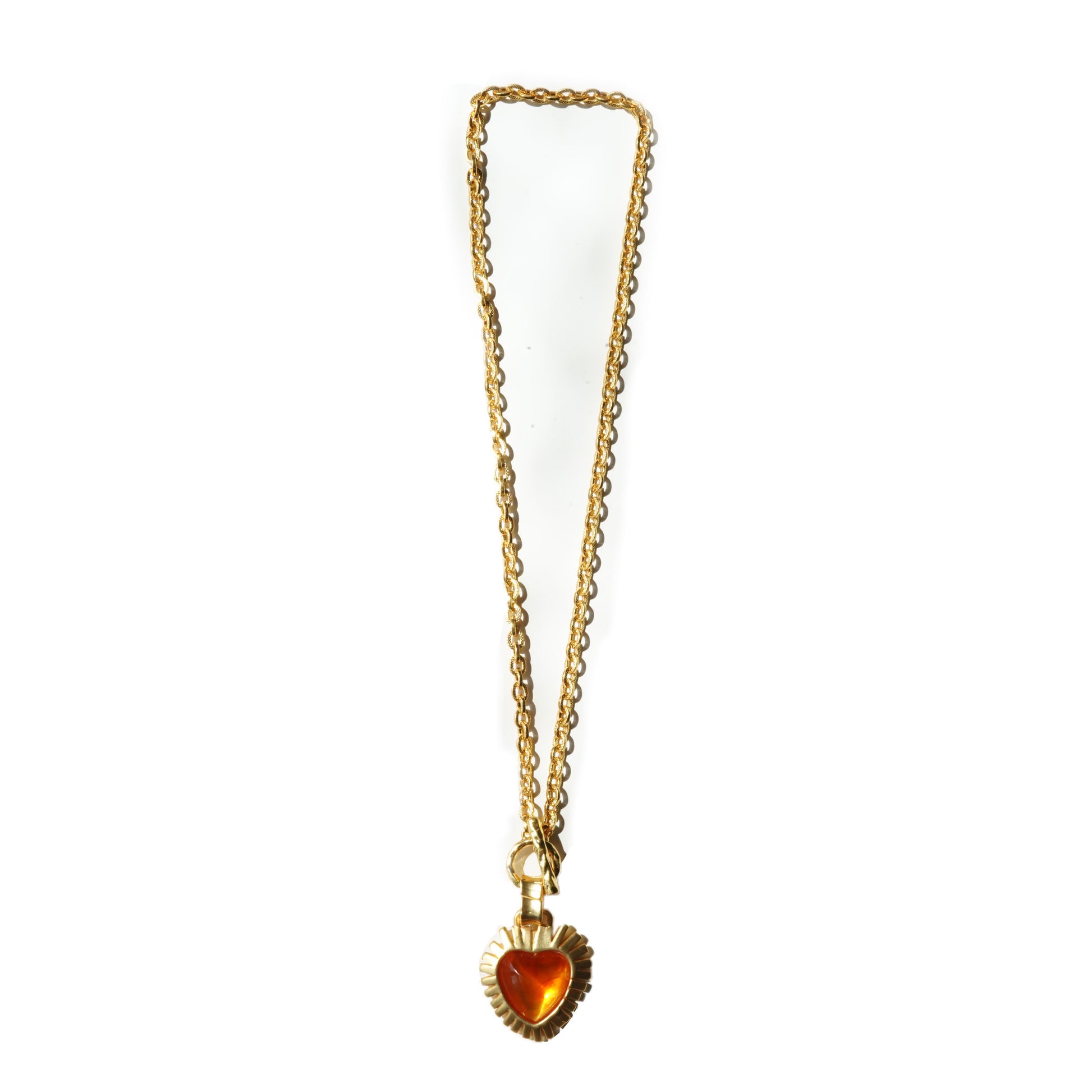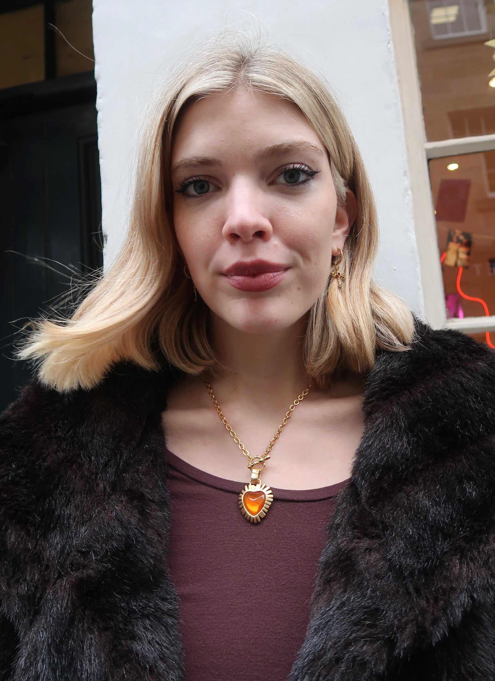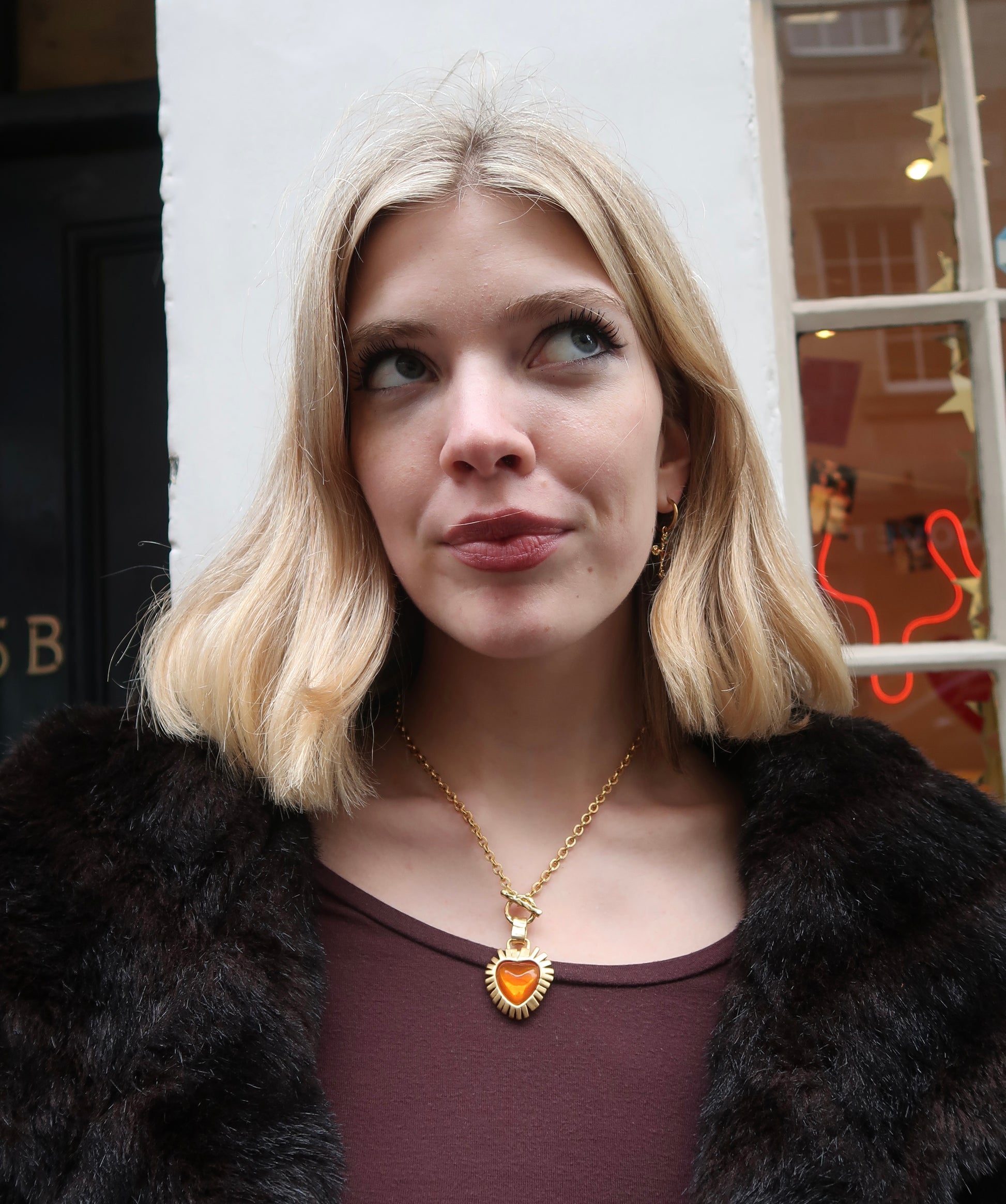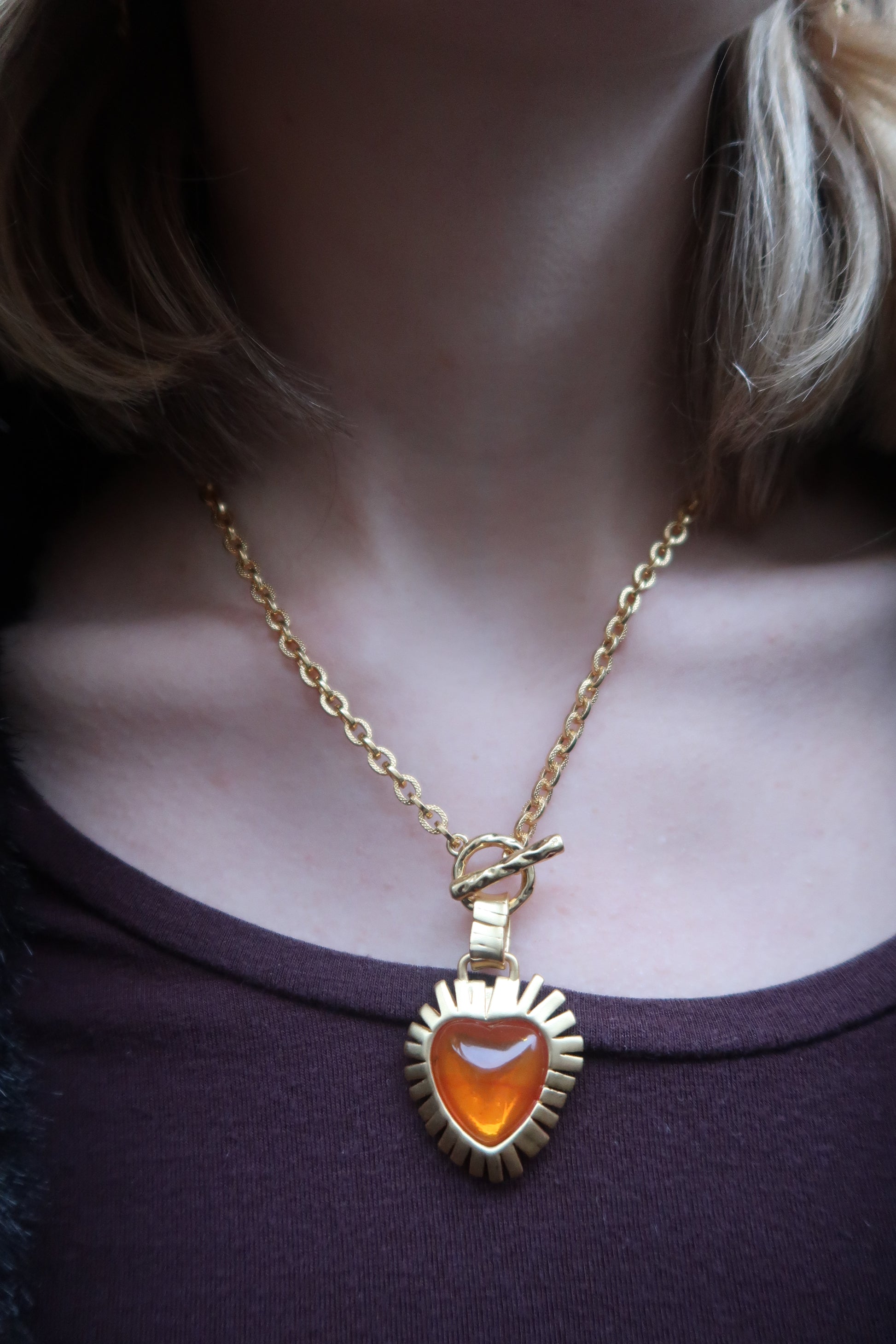 Cora's heart necklace features a golden orange-red gemstone heart pendant framed by a sunburst pattern. The perfect statement piece to add a pop of colour to any outfit.