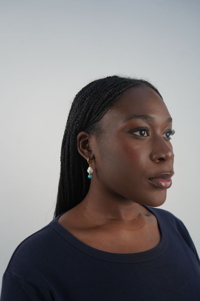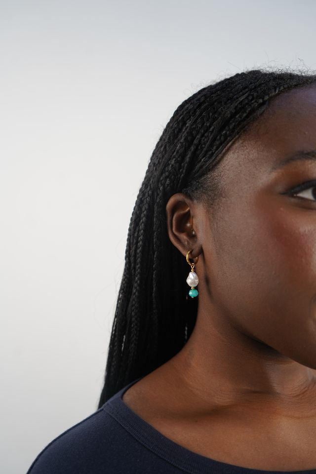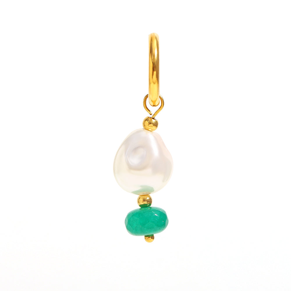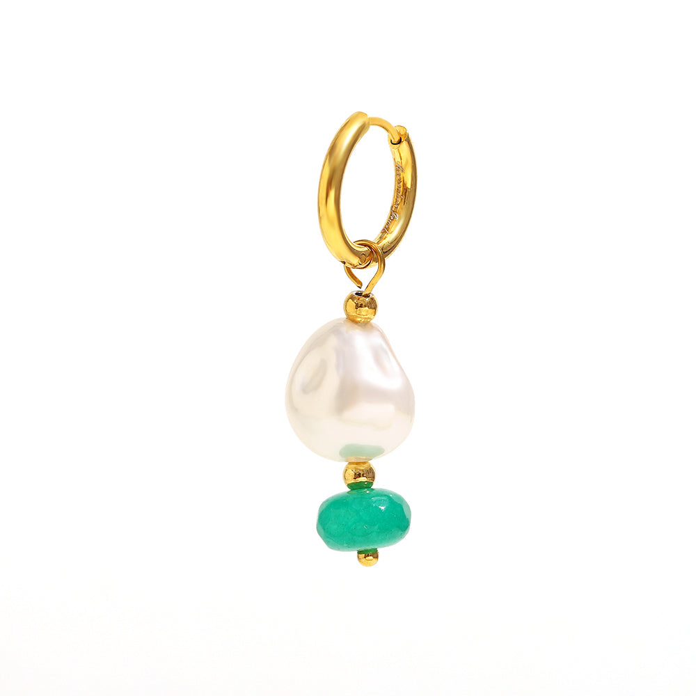 Corrie's pearl huggies are gold huggie earrings attached with pearl droplets and a green gemstone.