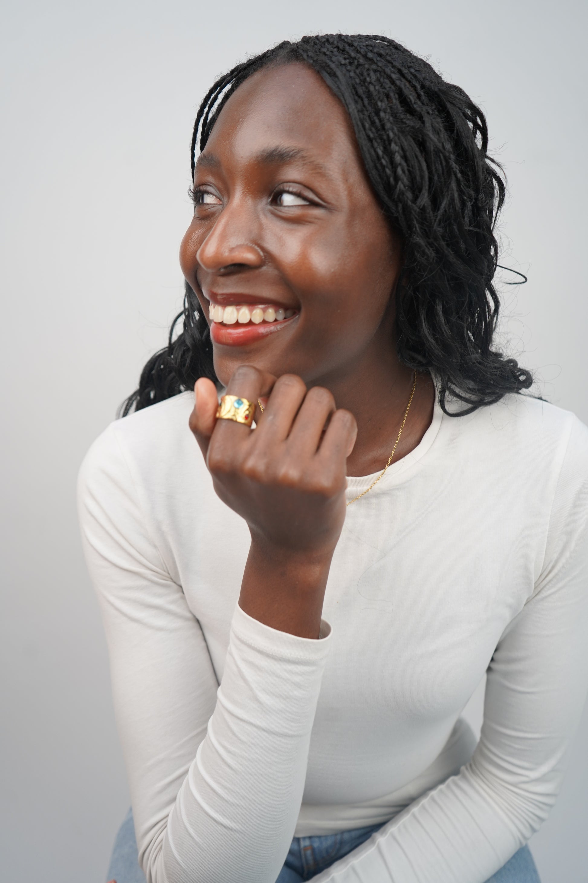 Cressida’s Gold Celestial Ring is a bold, sculptural piece set with multi-toned gemstones and finished with a hammered texture. Featuring a crescent moon, star and orb detailing, it captures the magic of sunlit waters and stargazing skies.