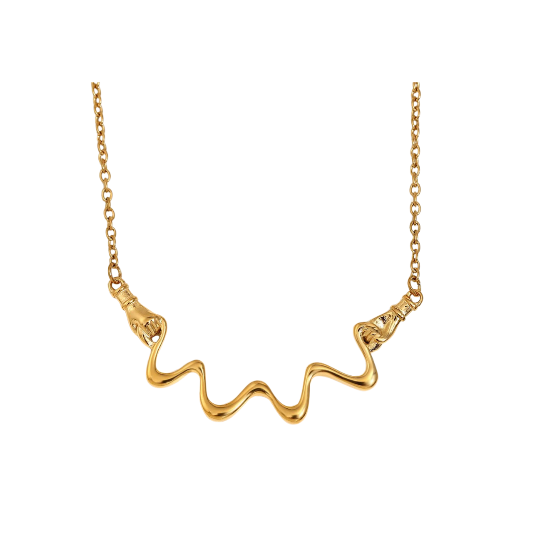 The friendship necklace is a necklace designed to showcase our charm collection. This necklace features a zigzag pattern, perfect for holding the charms, with two hands on either end. This necklace can be worn on its own or with any charms of your choice.