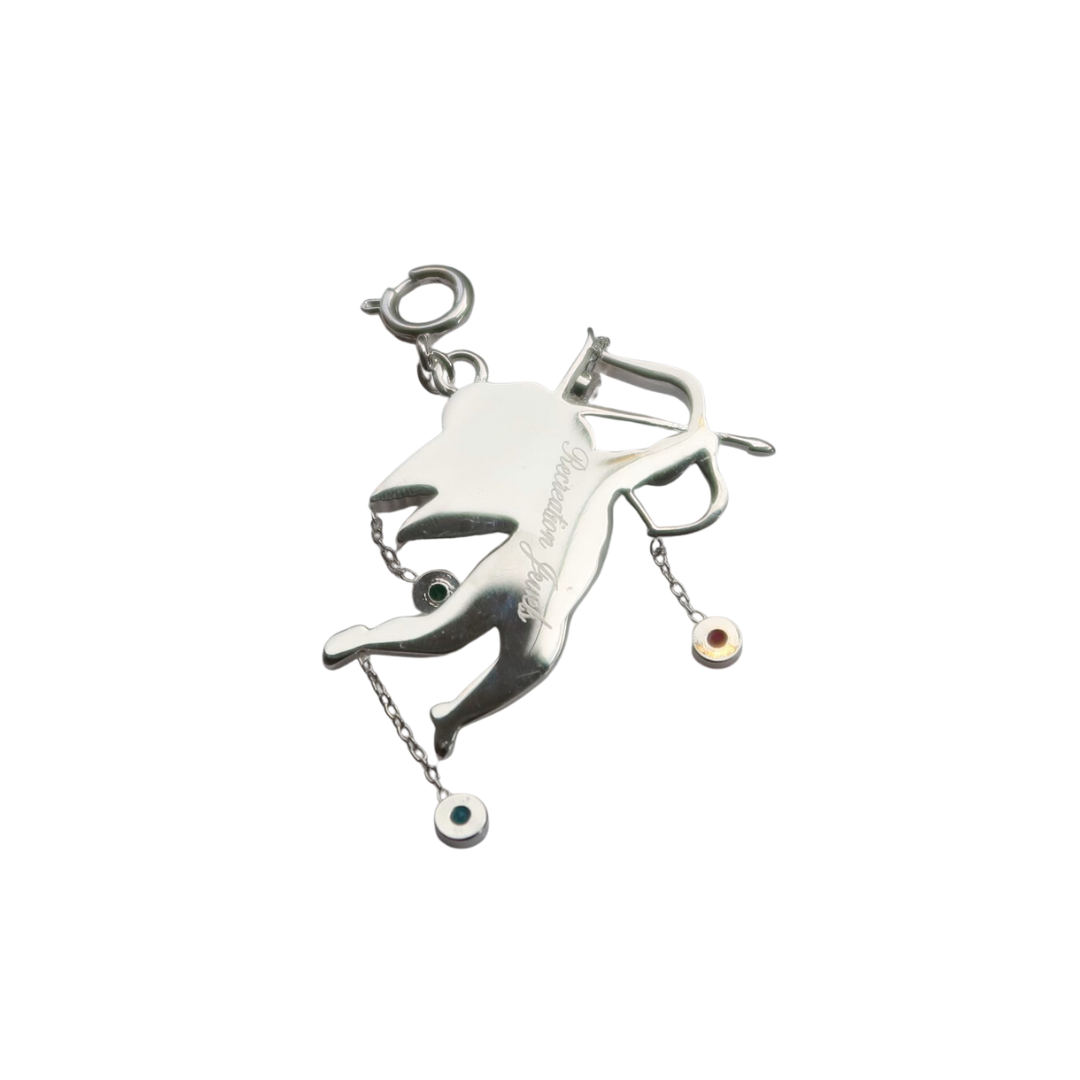 The cupid charm is a charm designed to look like cupid shooting an arrow and is accented with four different coloured gemstones. This charm is symbolic of romantic love and affection and can also be a symbol of divine love and protection. This charm can be worn on any chain or on our friendship necklace, designed specifically to showcase our charm collection.