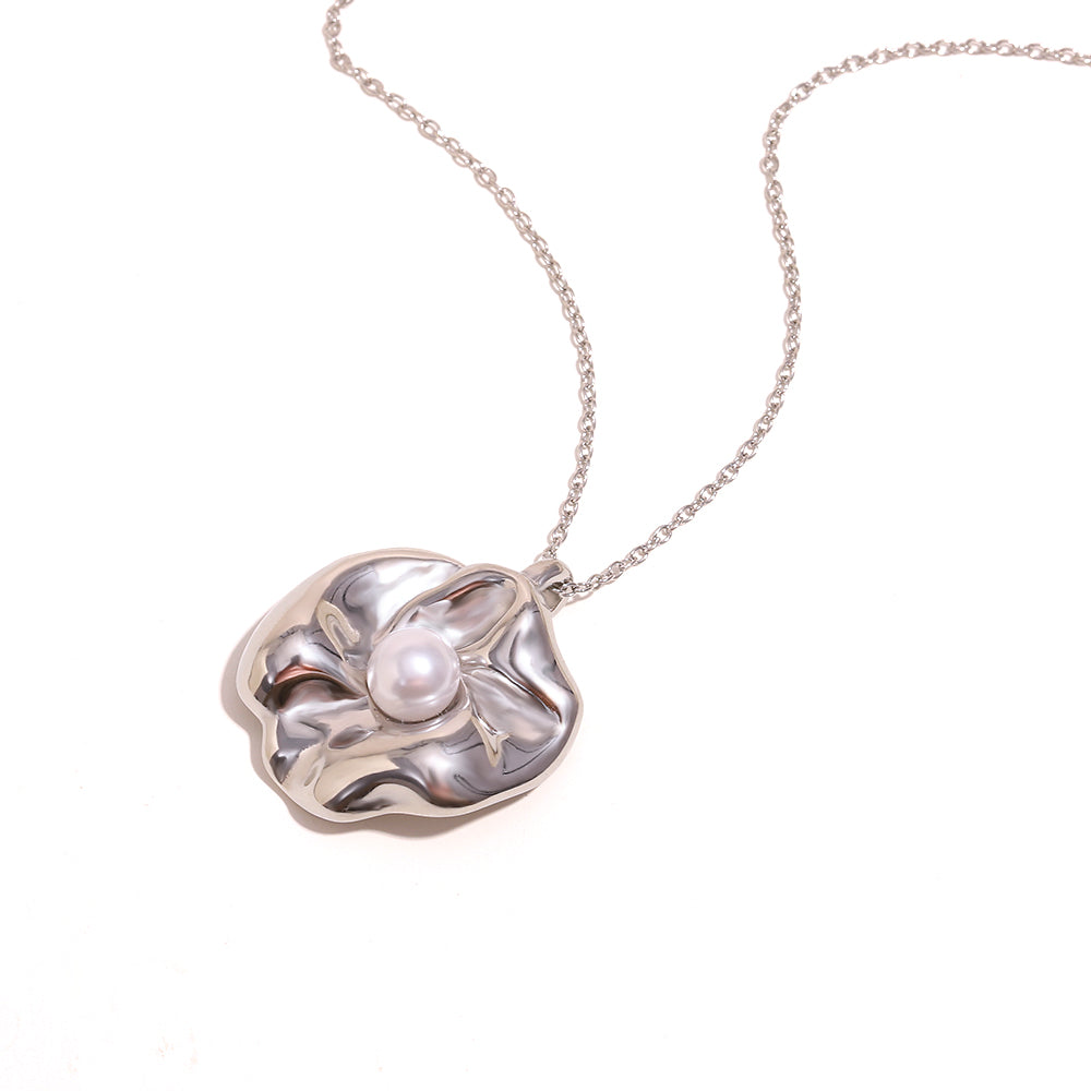 Dahlia’s Pearl necklace features a silver pendant with a pearl detail at the centre, set on a fine, elegant chain. This necklace is a simple yet striking piece that adds a soft touch to any outfit.