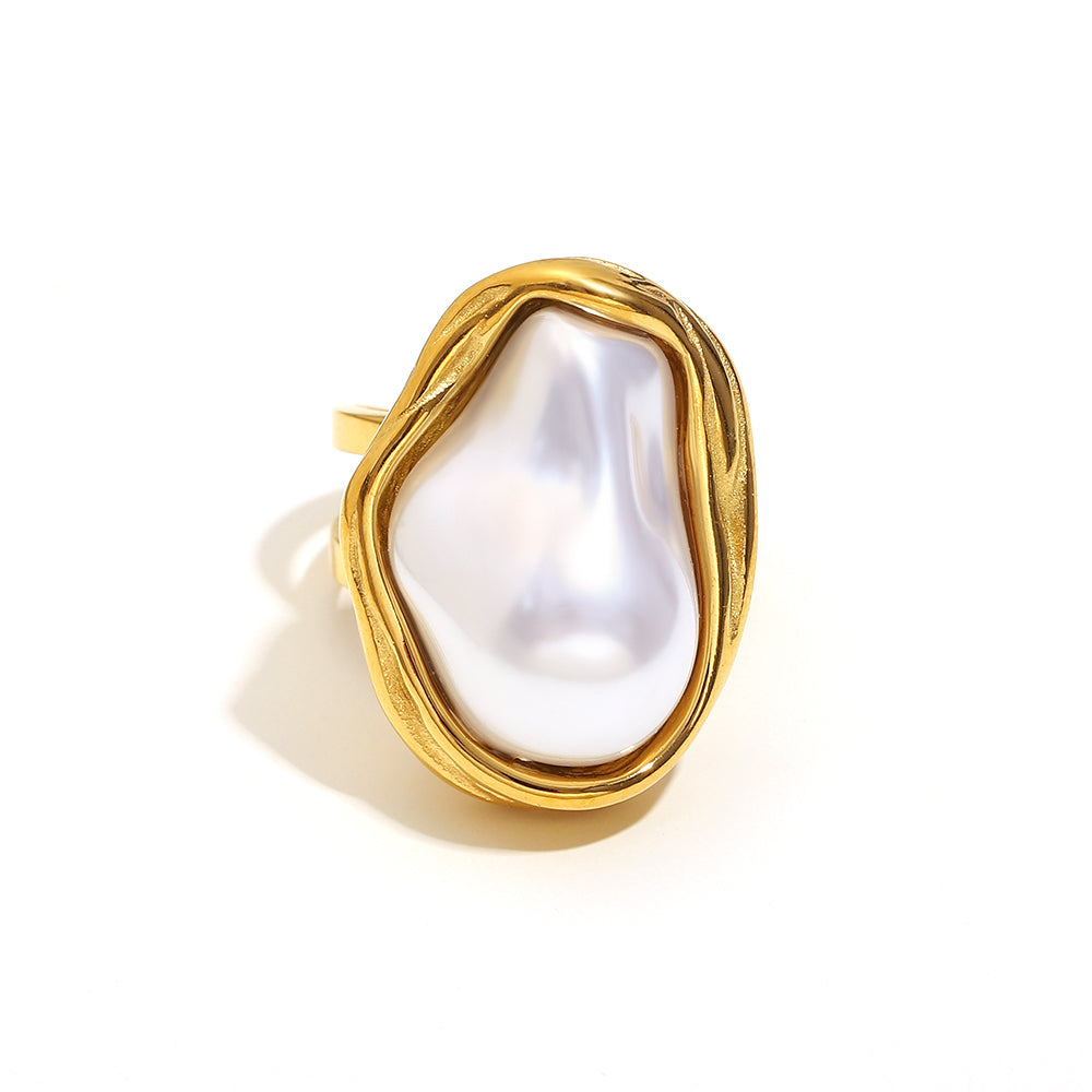 Daisy’s Pearl Ring is an adjustable gold ring featuring an natural, sculptural frame wrapped around a glossy oversized pearl.