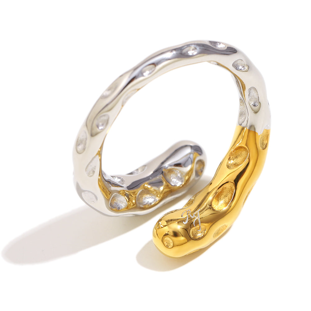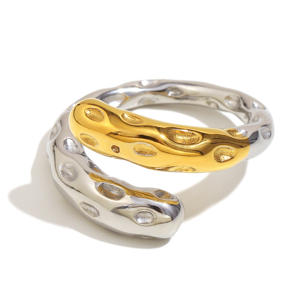 Daphne’s two tone ring is an open, textured ring that is half silver and half gold. This ring is perfect for someone who likes to mix metals or wants to start.