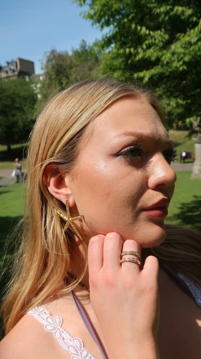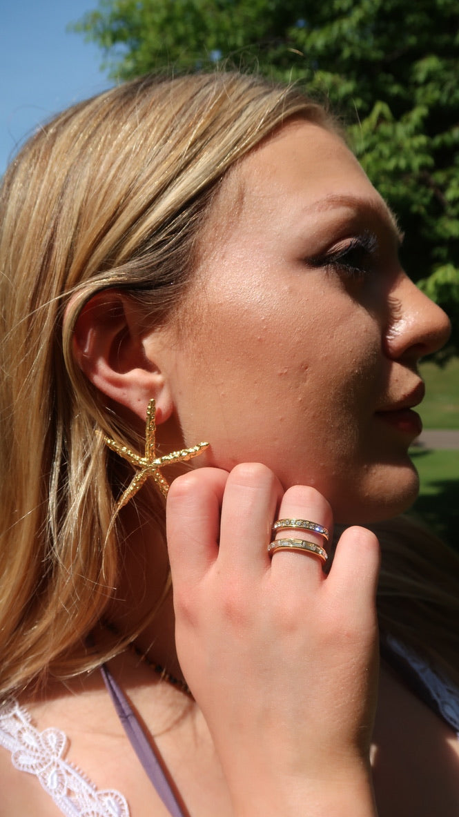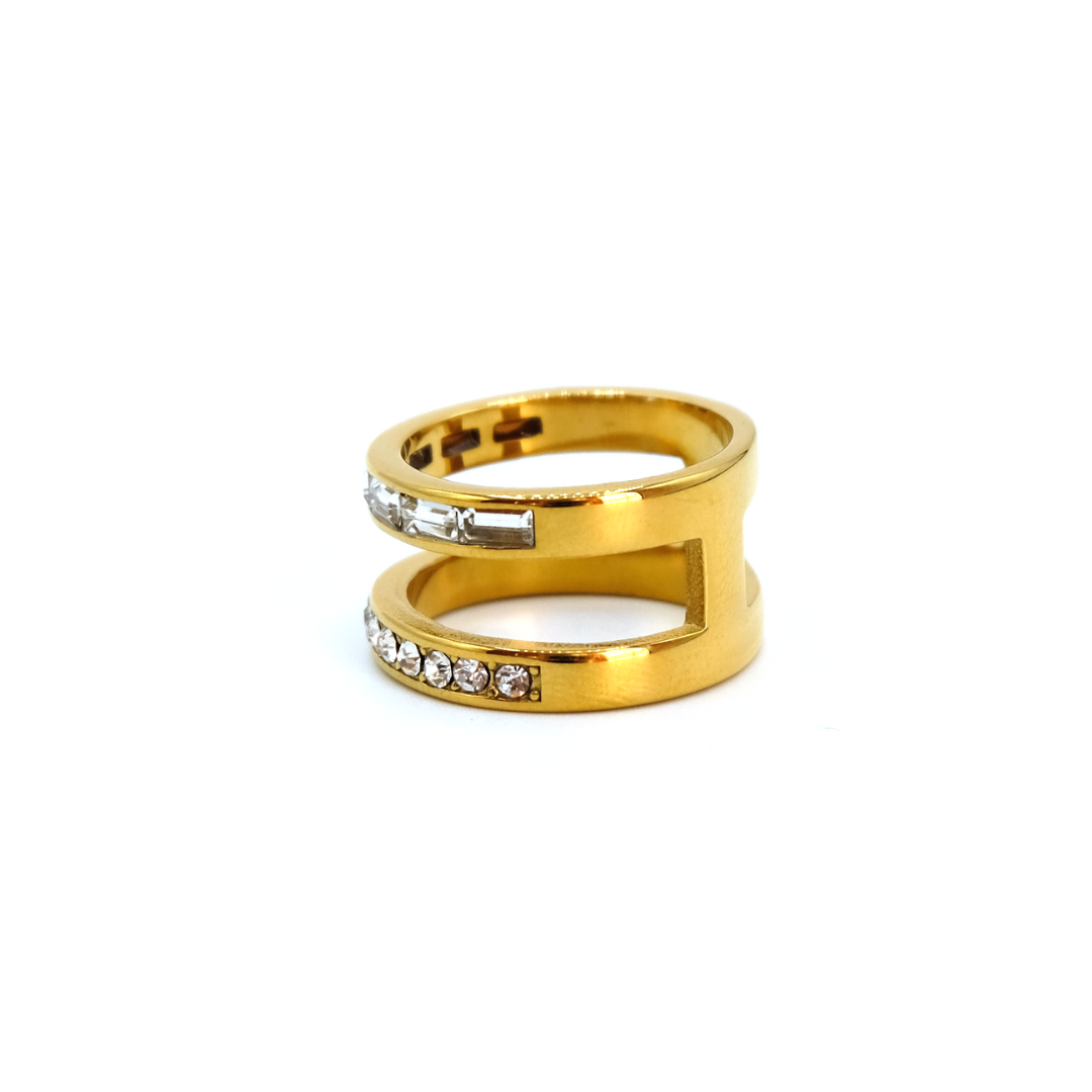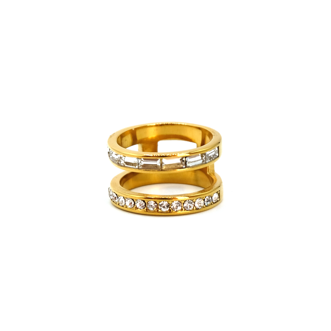 Daphne's white gemstone ring is a double-banded gold ring with rectangular and round gemstones. This is the perfect ring to add to a maximalist stack.