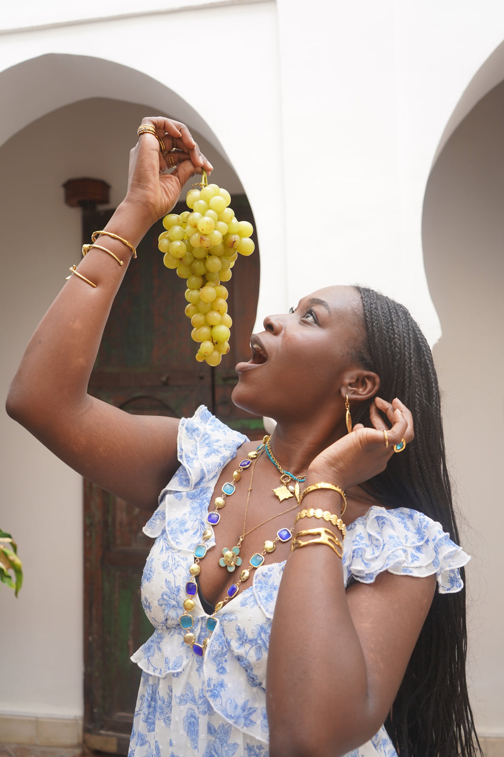 Diana's Sea Necklace is a long chain necklace made up of light blue and dark blue stones alternated with round gold-plated beads. This necklace can be worn long, double wrapped, or as a belt chain. This is the perfect bold, maximalist piece to elevate any look.