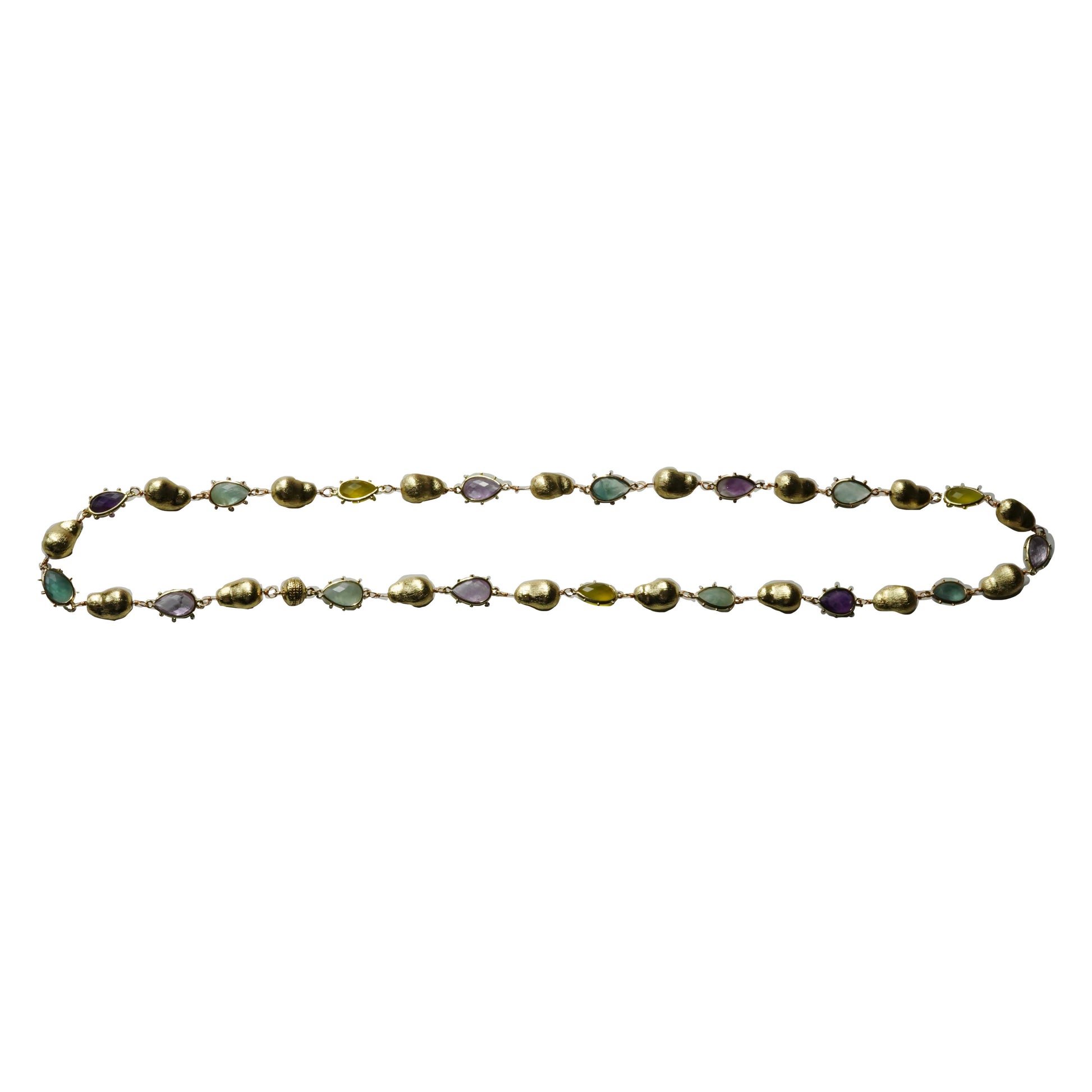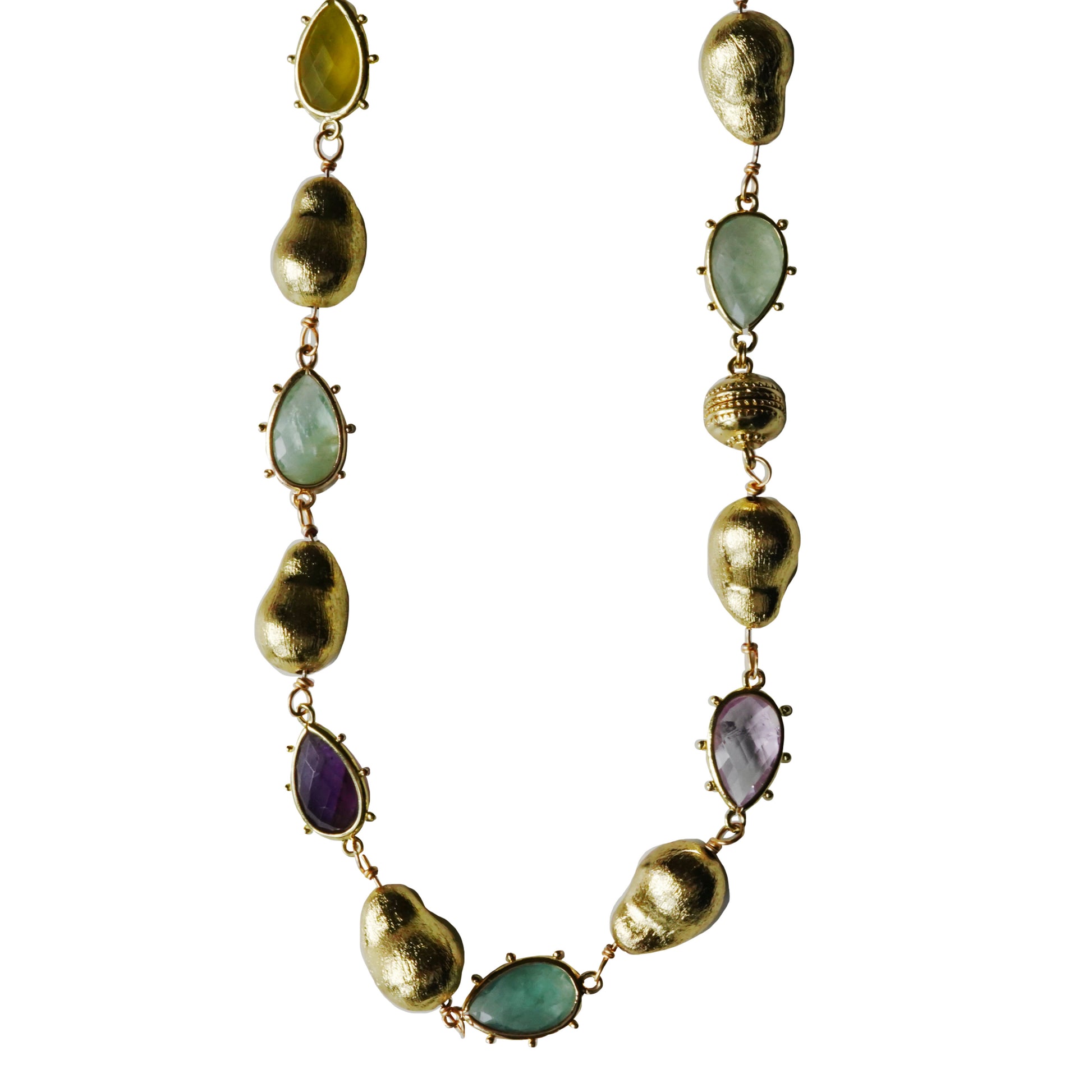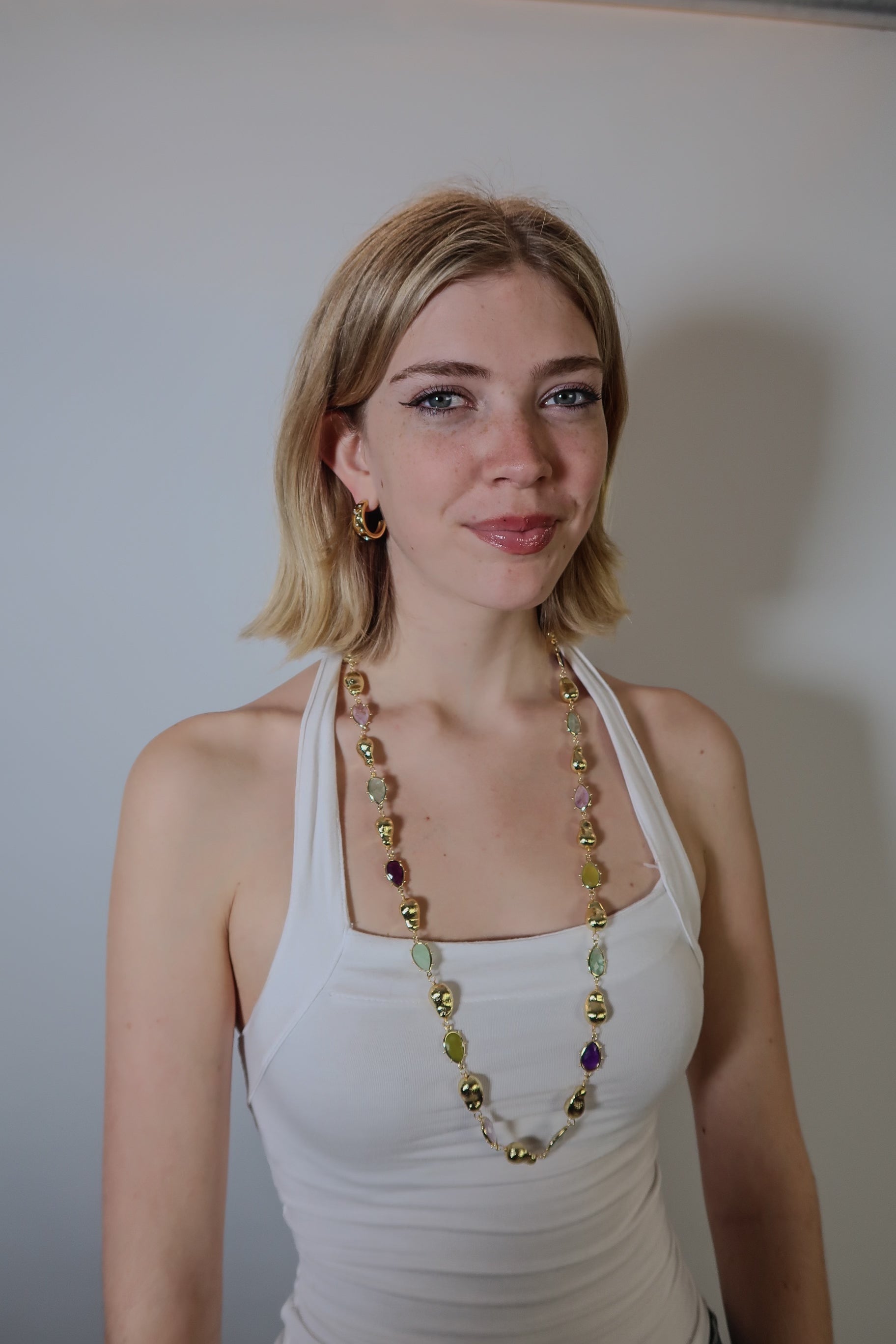 Diana's Winter Necklace is a long necklace made up of rich light purple, blue, and green stones alternated with round gold-plated beads. This necklace can be worn long, double wrapped, or as a belt chain. It can easily switch between these as it closes with a magnetic bead. This is the perfect bold, maximalist piece to elevate any look.