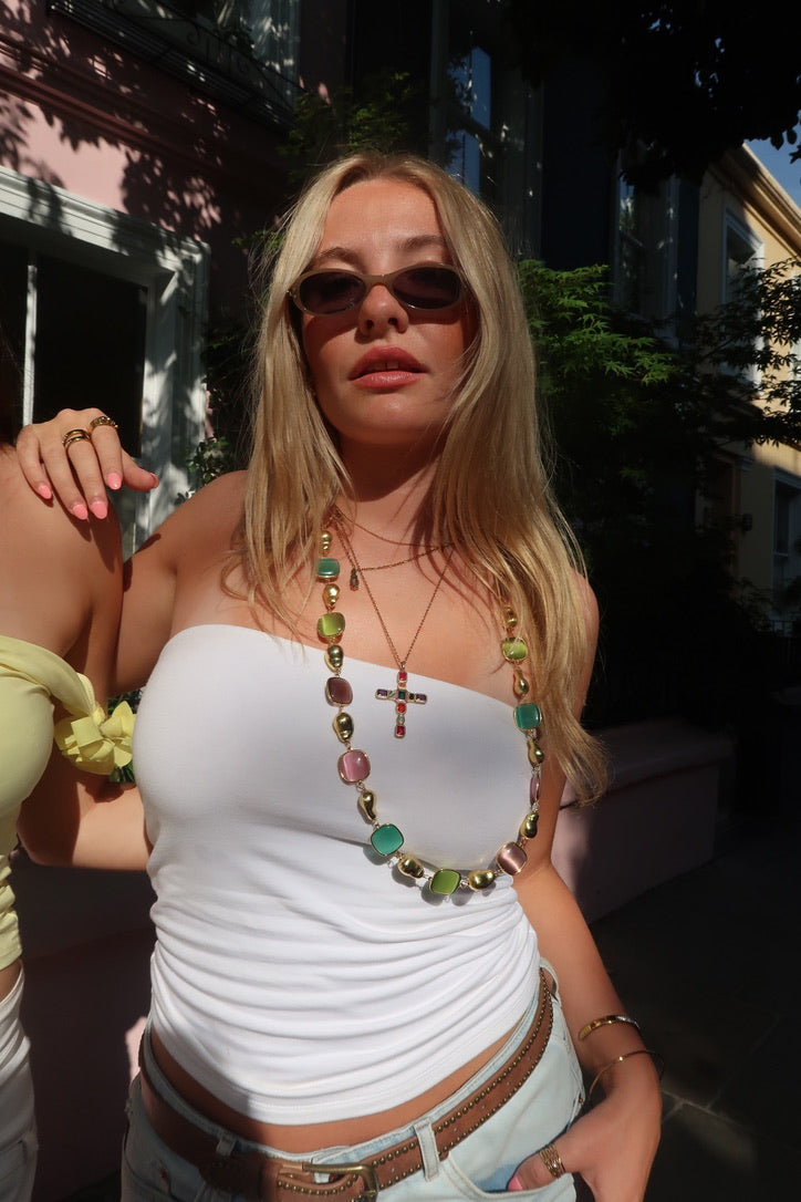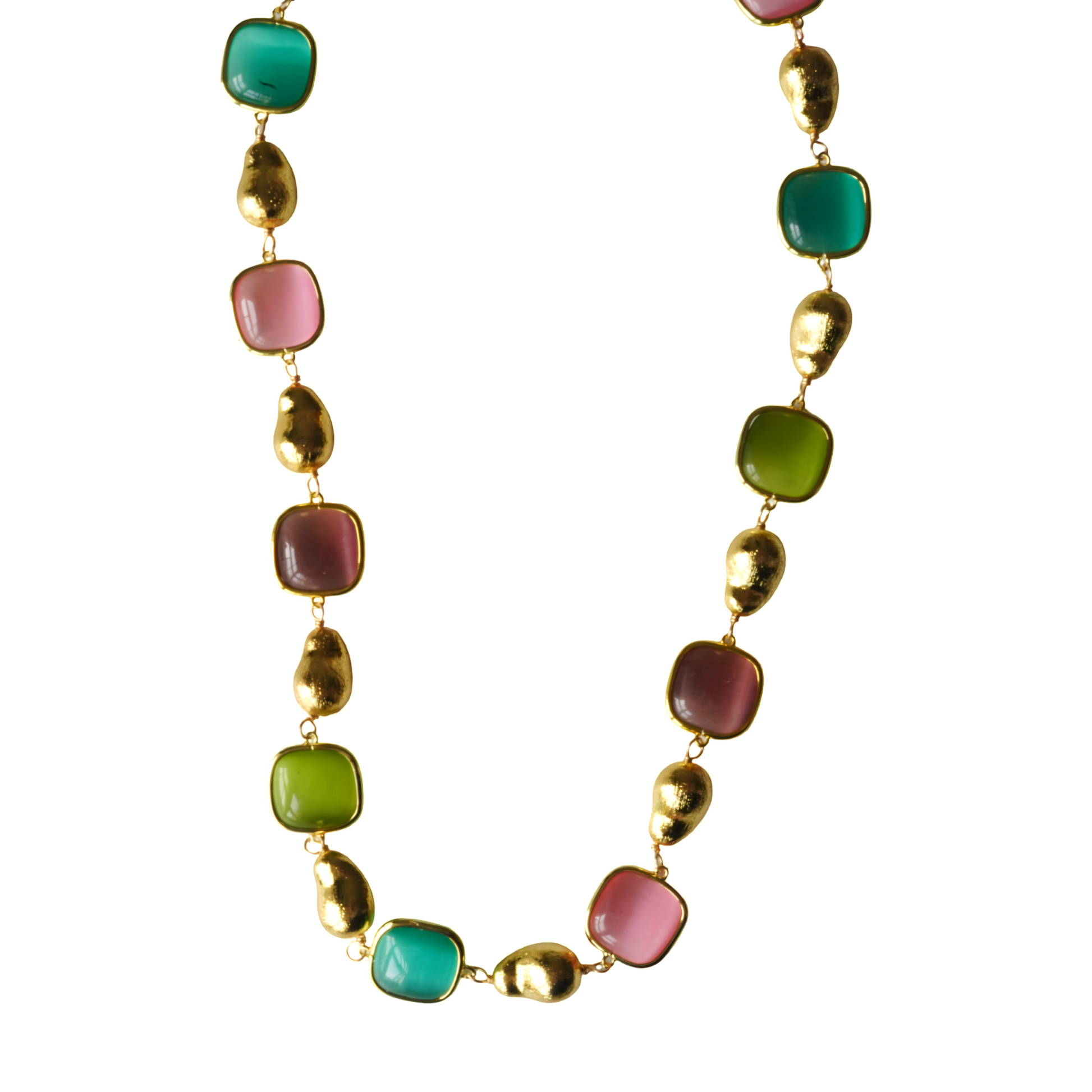 Diana's Summer Necklace is a long chain necklace made up of rich purple, pink, green, and blue stones, alternated with round gold-plated beads. This necklace can be worn long, double wrapped, or as a belt chain. This is the perfect bold, maximalist piece to elevate any look.