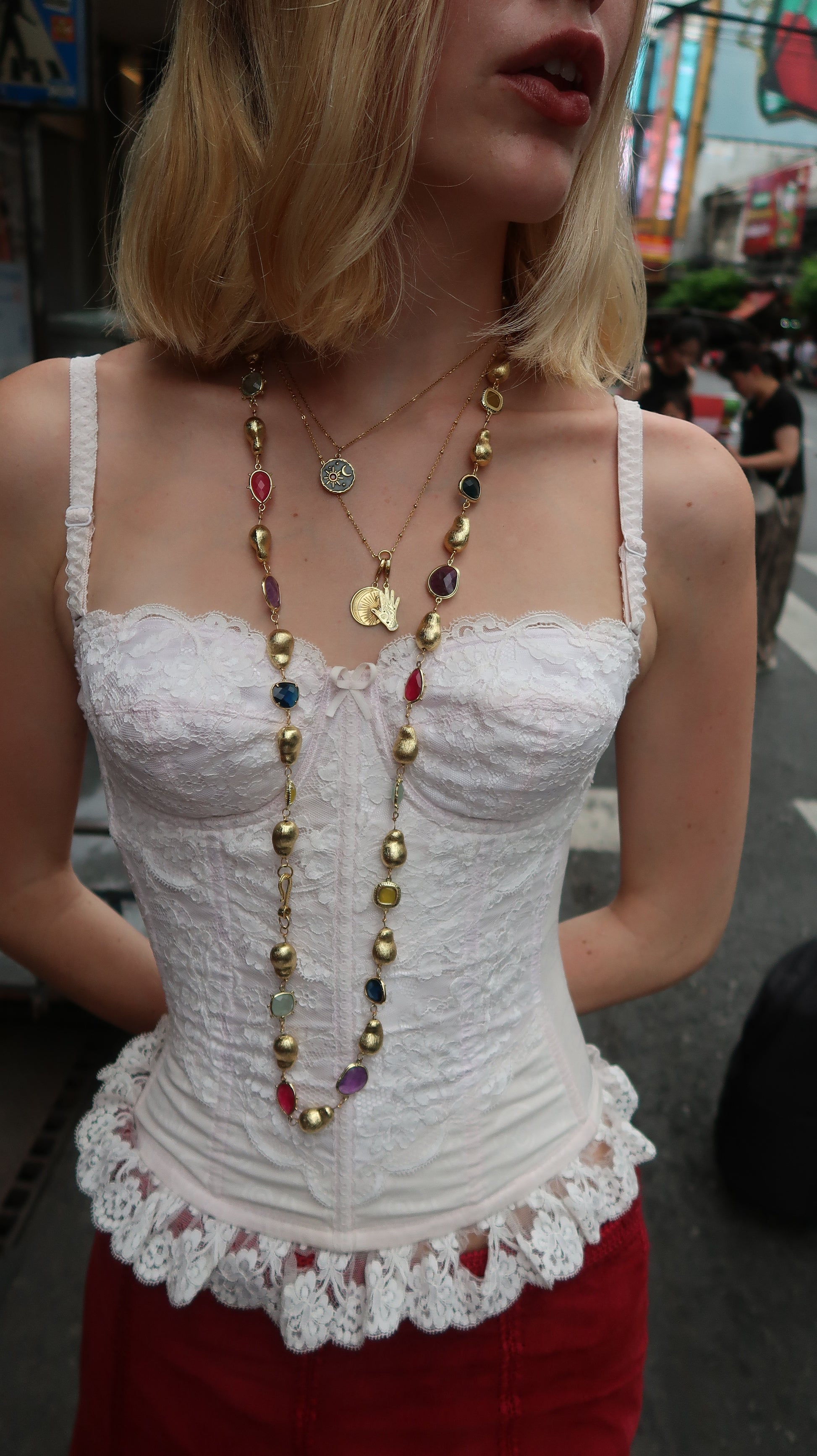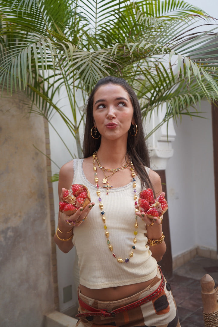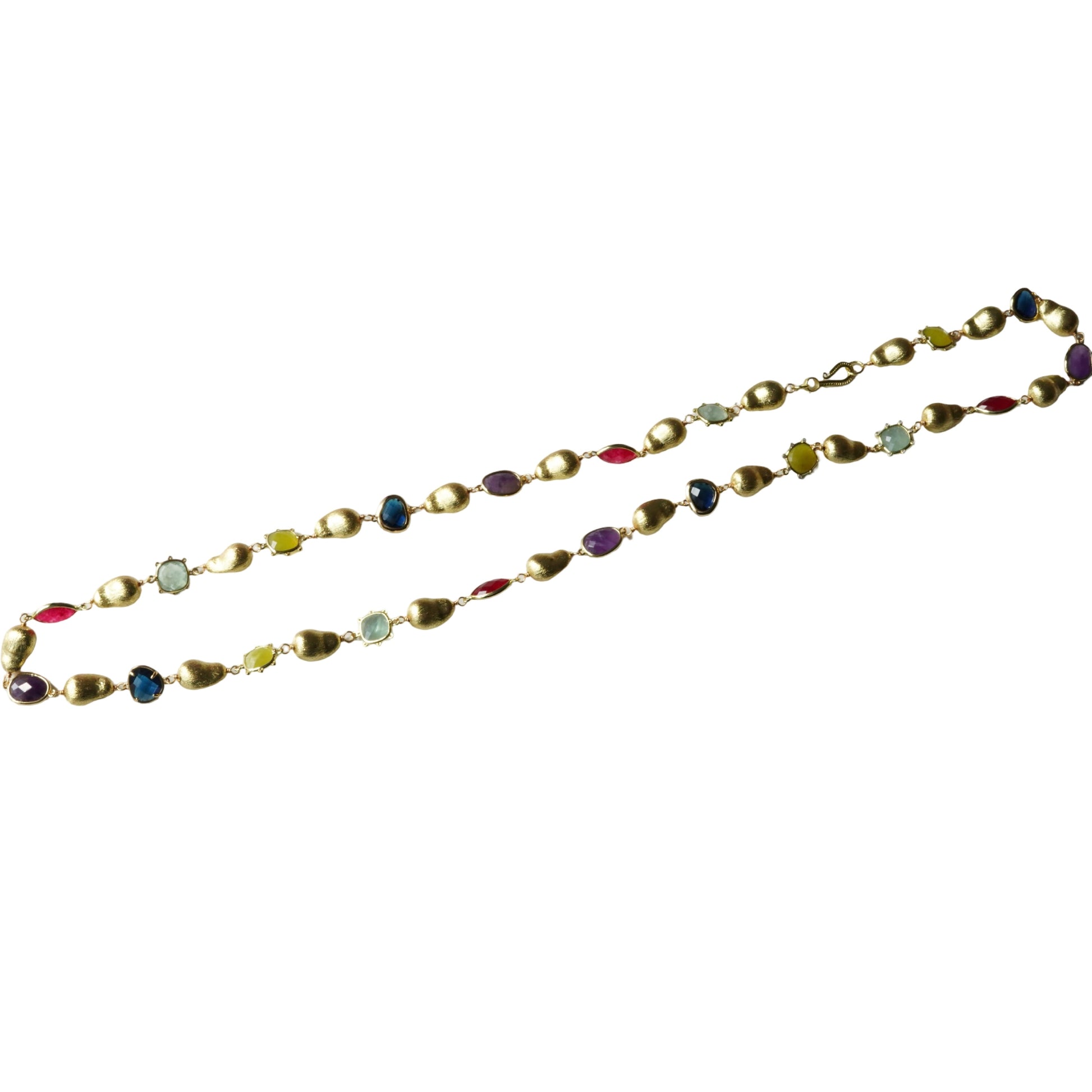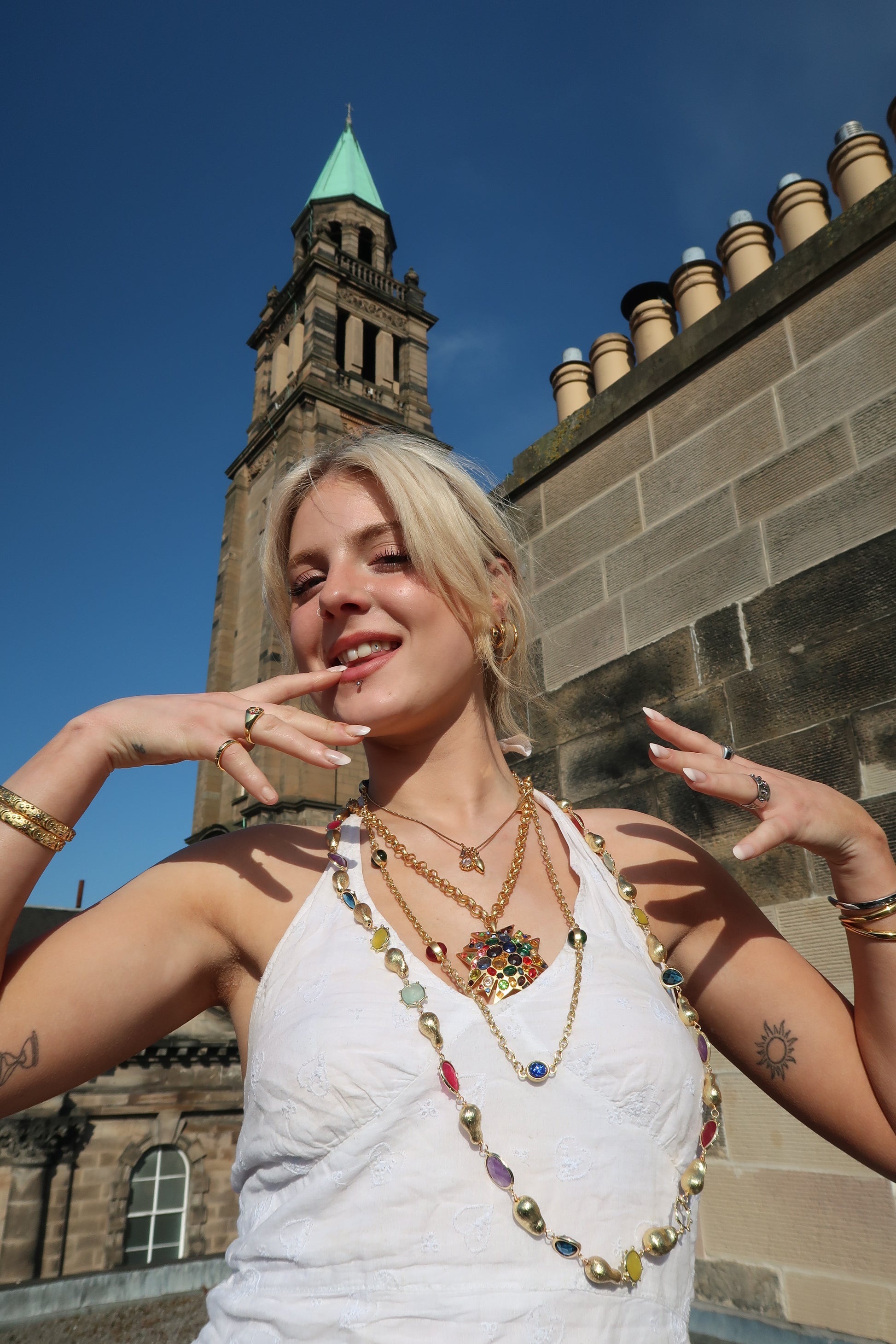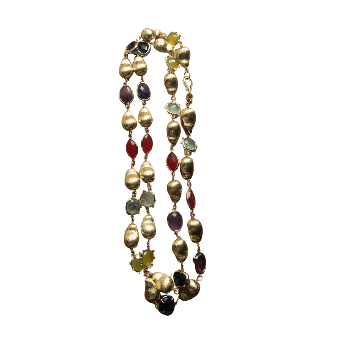Diana's Necklace is a long chain necklace made up of rich purple, red, green, and blue stones, alternated with round gold-plated beads. This necklace can be worn long, double wrapped, or as a belt chain. This is the perfect bold, maximalist piece to elevate any look.