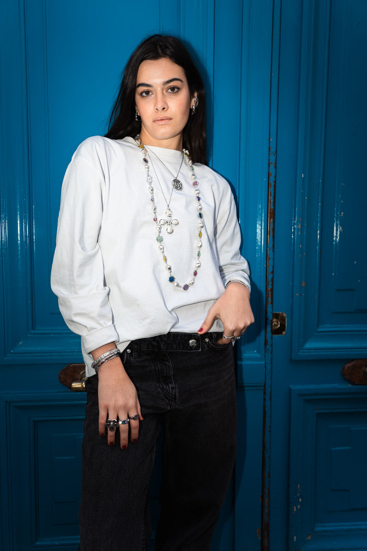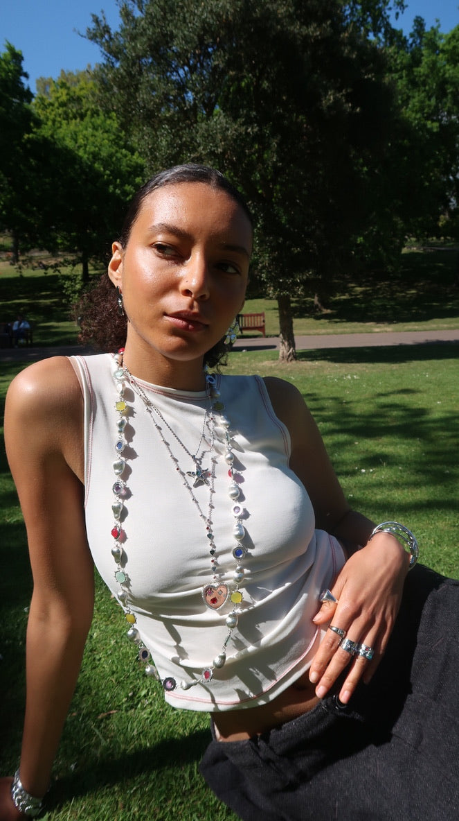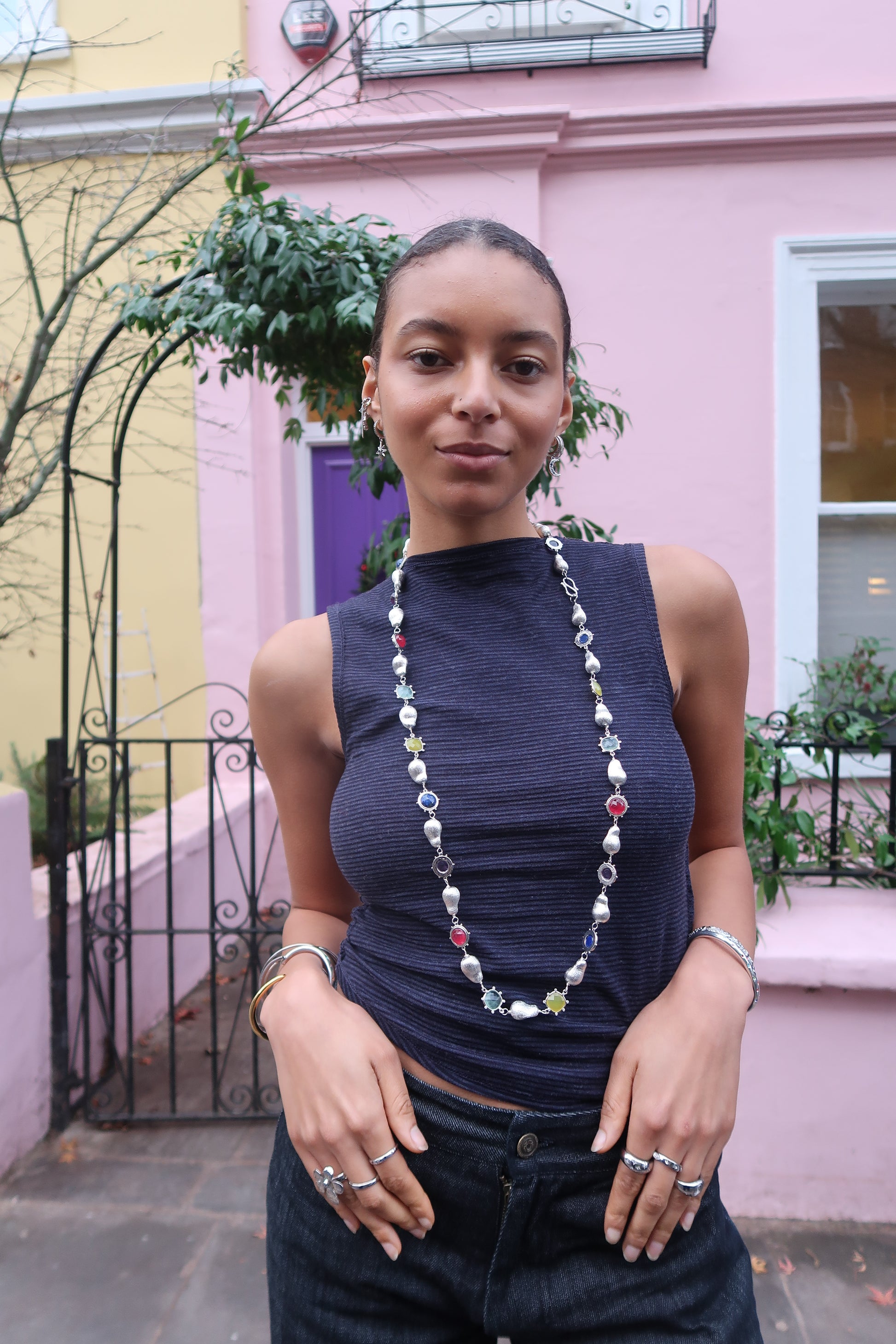 A 39" (99cm) versatile necklace featuring 13x19mm white gold-plated brushed beads and 16mm square-cut gemstones: amethyst, green and blue fluorite, lemon quartz, and red jade. Wear it as a long necklace, double-wrapped, or as a belt chain for an elegant touch.