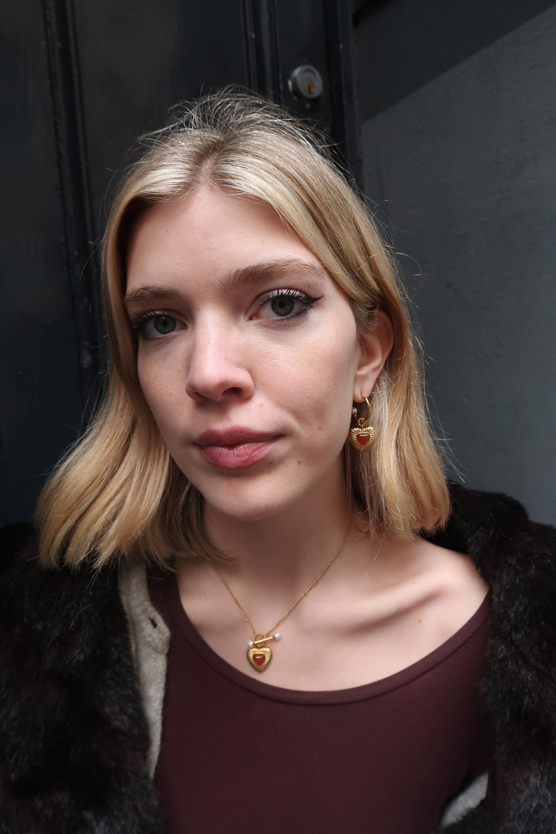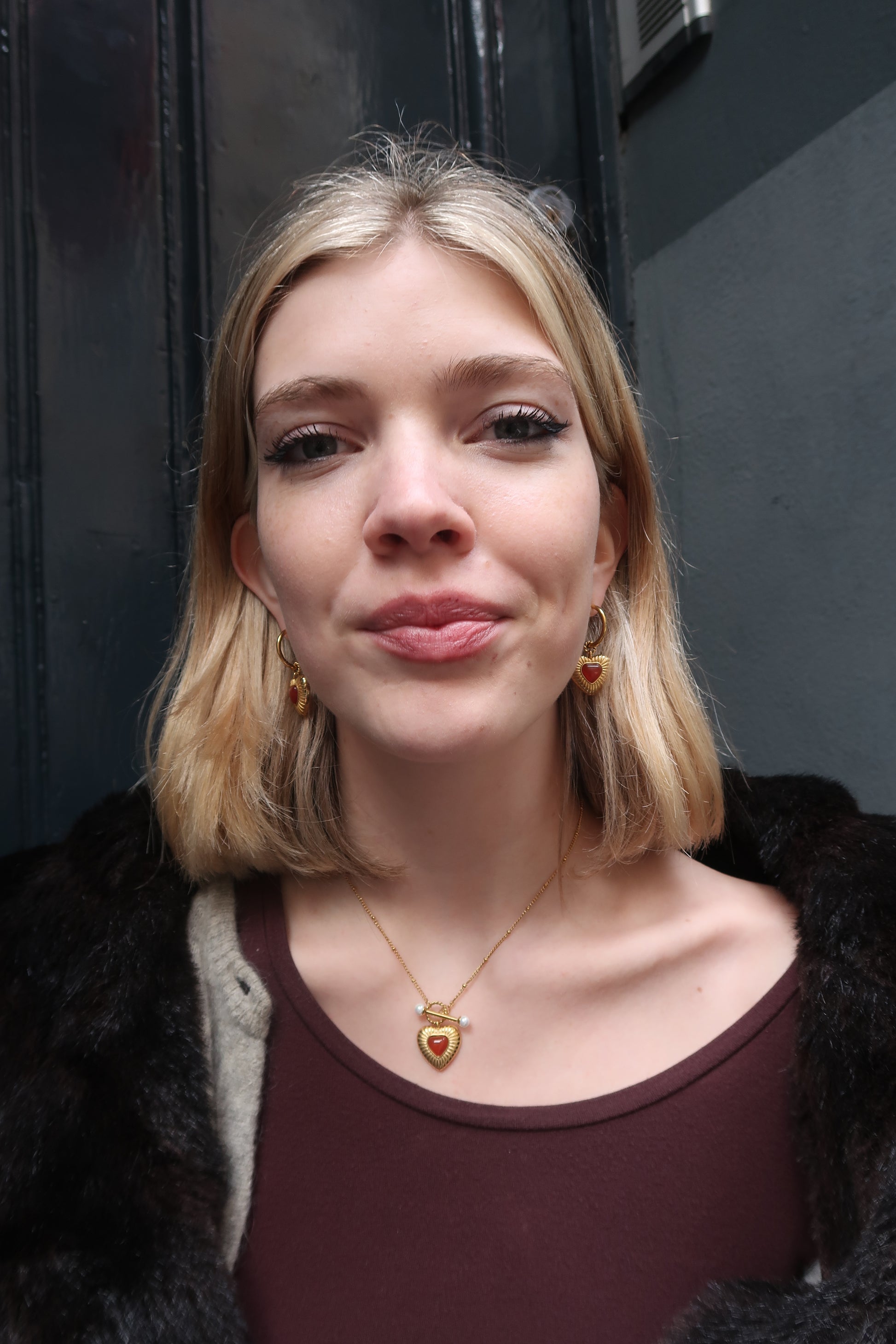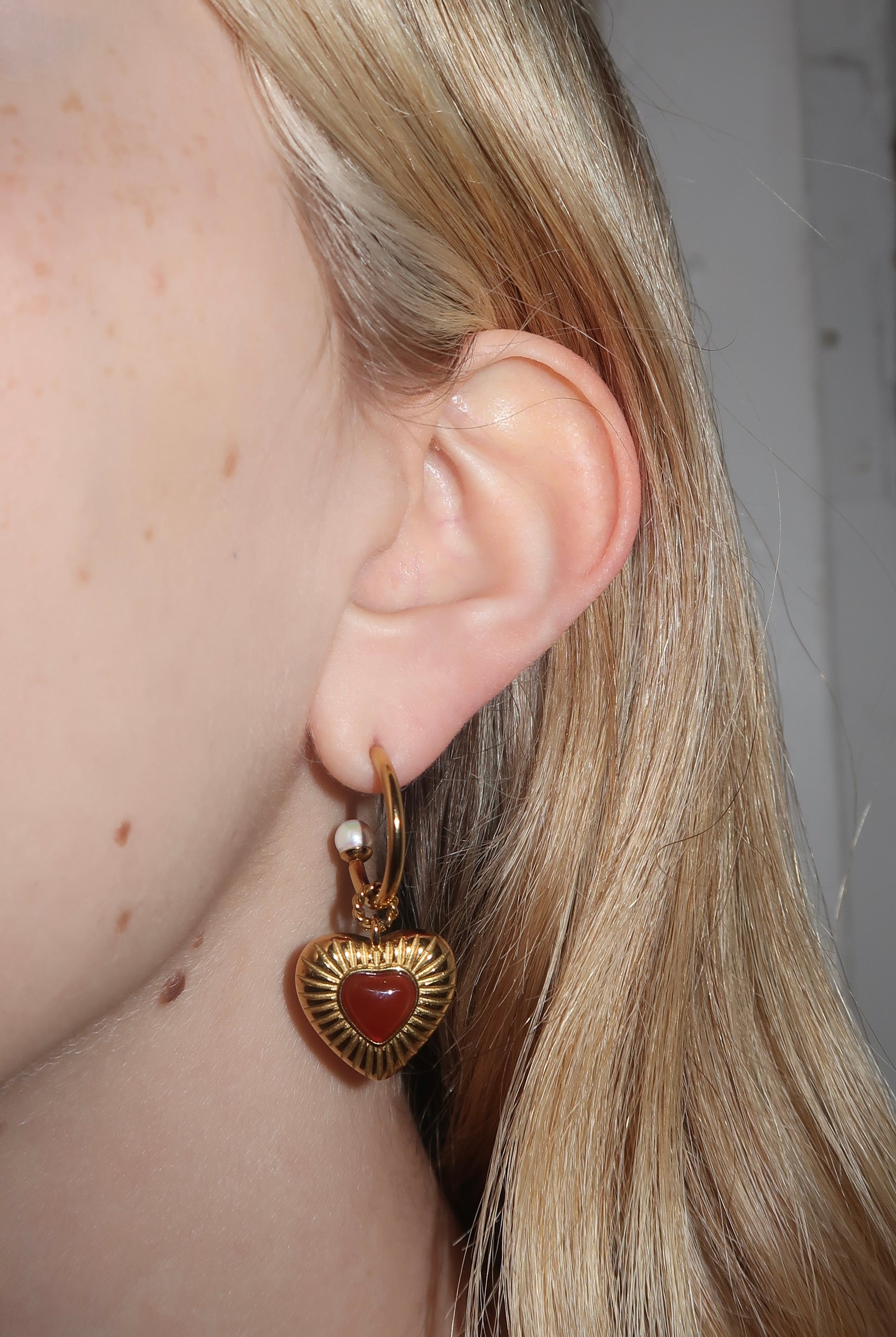 Dolly's Earrings are gold hoop earrings with radiant gold heart-shaped charms with intricate sunburst detailing and vibrant red and pearl accents.