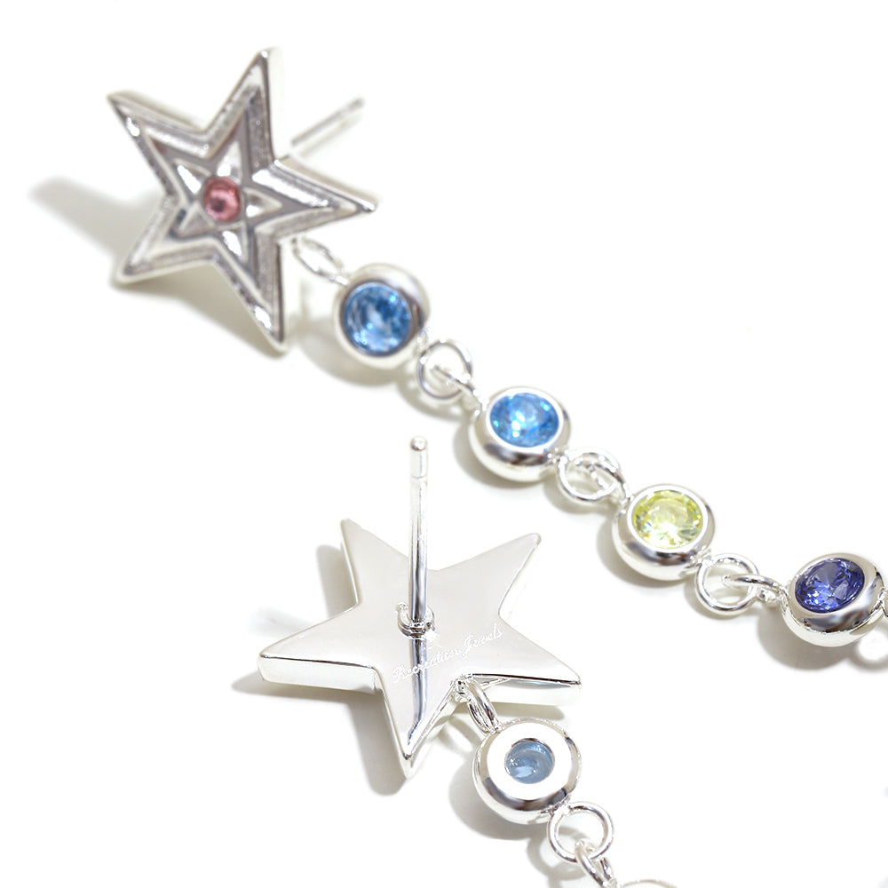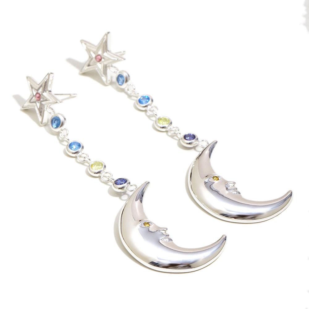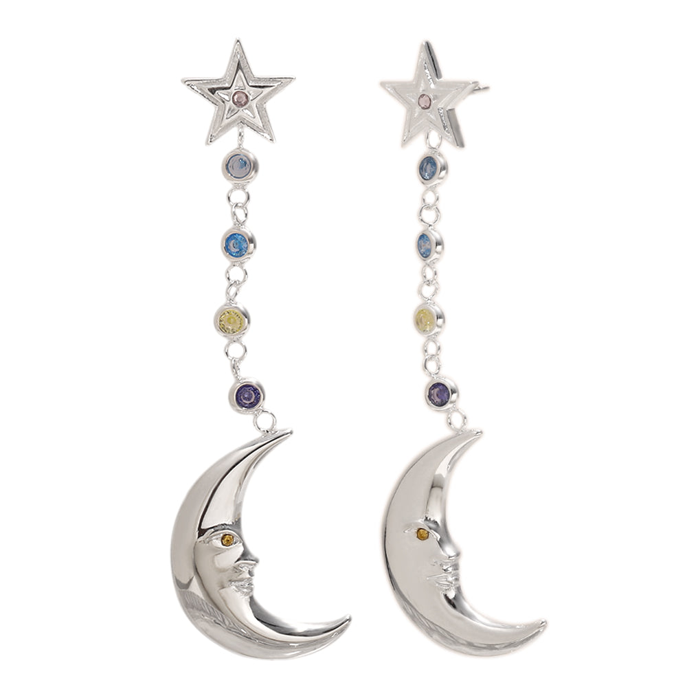 Eleanora's Star and Moon Drop Earrings are star shaped stud earrings with four gemstones and crescent moons dangling below. These enchanting earrings are the perfect statement piece to elevate any look.