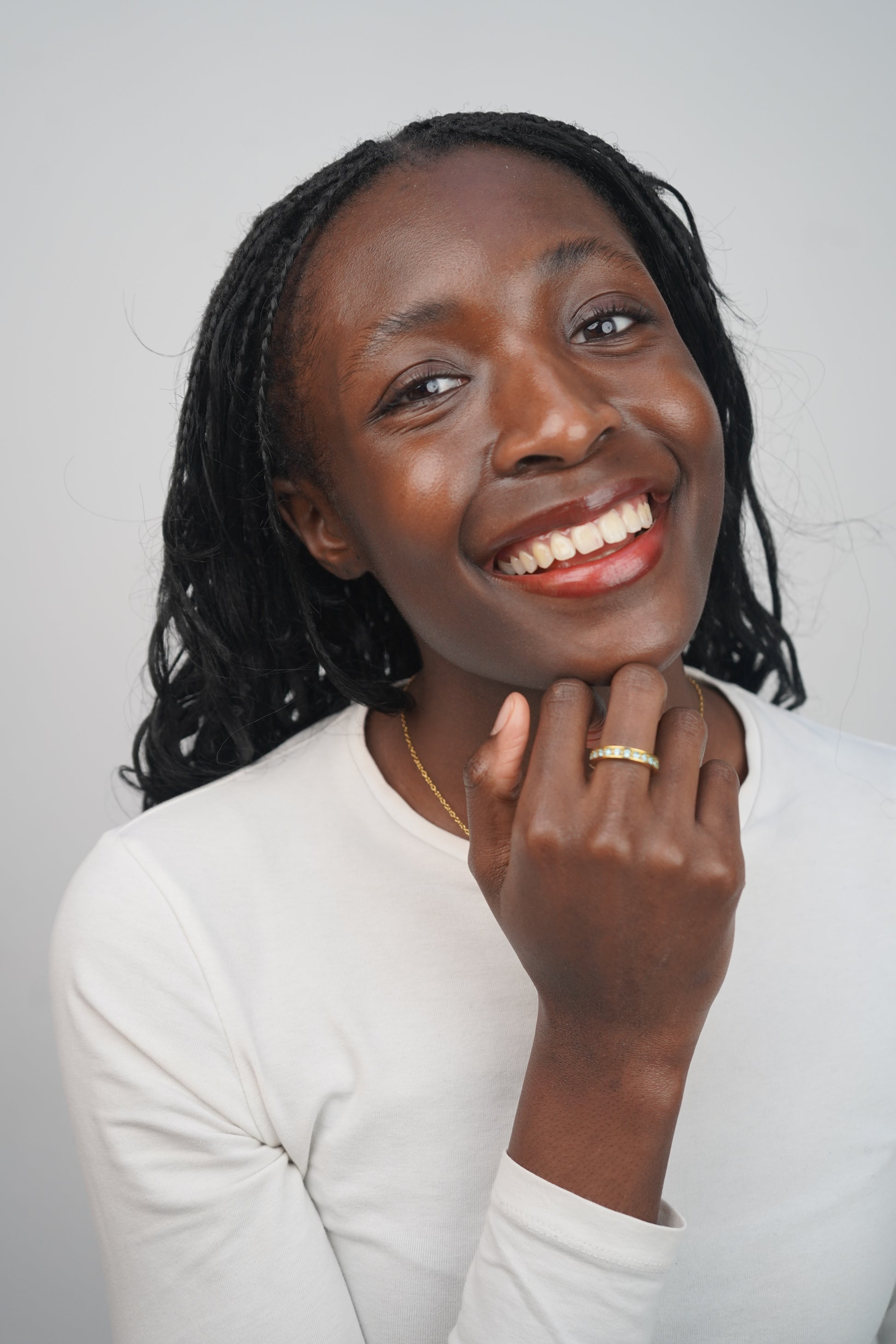 Elise’s blue ring is a thin gold band covered in bright blue gemstones. This is the perfect ring to add to any stack.