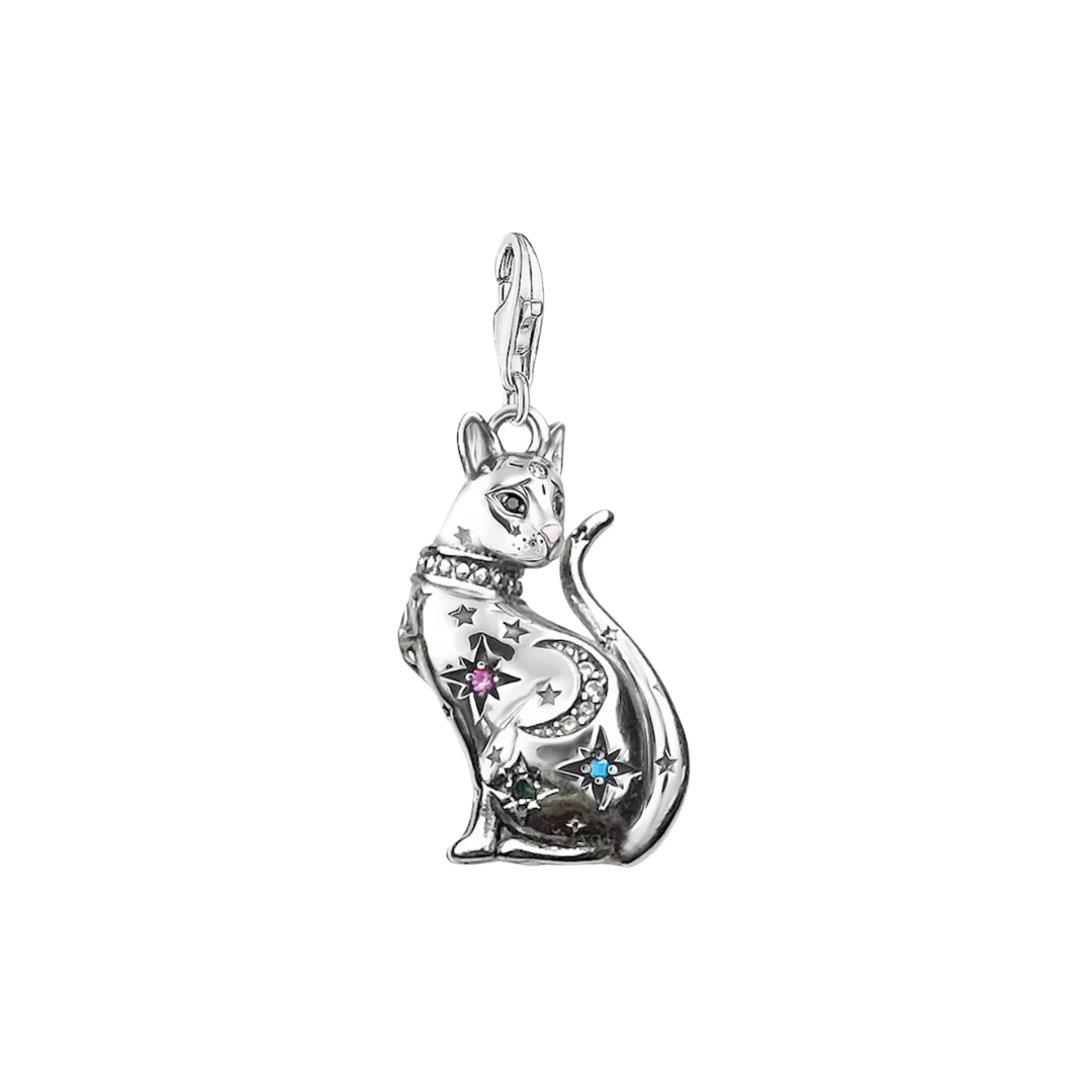Elizabeth’s superpower cat necklace is a small cat shaped pendant necklace accented with blue, pink, and white gemstones in moon and star shapes. This pendant is perfect for layering with other pendants.